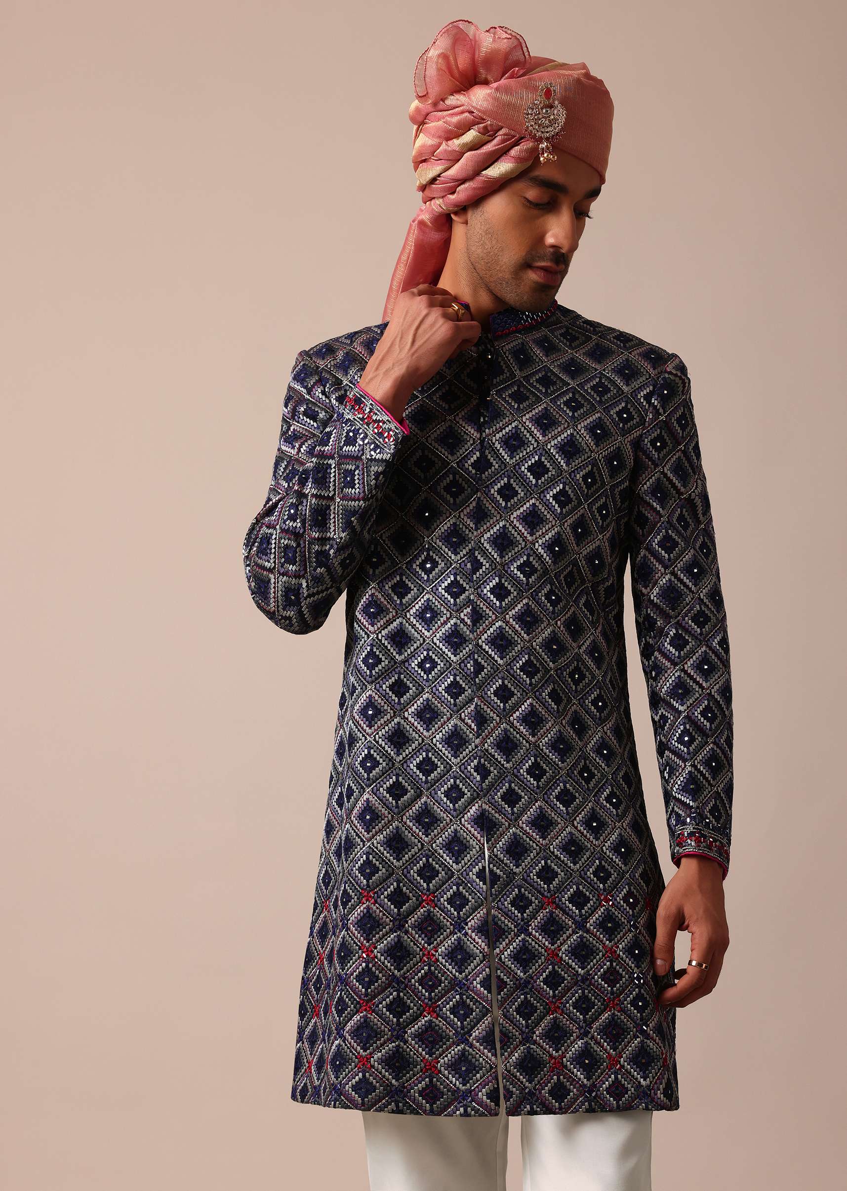 Royal Blue Silk Sherwani With Intricate Neckline Embroidery