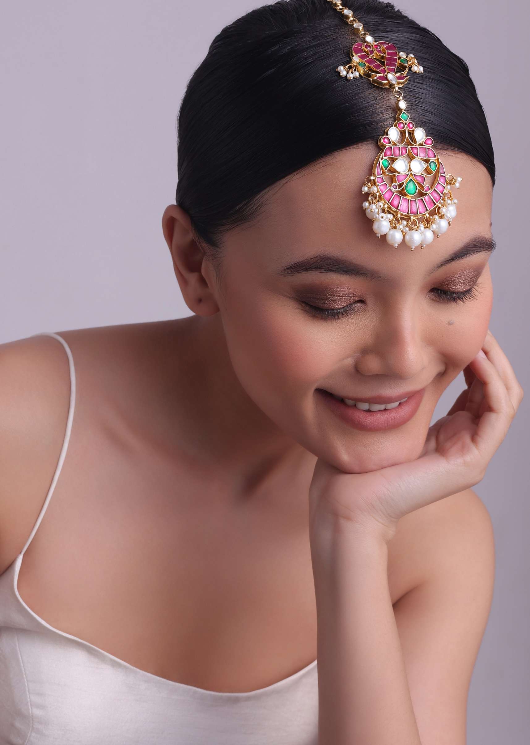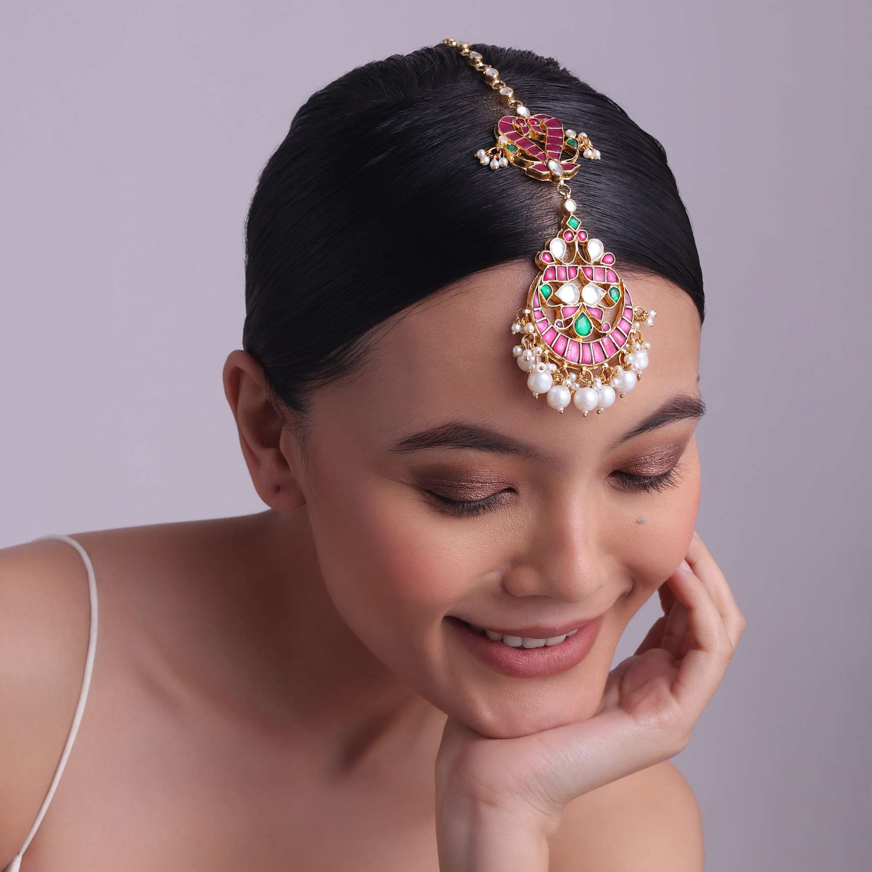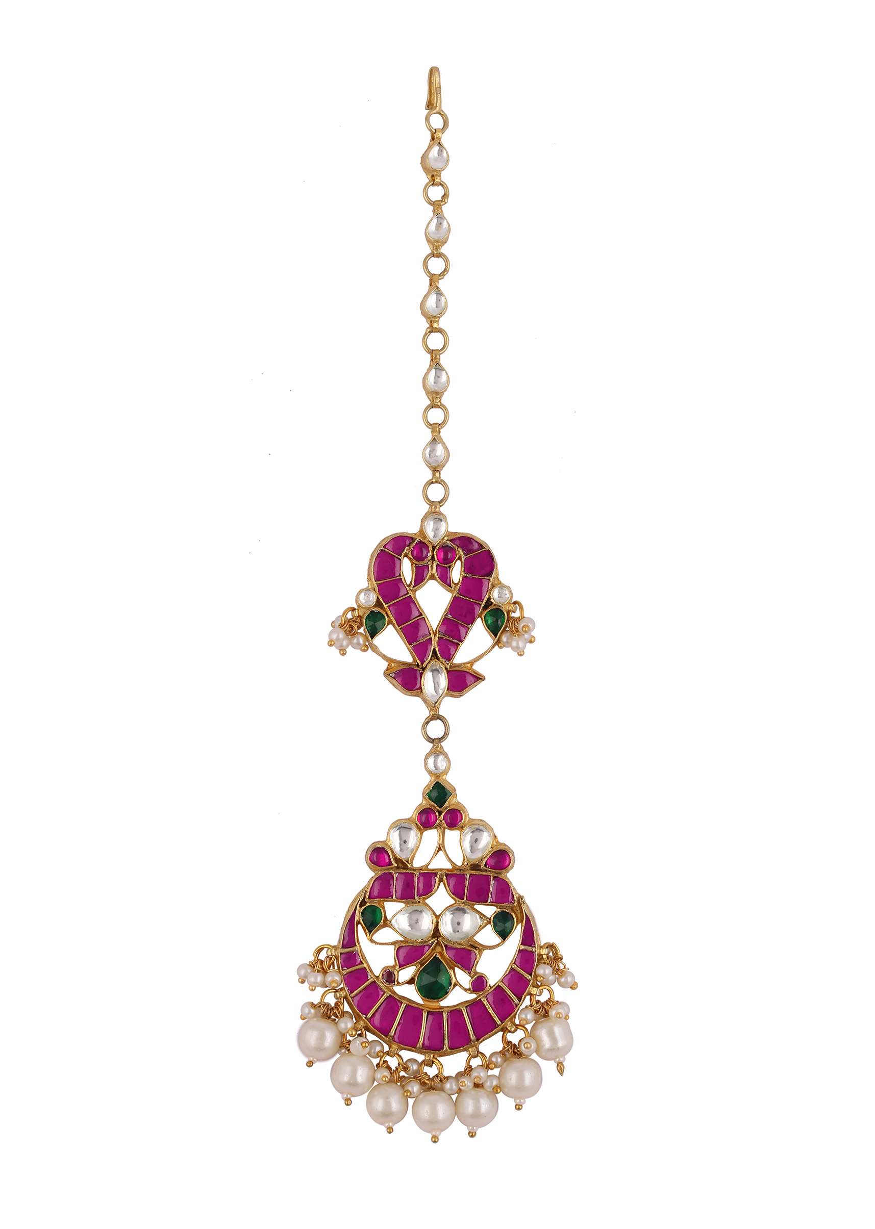 An enigmatic maangtikka with gold finish kundan, pearls and ruby stones. Made with intricate detailing and craftsmanship. Handcrafted using best quality material. The jewellery piece is polished and anti-tarnish. Avoid... More Product Details