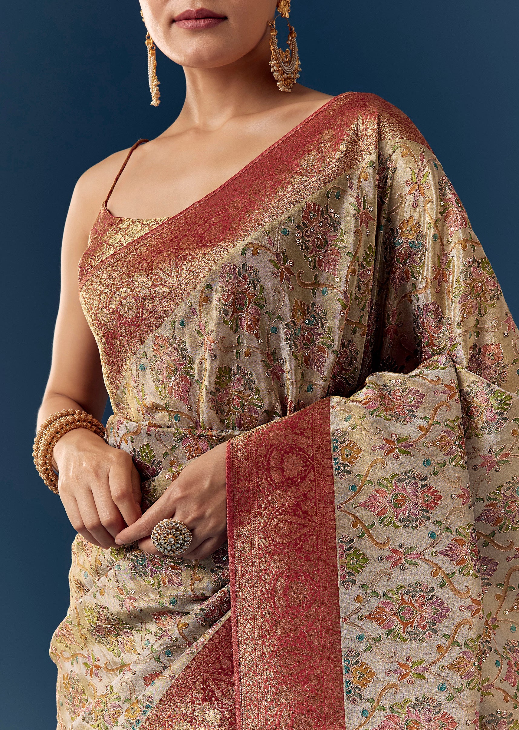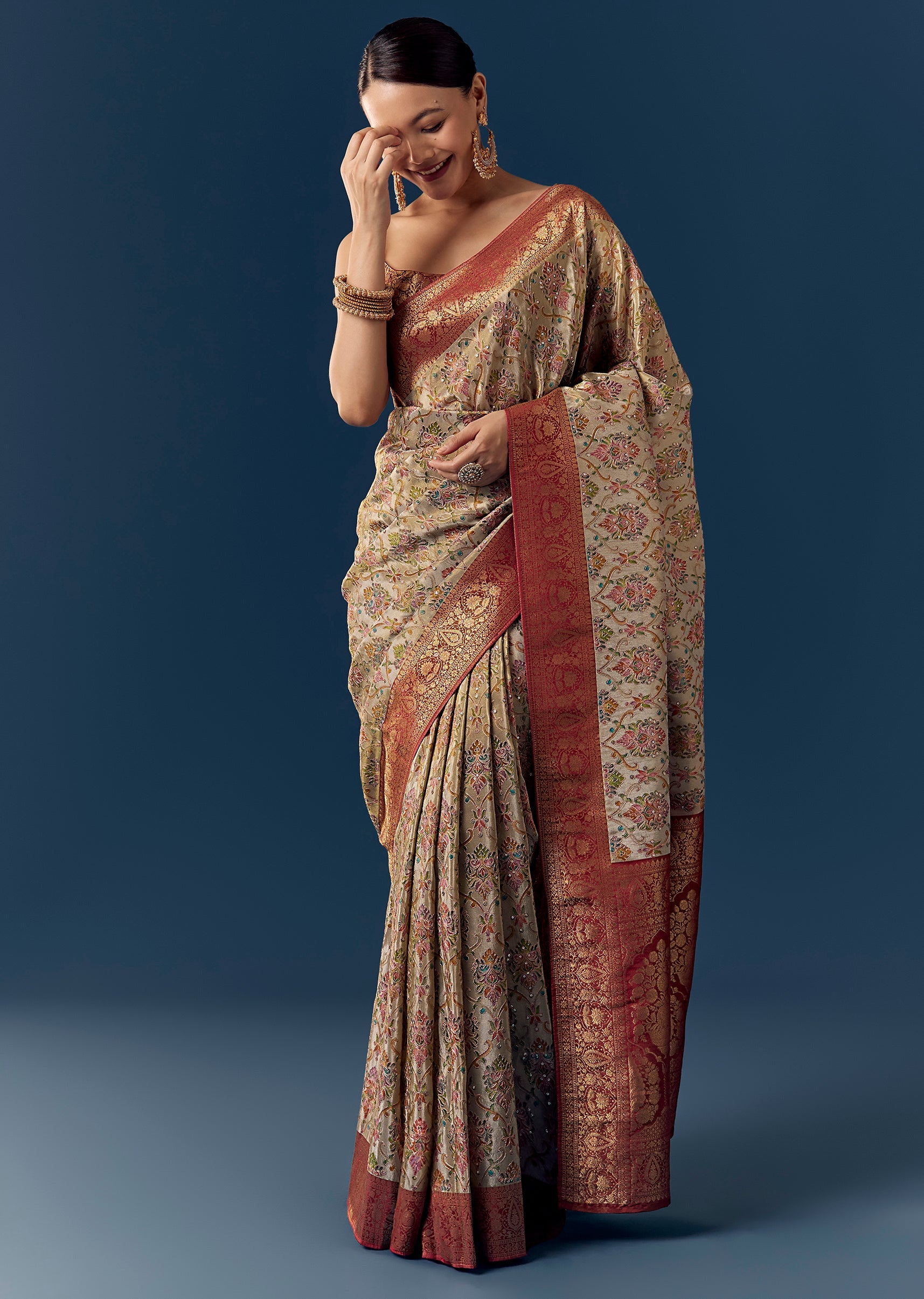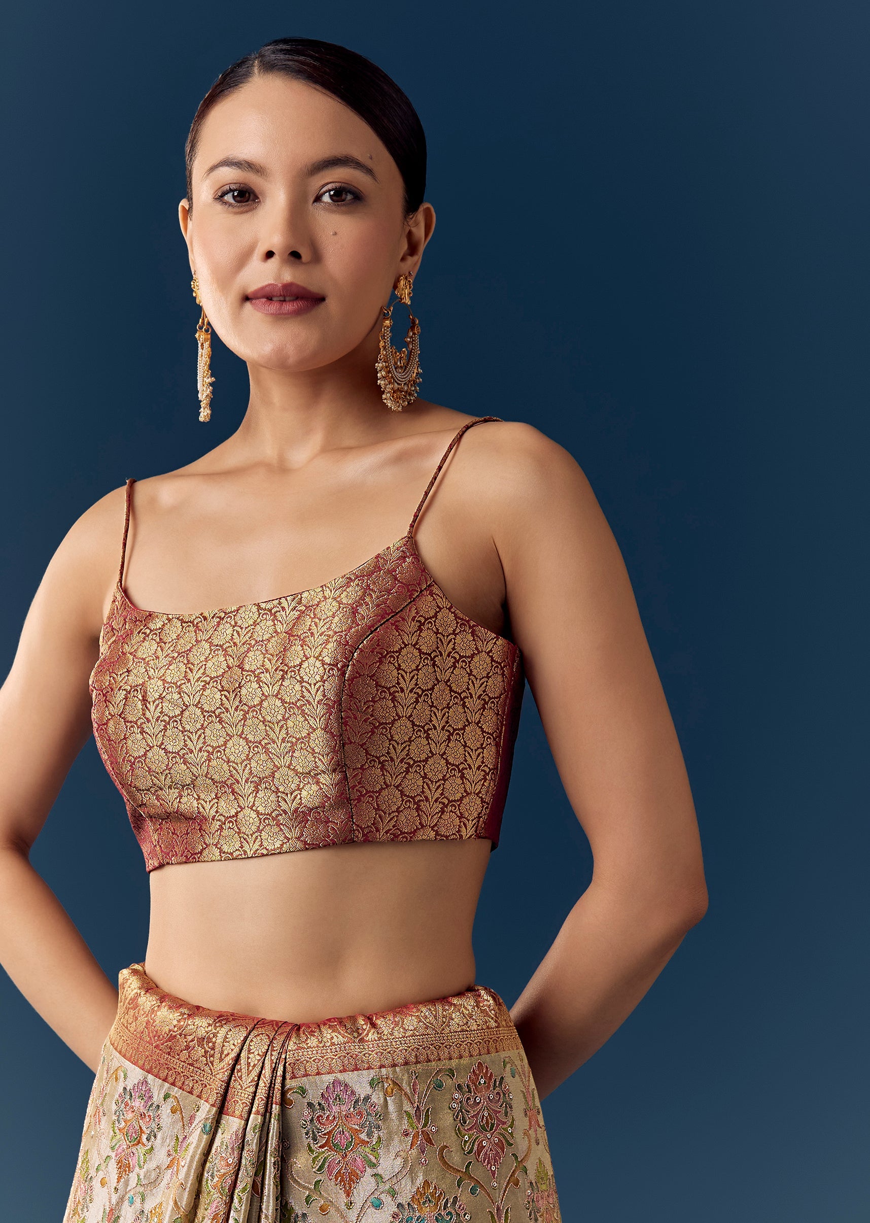 Rust Beige Floral Woven Saree with Contrast Brocade Blouse