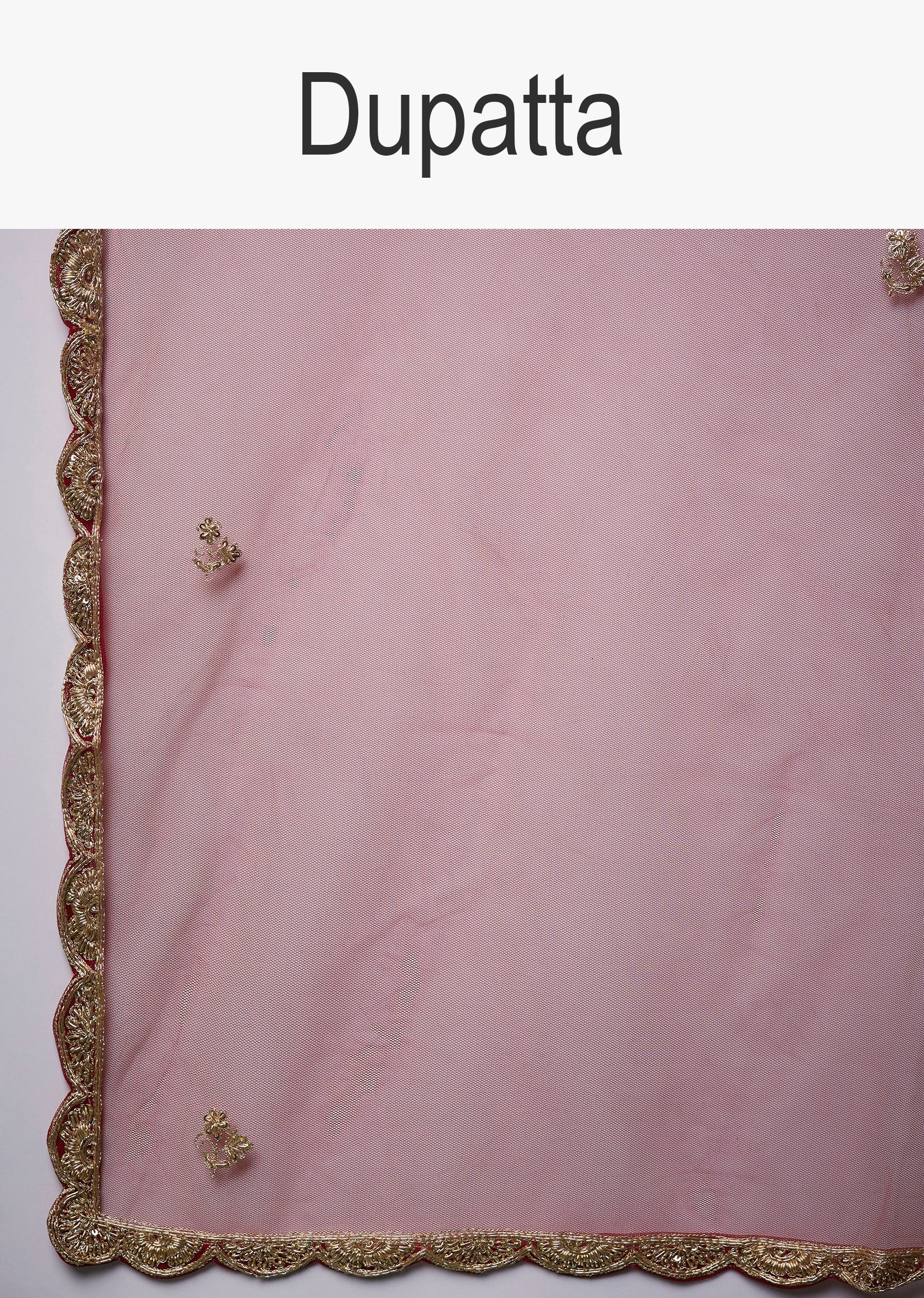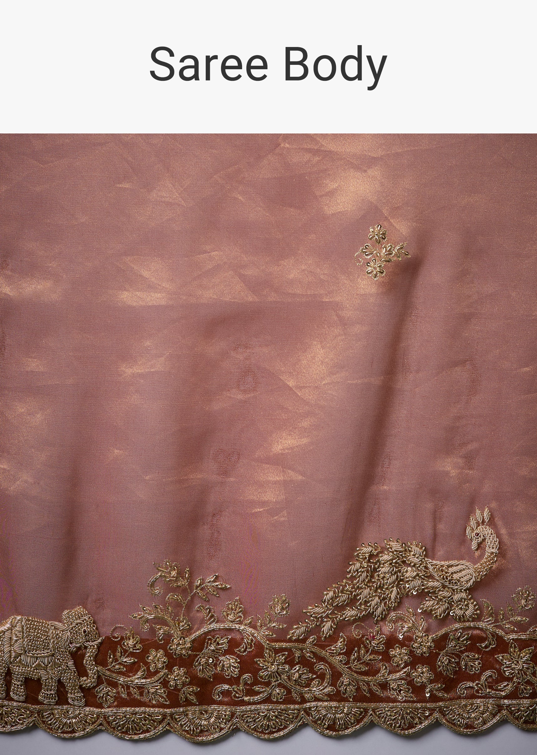 Bridal artistry comes alive in this organza silk saree, adorned with a richly embroidered scallop border and intricate detailing on the blouse featuring zardosi and zari work. Traditional motifs including elephants, peacocks, and florals are embroidered all over the drape, adding depth and cultural elegance, while the matching scallop embroidered dupatta completes the ensemble with a regal touch. The set includes one saree, one unstitched blouse fabric, making it perfect for weddings and grand celebrations. Awarded as the Most Trusted Brand, we're delivering styles you love, just as promised. Please note: The dupatta shown is for imagery purposes only and is not part of the product.