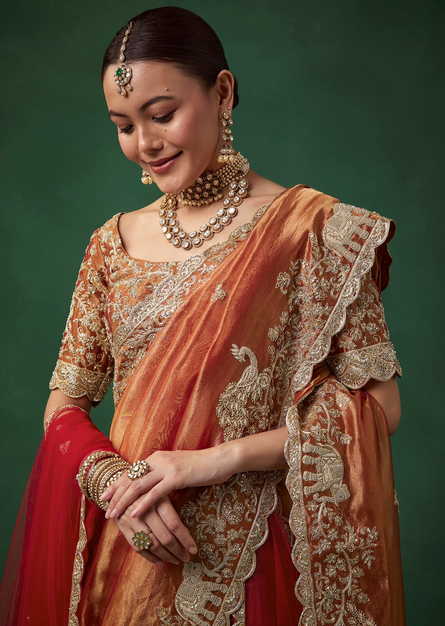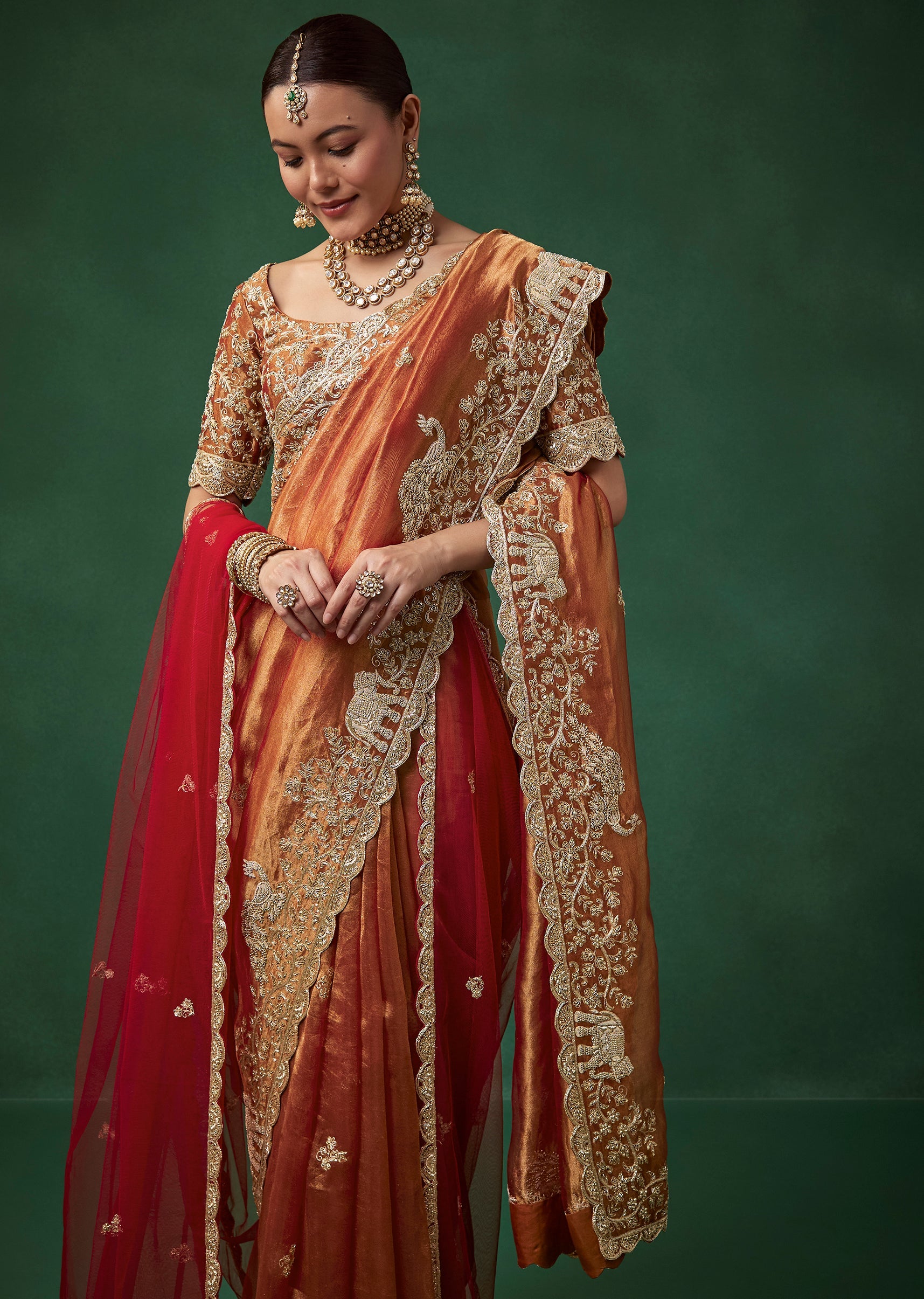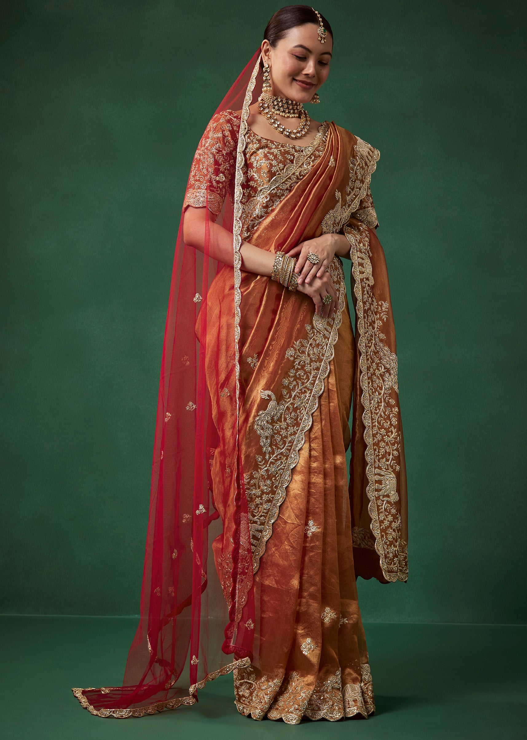 Rust Bridal Silk Organza Saree with Unstitched Blouse