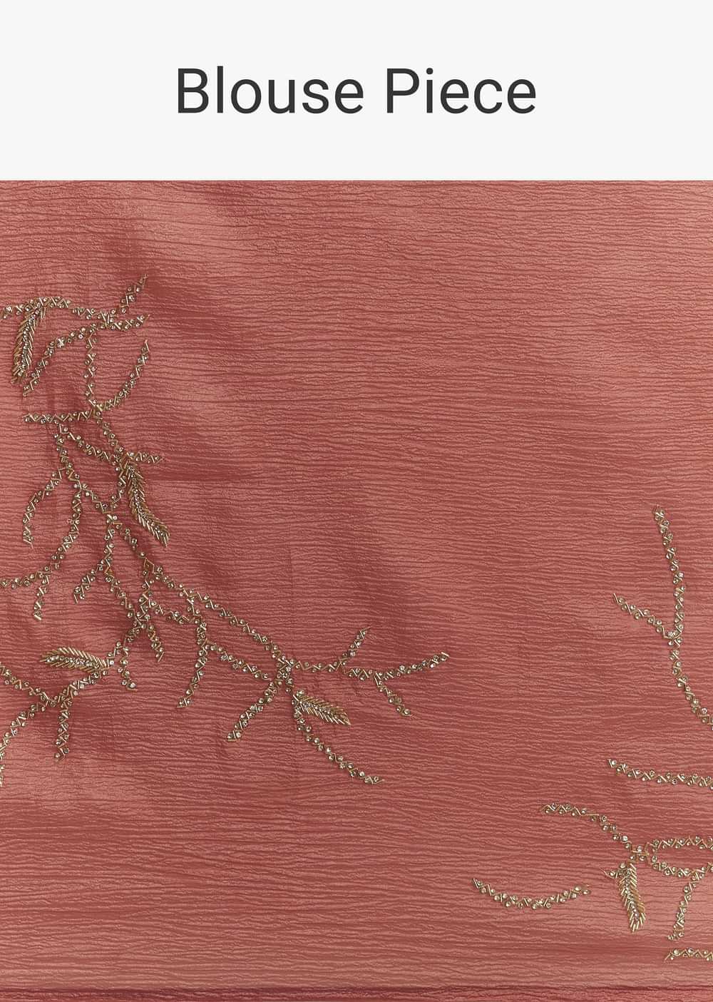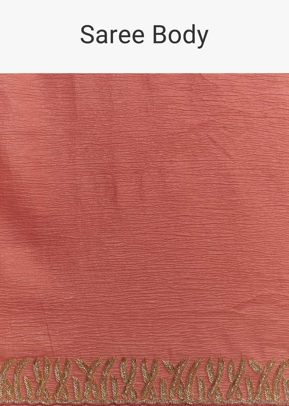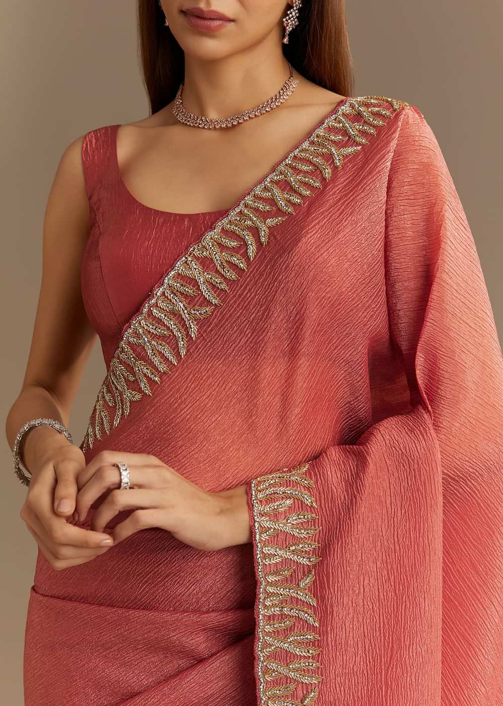 Rust Brown Crushed Tissue Saree With Scallop Border And Stone Embroidery