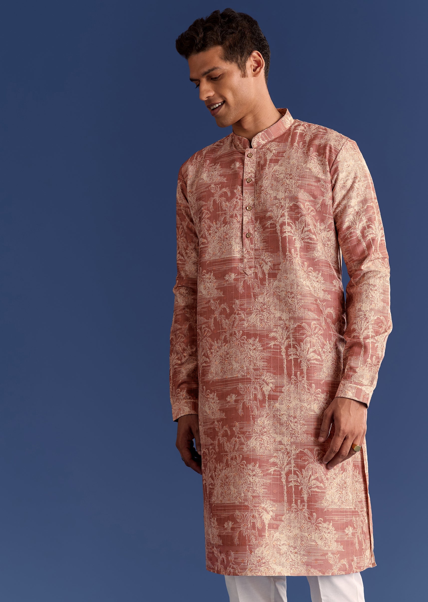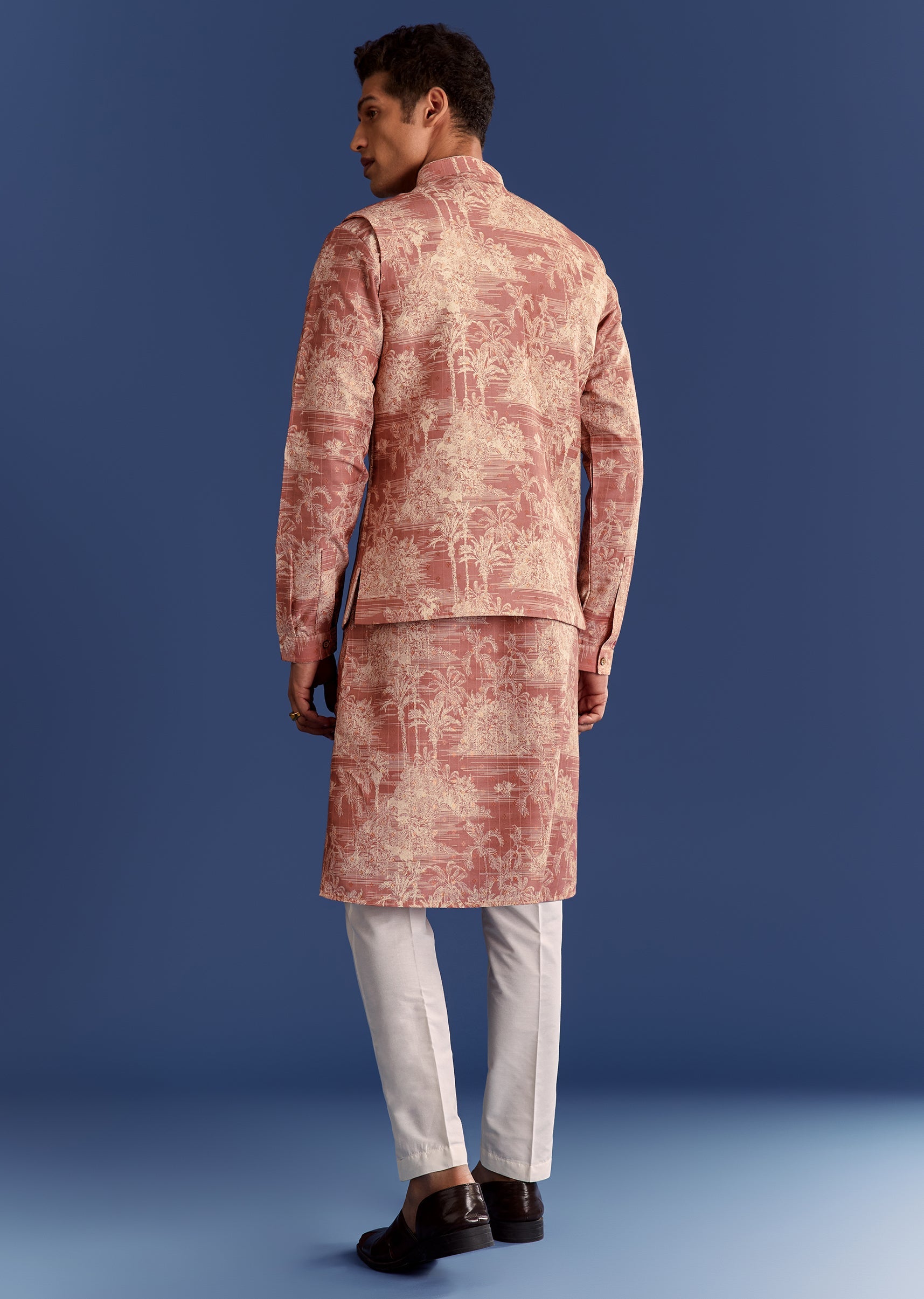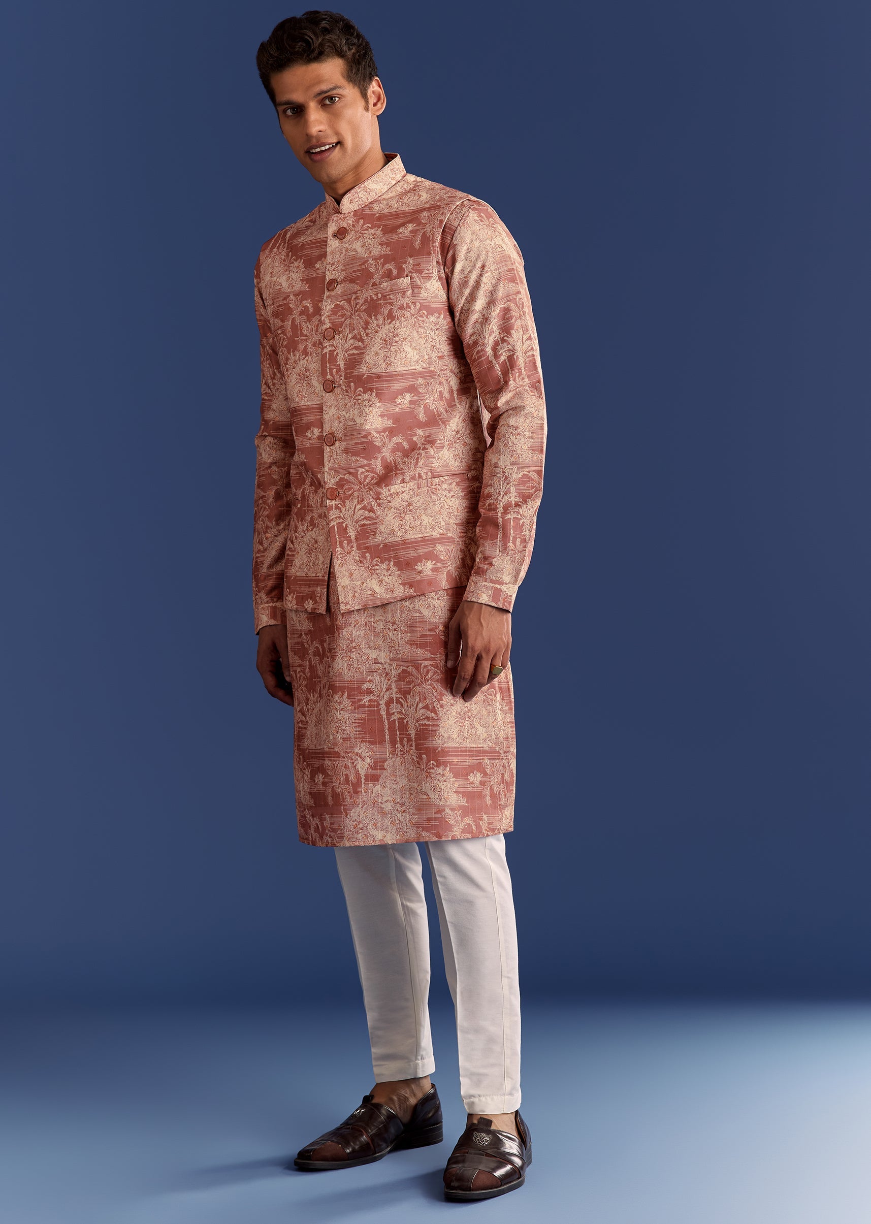 Rust Cotton Silk Kurta Jacket Set With Coastal Print