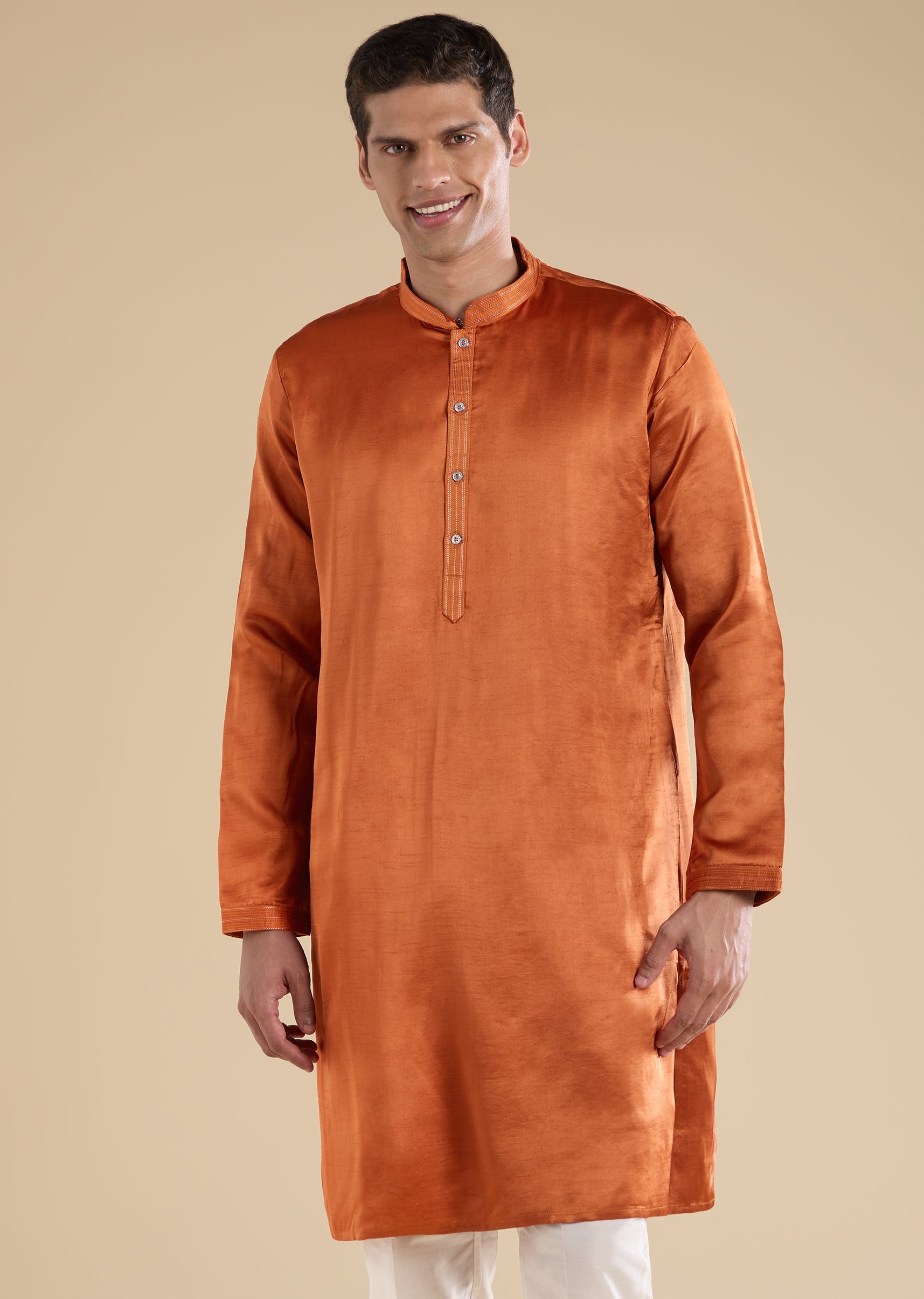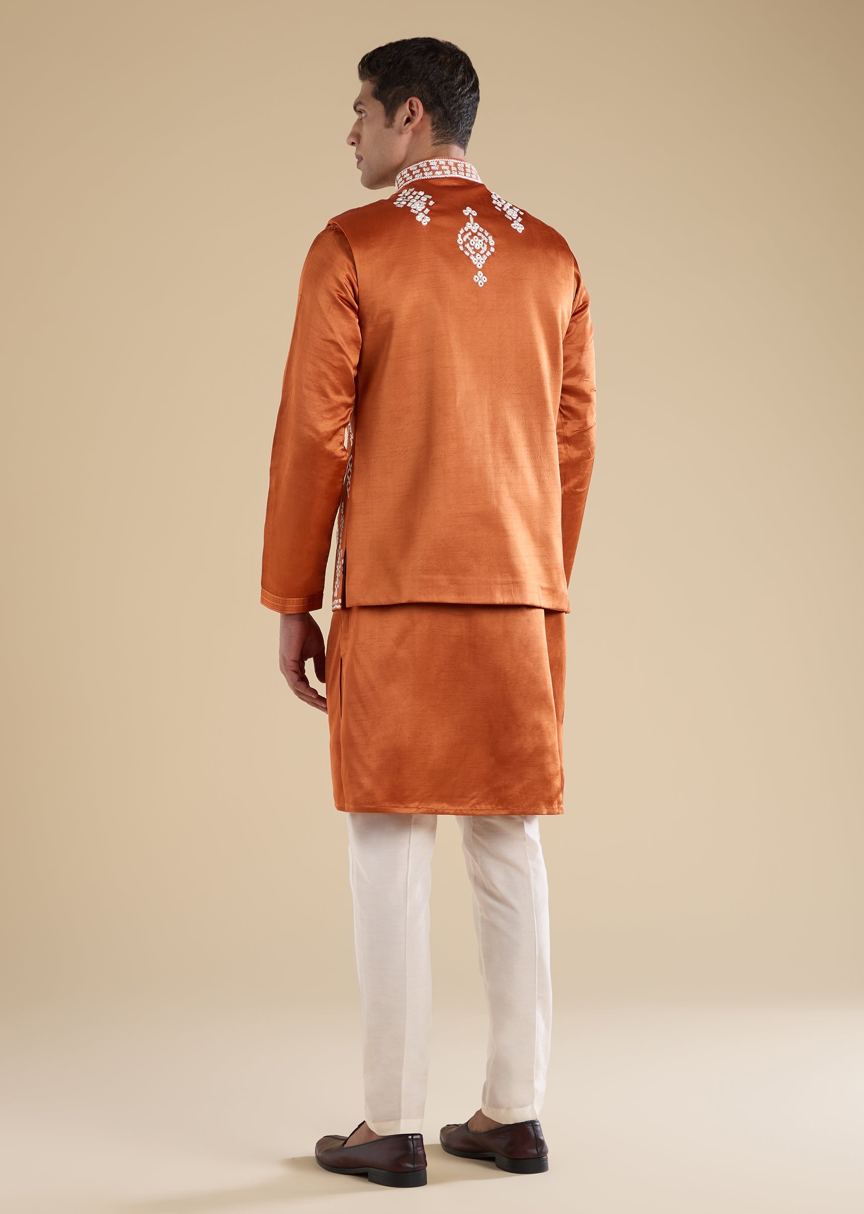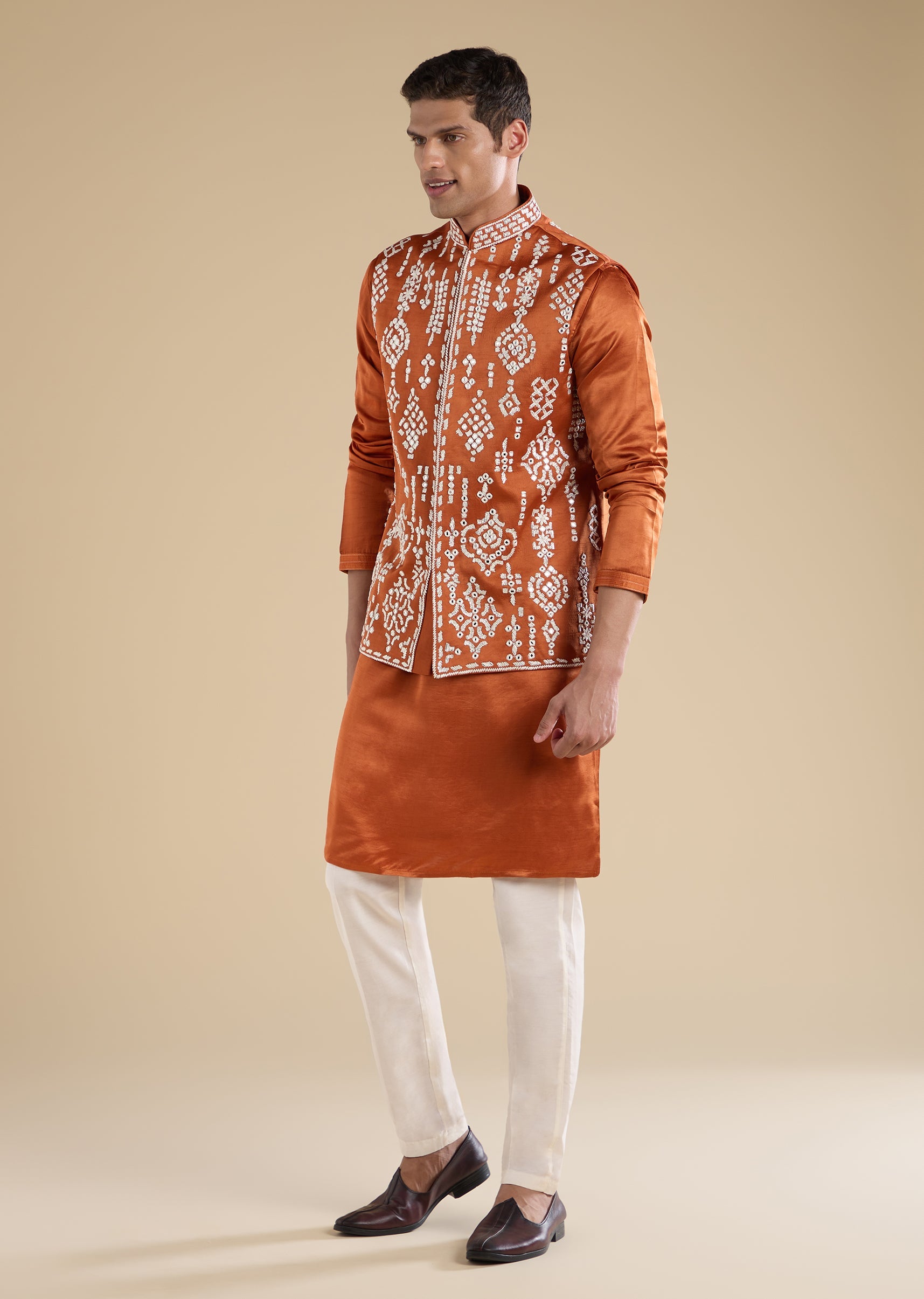 Warm and festive with refined detailing, this rust kurta jacket set is crafted in smooth art silk for a celebratory look. The kurta features a mandarin collar and full sleeves,... More Product Details