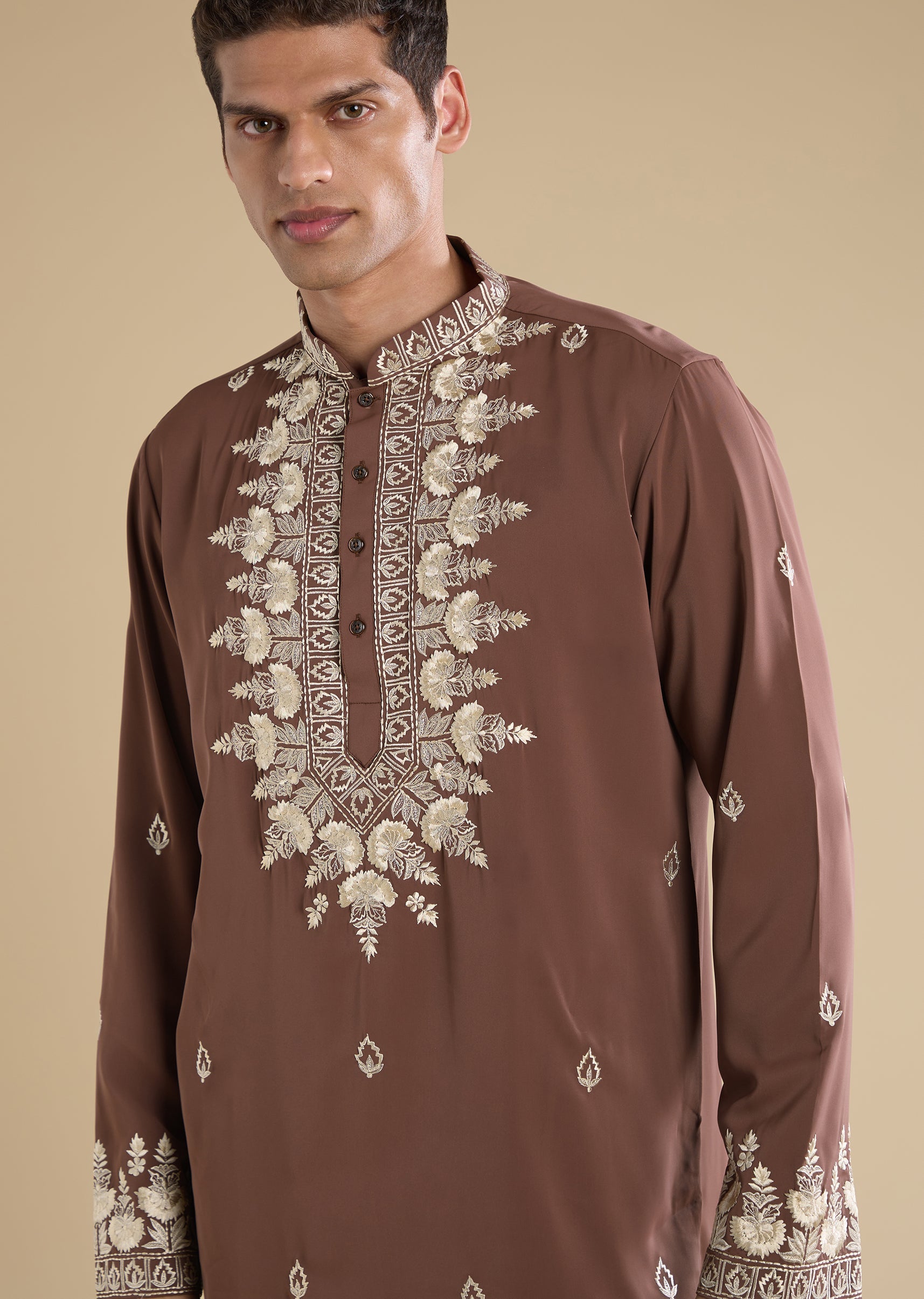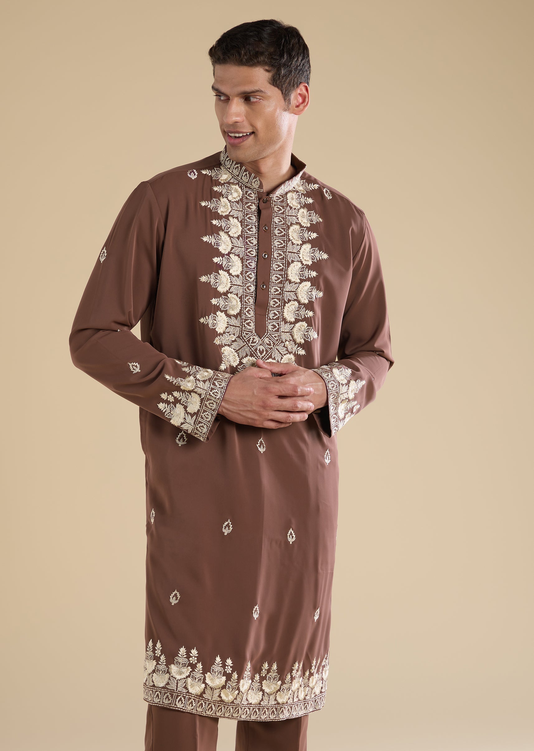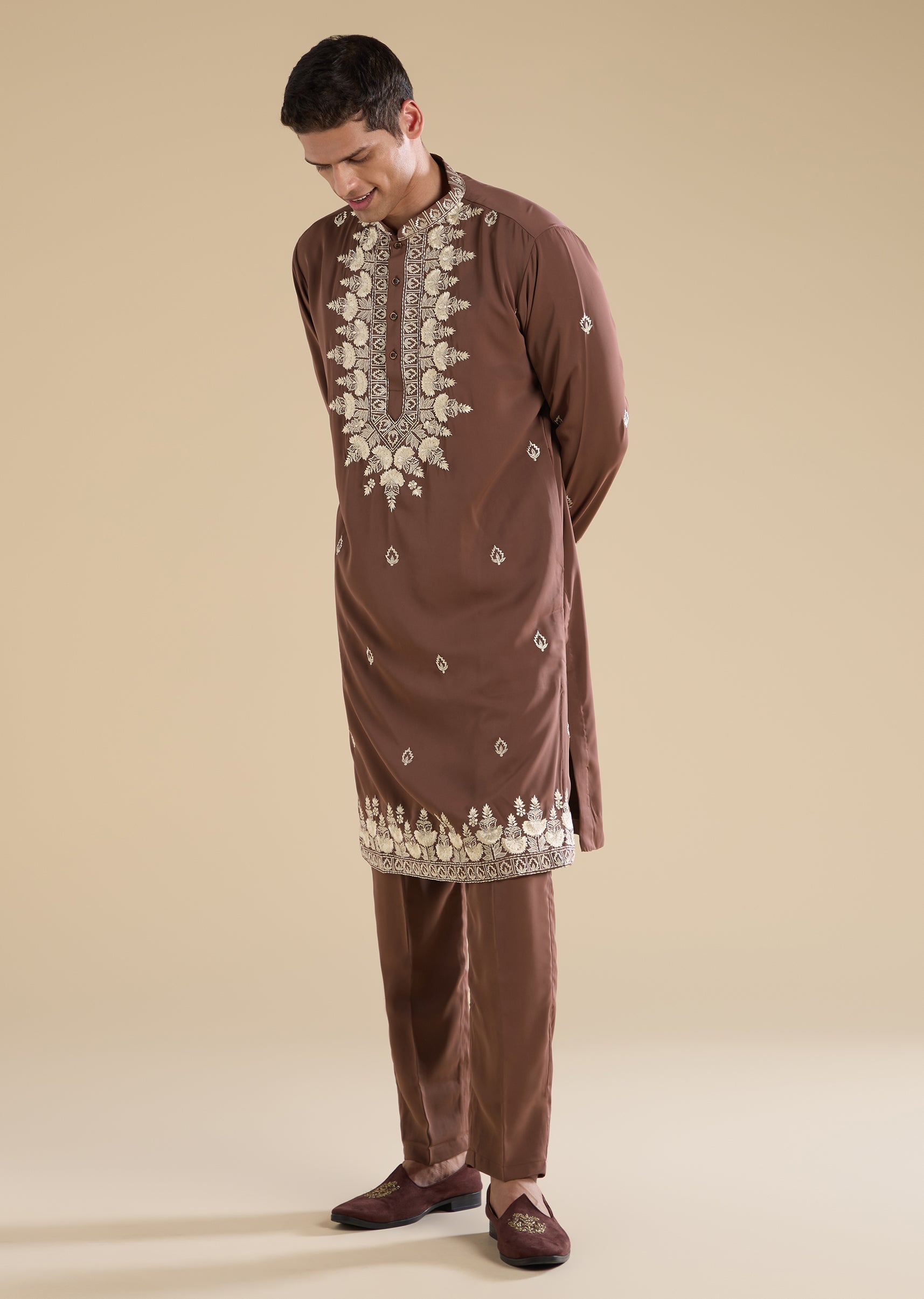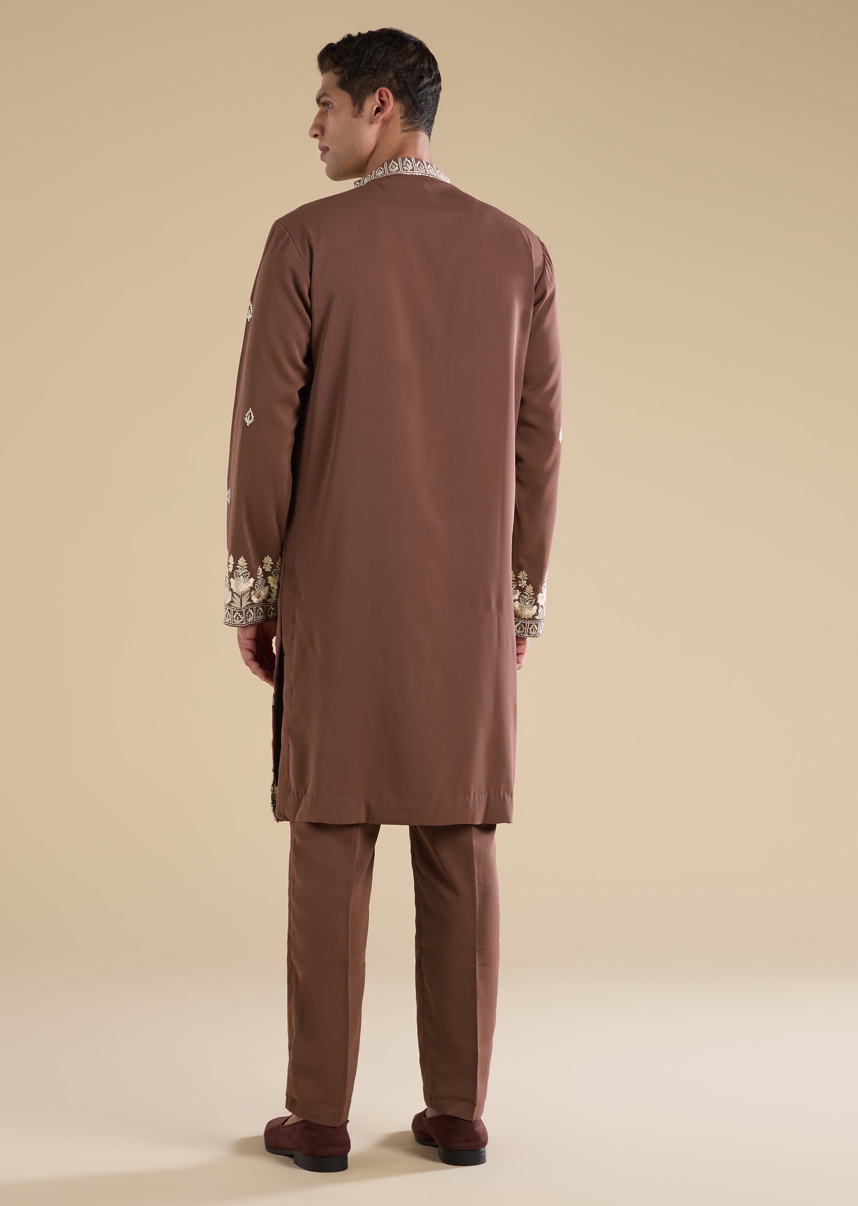 Rich and festive in appeal, this rust kurta set is crafted in smooth art silk for celebratory occasions. Designed with a mandarin collar, full sleeves, and side slits, it features... More Product Details