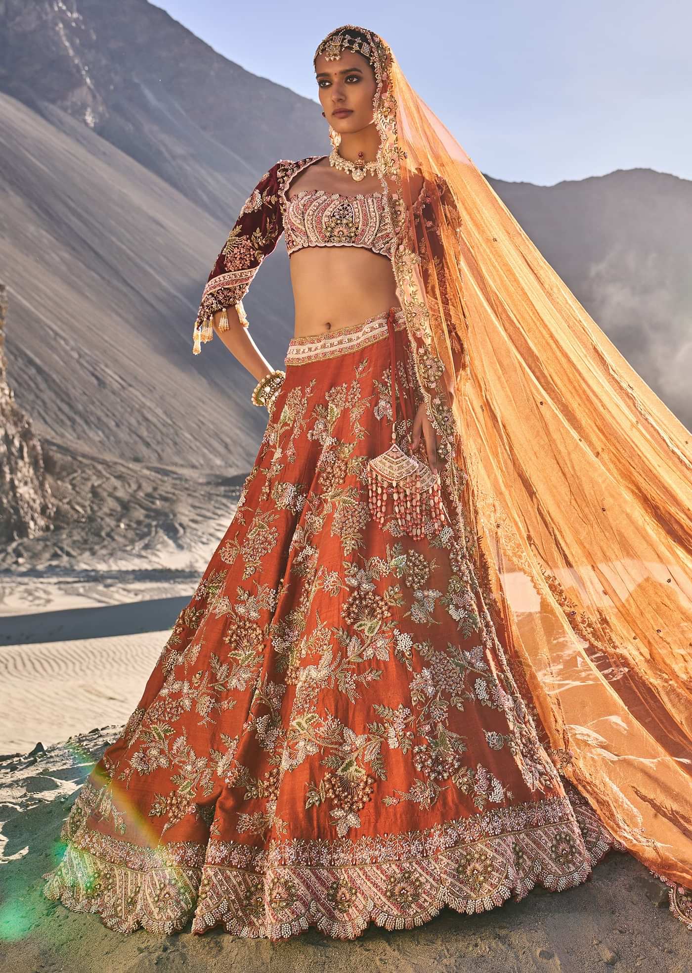 Rust Floral Embroidered Lehenga Set With Two Bordered Dupattas