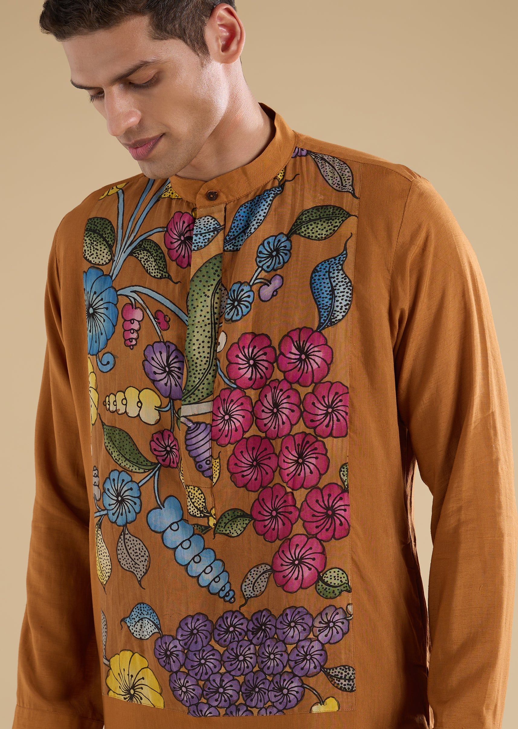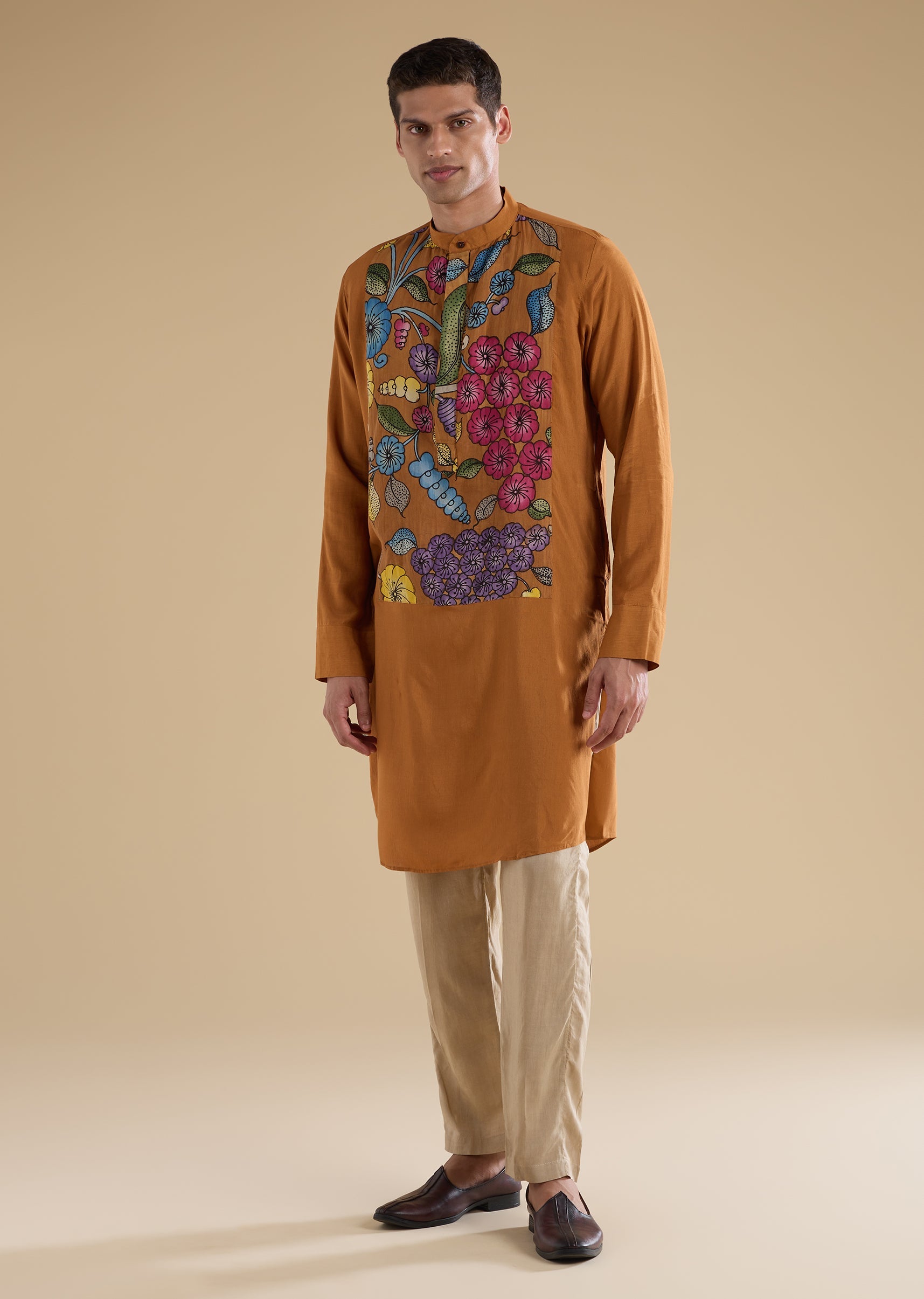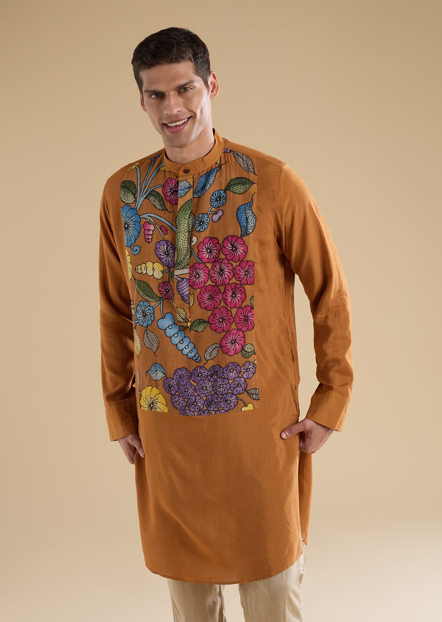 Artisanal and festive in appeal, this rust kurta set features handpainted Kalamkari artwork crafted on a silk–linen blend for a rich yet breathable feel. Designed with a mandarin collar, full sleeves, and side slits, the kurta brings together traditional craftsmanship and contemporary comfort. Paired with straight-fit trousers and a partially elasticated waist, this set is ideal for haldi ceremonies and festive celebrations. Awarded as the Most Trusted Brand, we're delivering styles you love, just as promised.