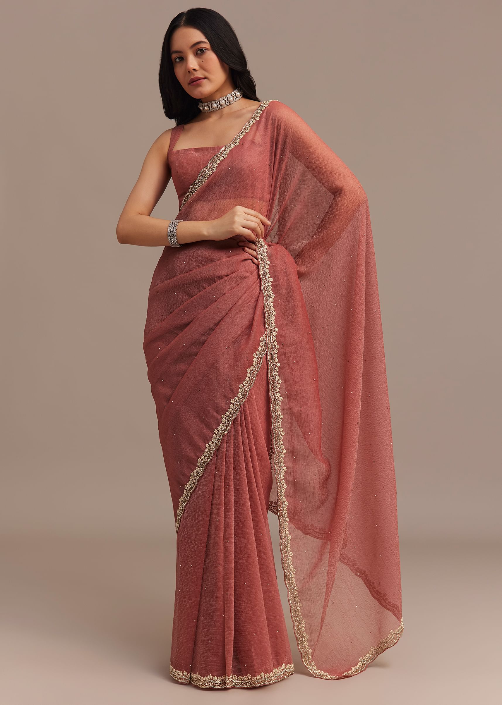Rust Orange Crushed Tissue Saree With Stone And Cutdana Embellished Border