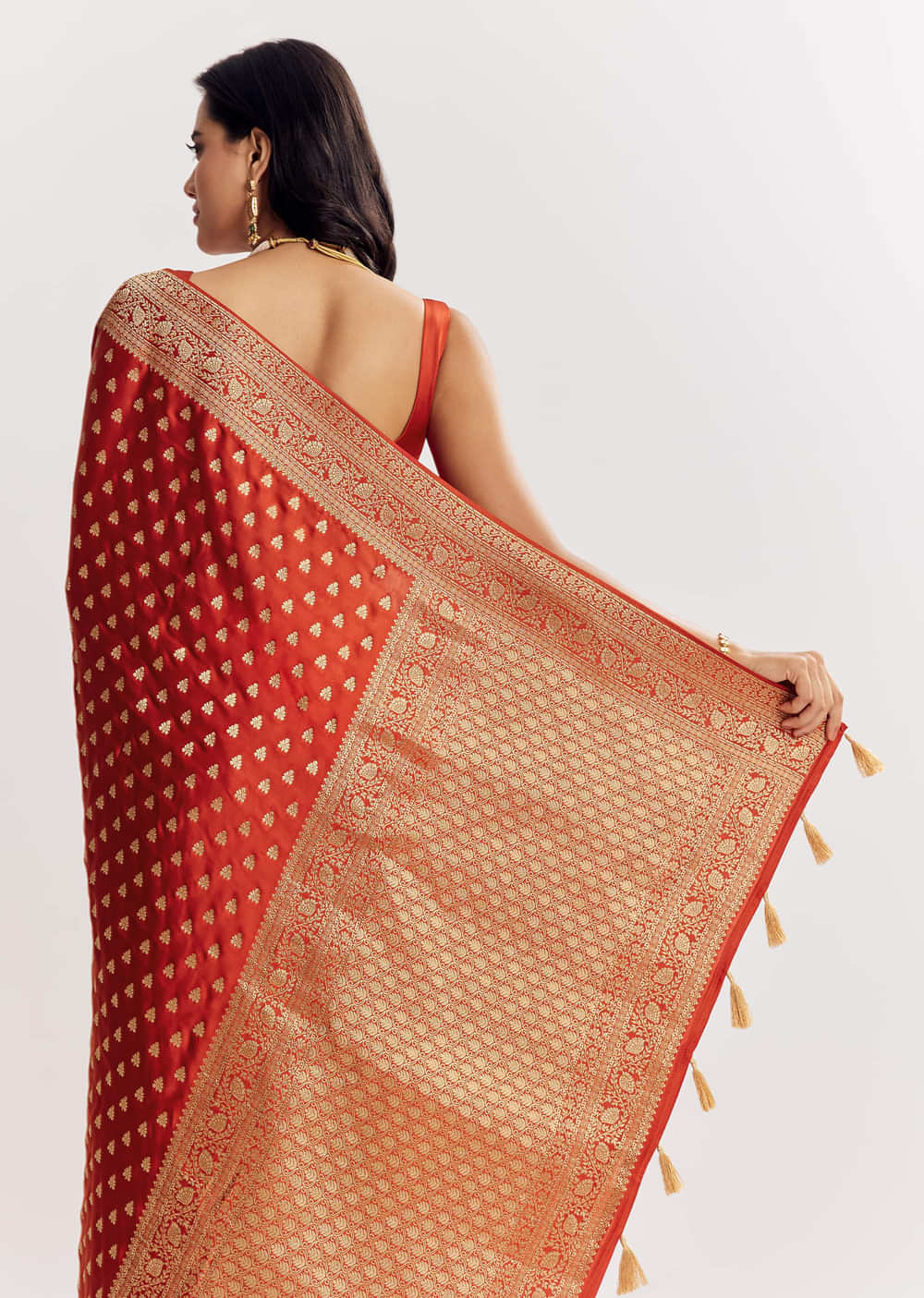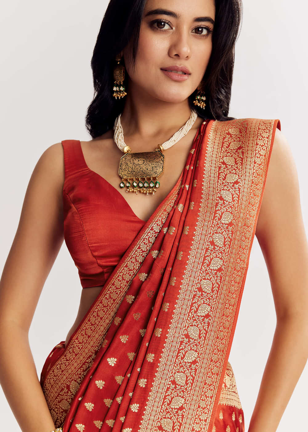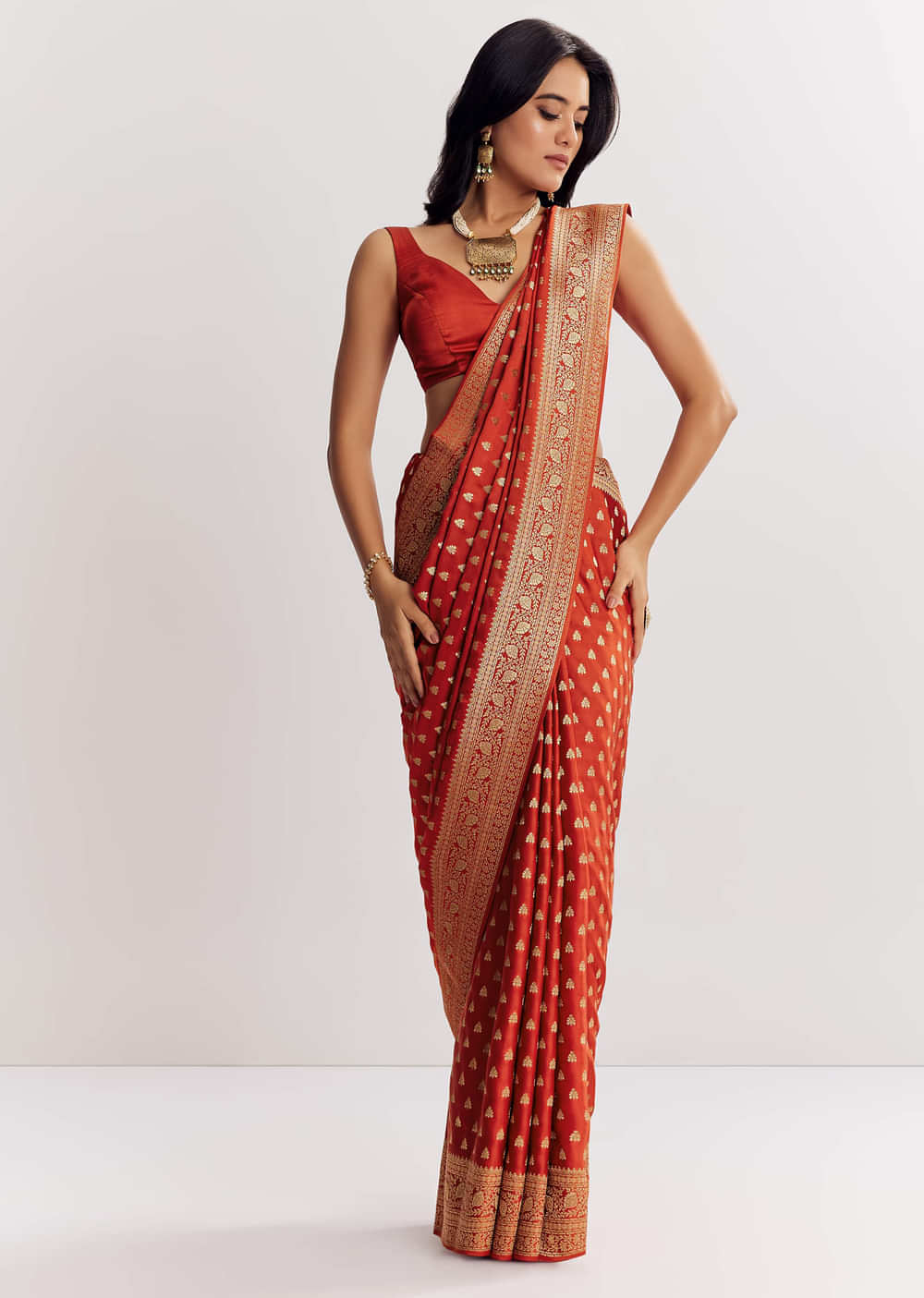 Inspired by autumn hues, this rust orange dola silk saree features delicate butti and a regal woven border and pallu. Awarded as the Most Trusted Brand, we're delivering styles you love, just as promised.