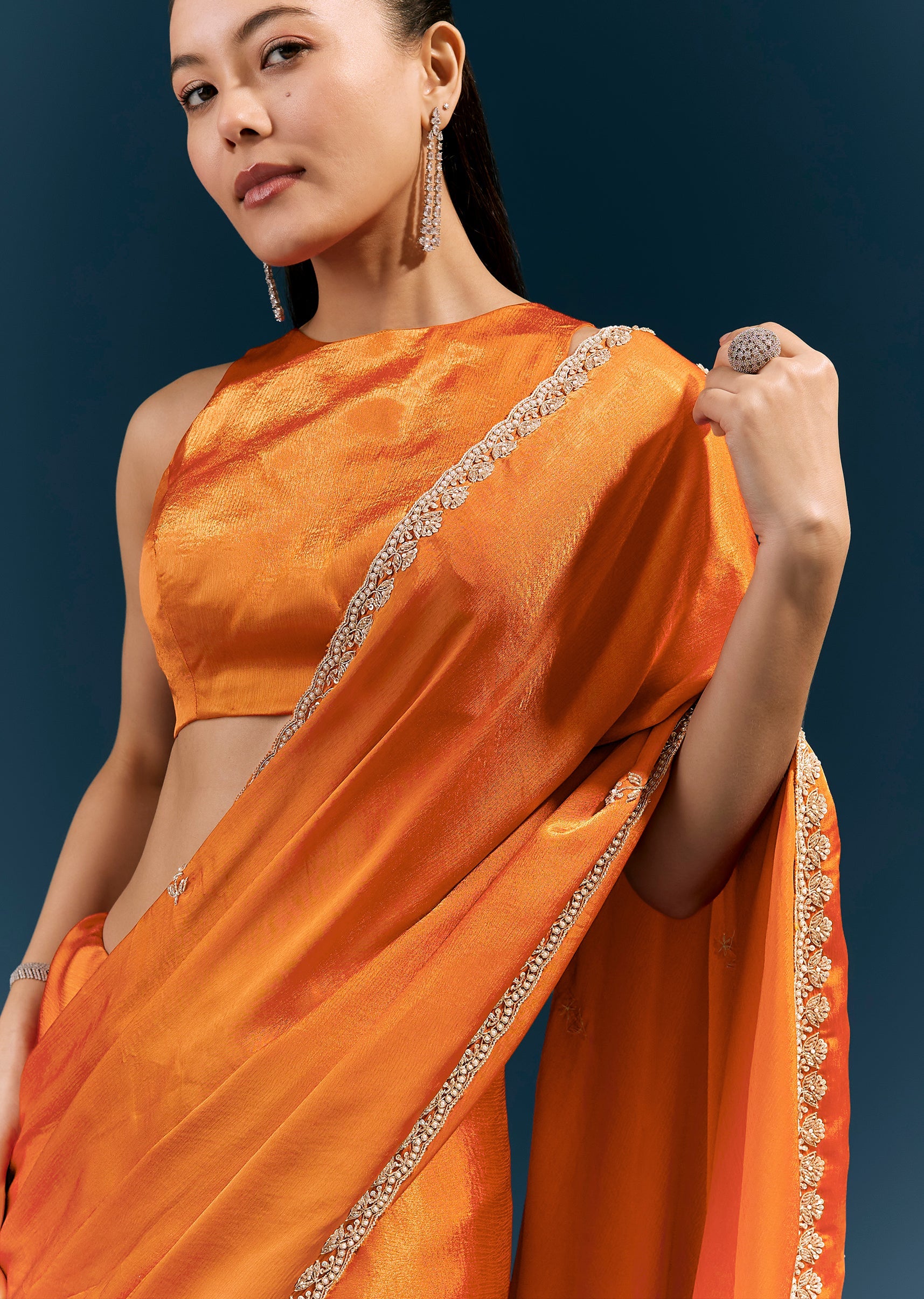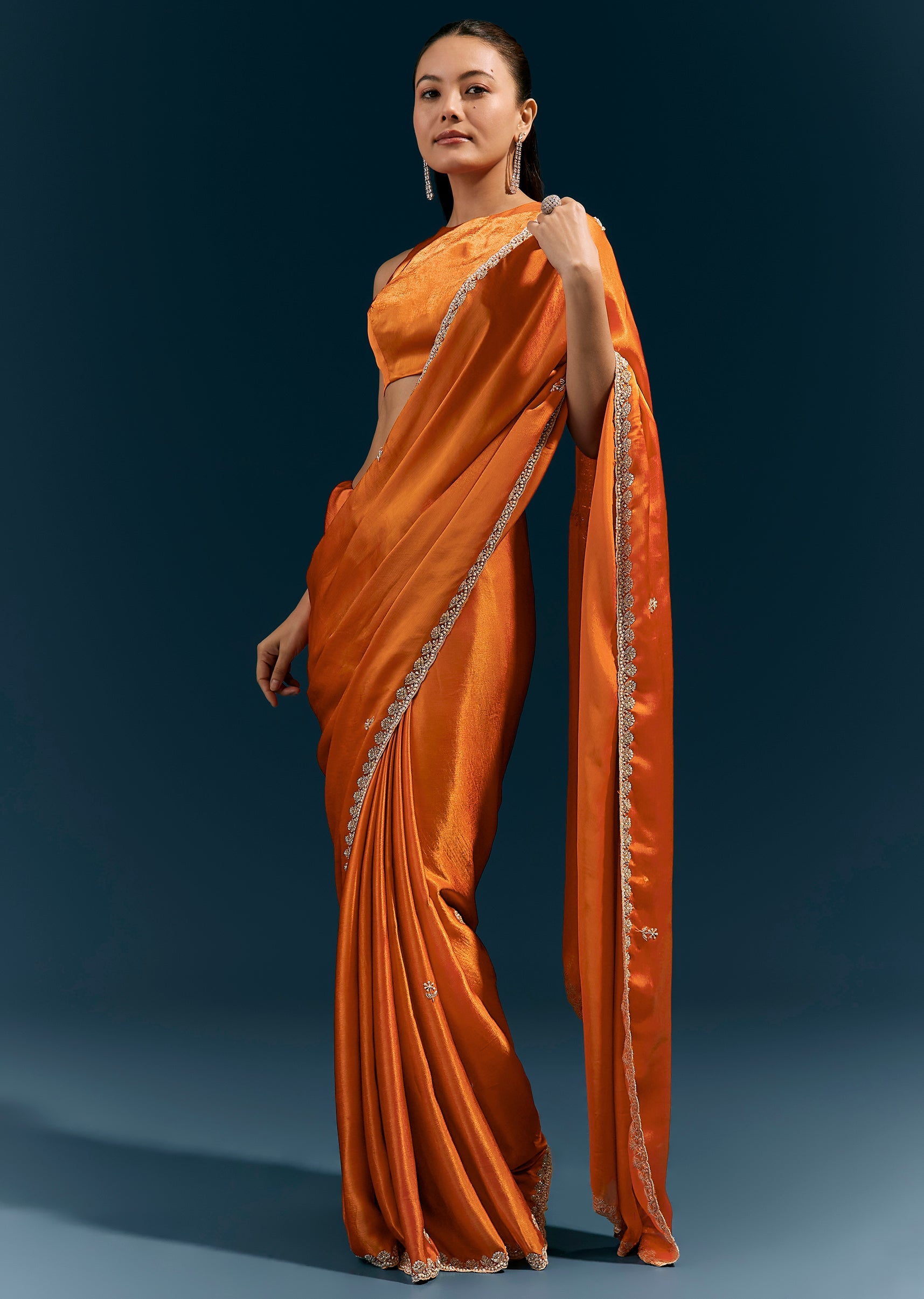 Warm, vibrant, and celebratory, this rust orange satin chinon saree features a scalloped embroidered border and delicate buttis detailed with moti, cutda, sequins, and beads. The fluid fabric and handcrafted... More Product Details