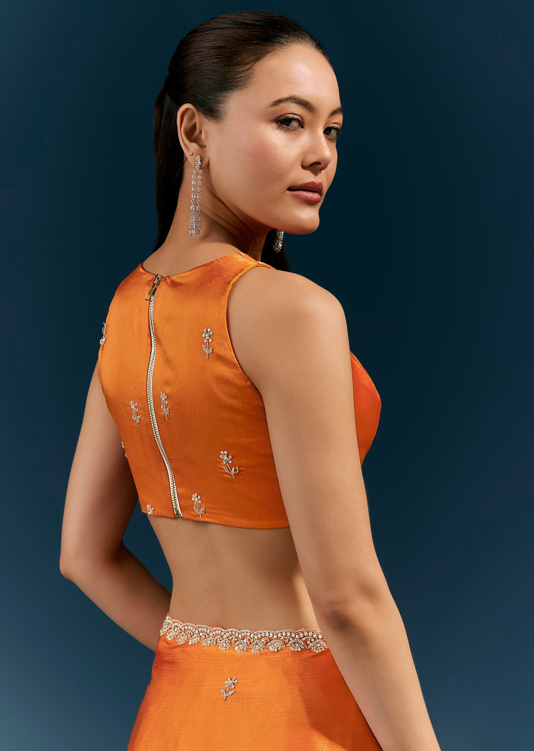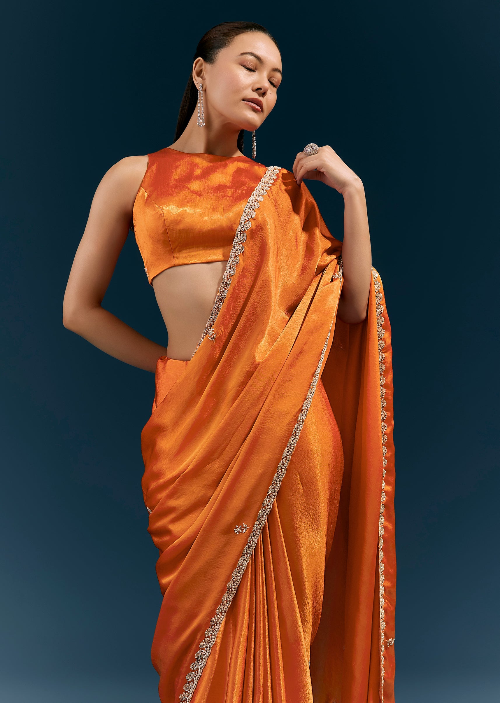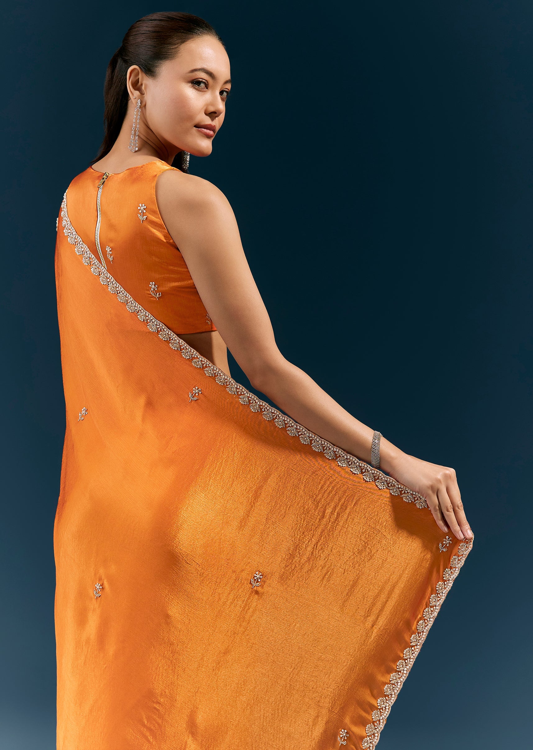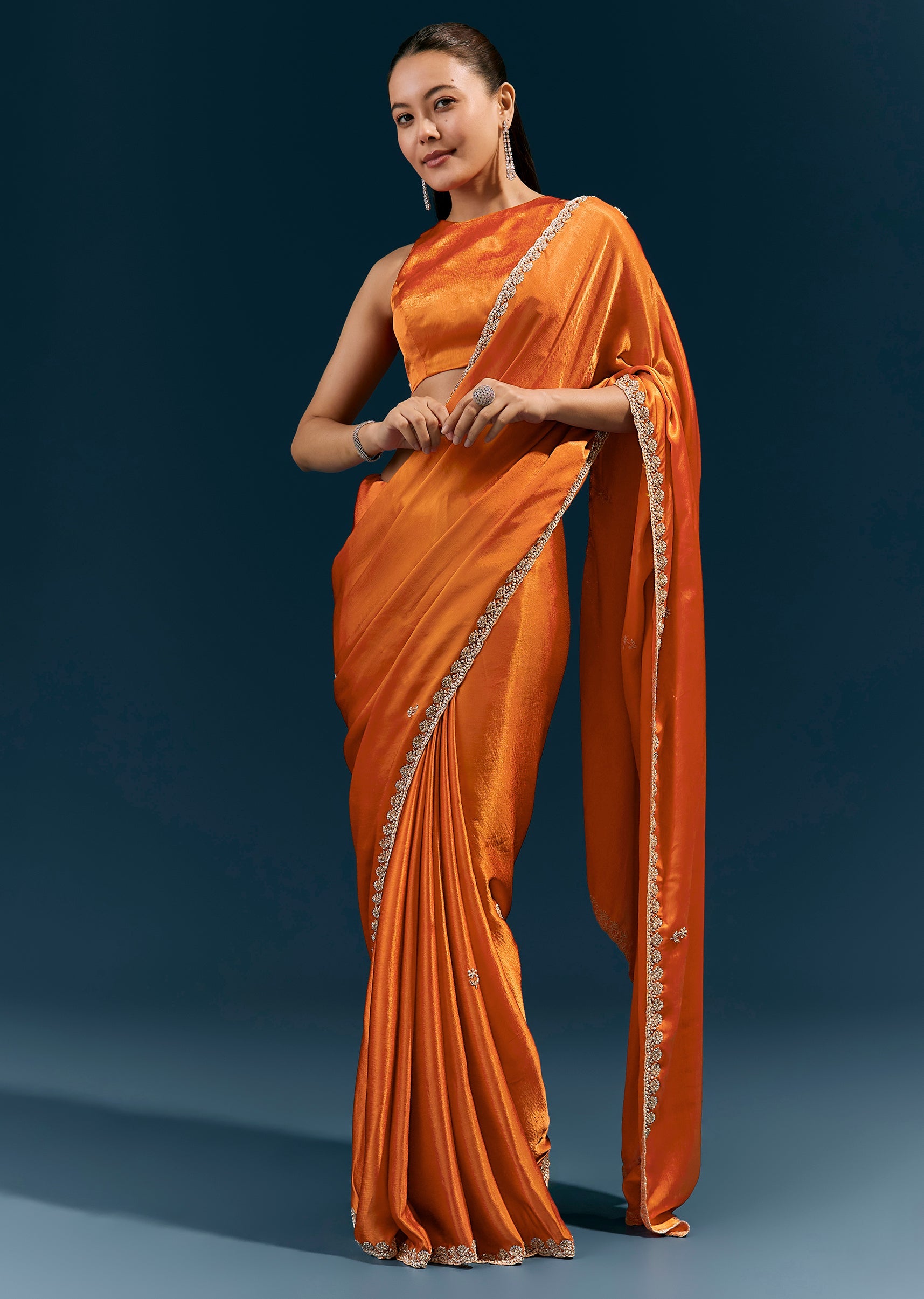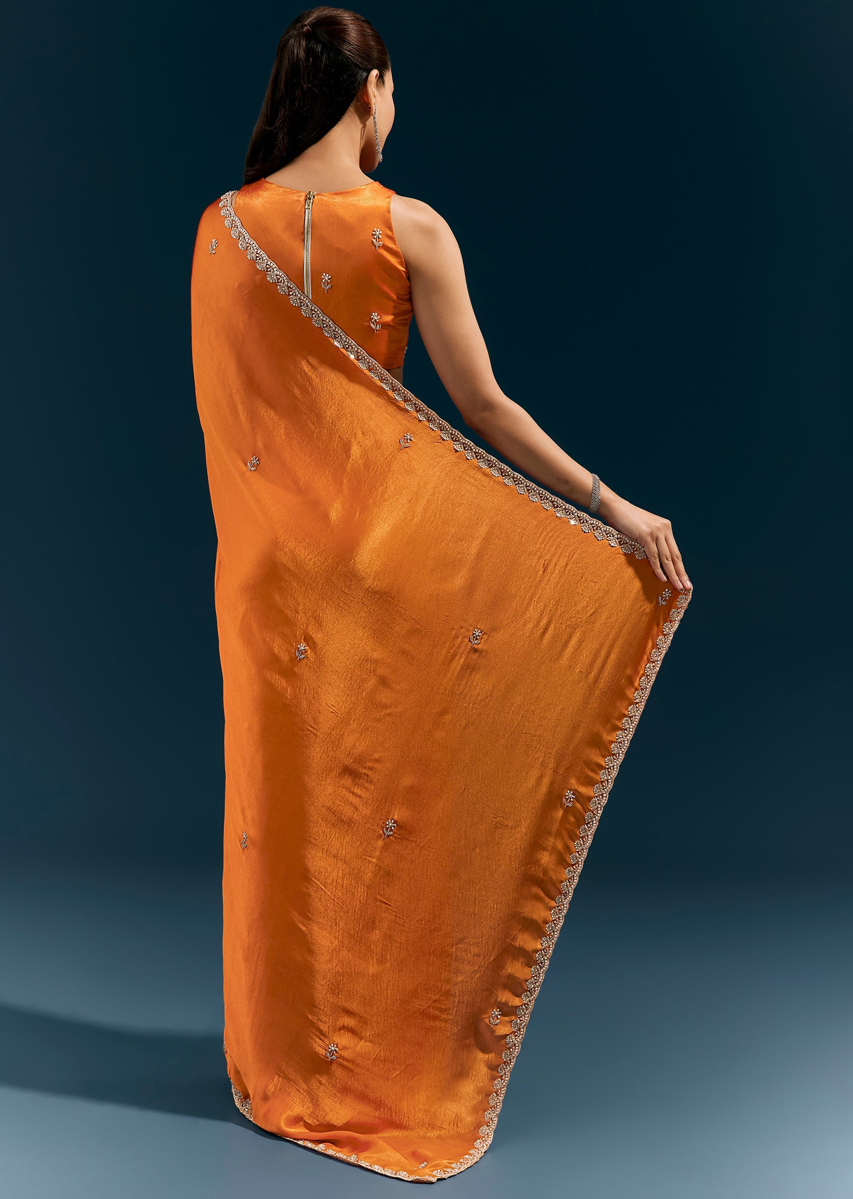 Warm, vibrant, and celebratory, this rust orange satin chinon saree features a scalloped embroidered border and delicate buttis detailed with moti, cutda, sequins, and beads. The fluid fabric and handcrafted accents make it perfect for mehendi ceremonies, festive gatherings, and daytime wedding events. Awarded as the Most Trusted Brand, we're delivering styles you love, just as promised.