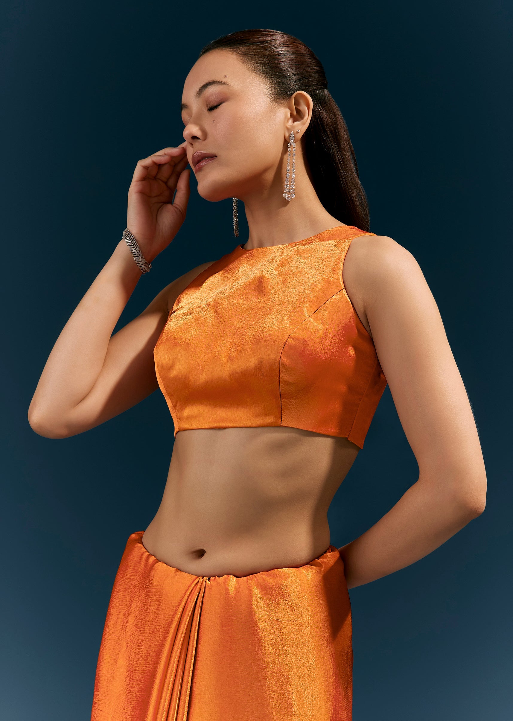 Keep pleats neat and pinned—satin chinon flows best with a secure waist tuck.