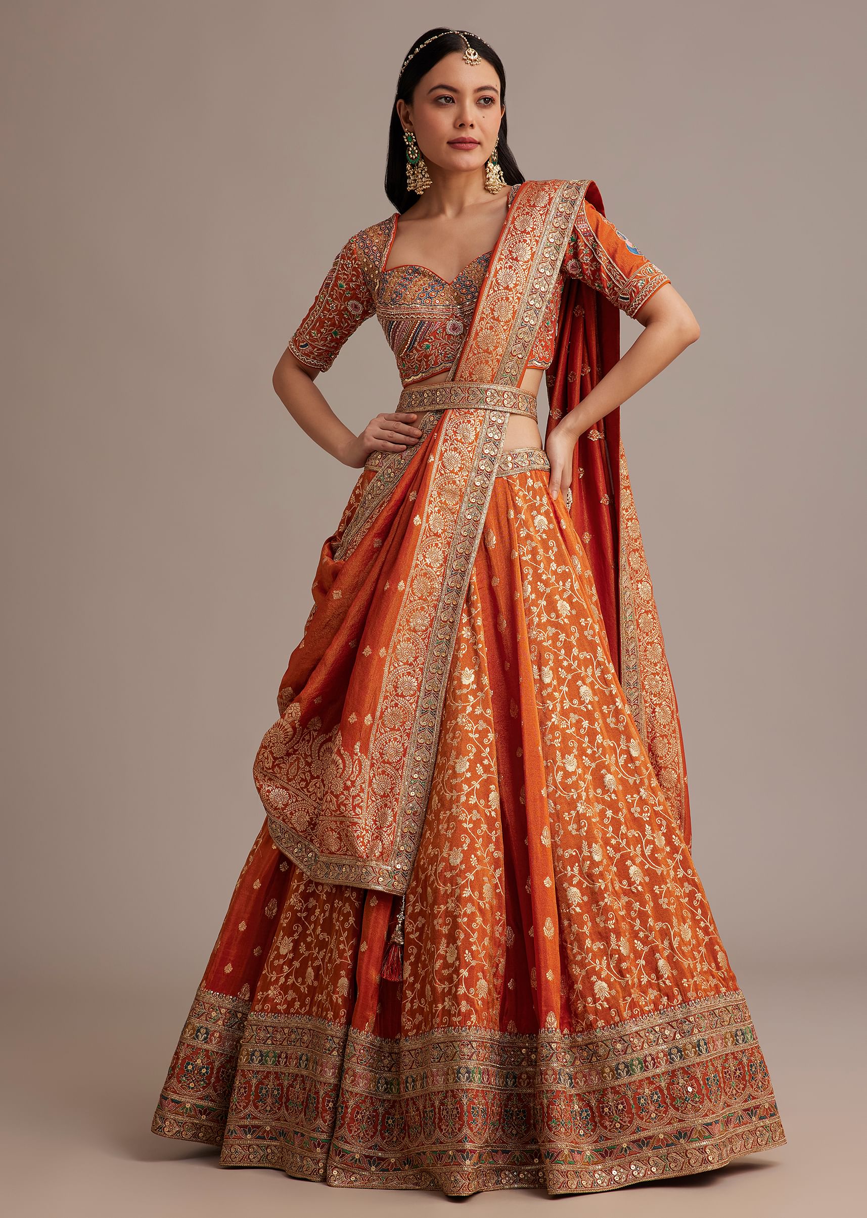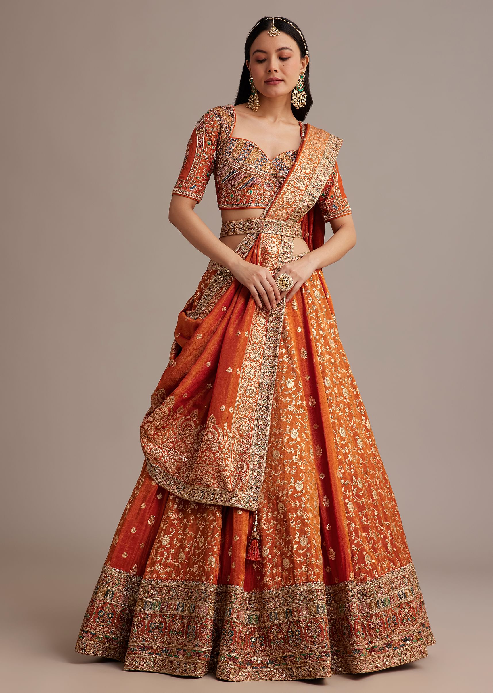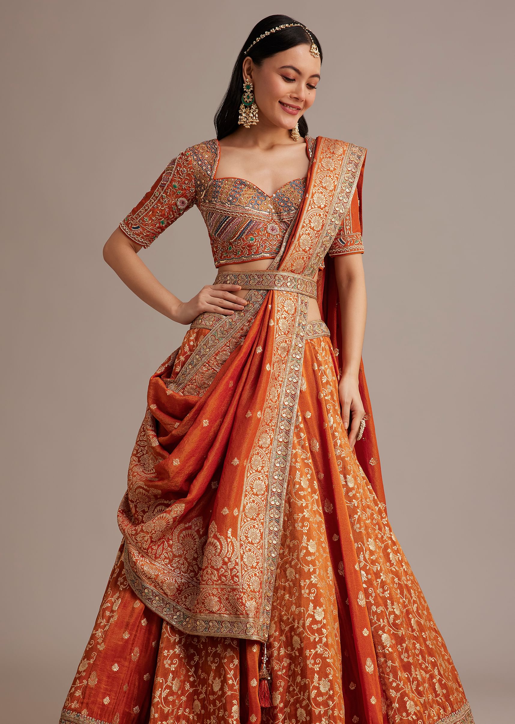 - Drape Yourself In Heritage With This Rust Orange Tissue Lehenga Set Featuring Exquisite Zari Thread Weaving And Resham Embroidery.