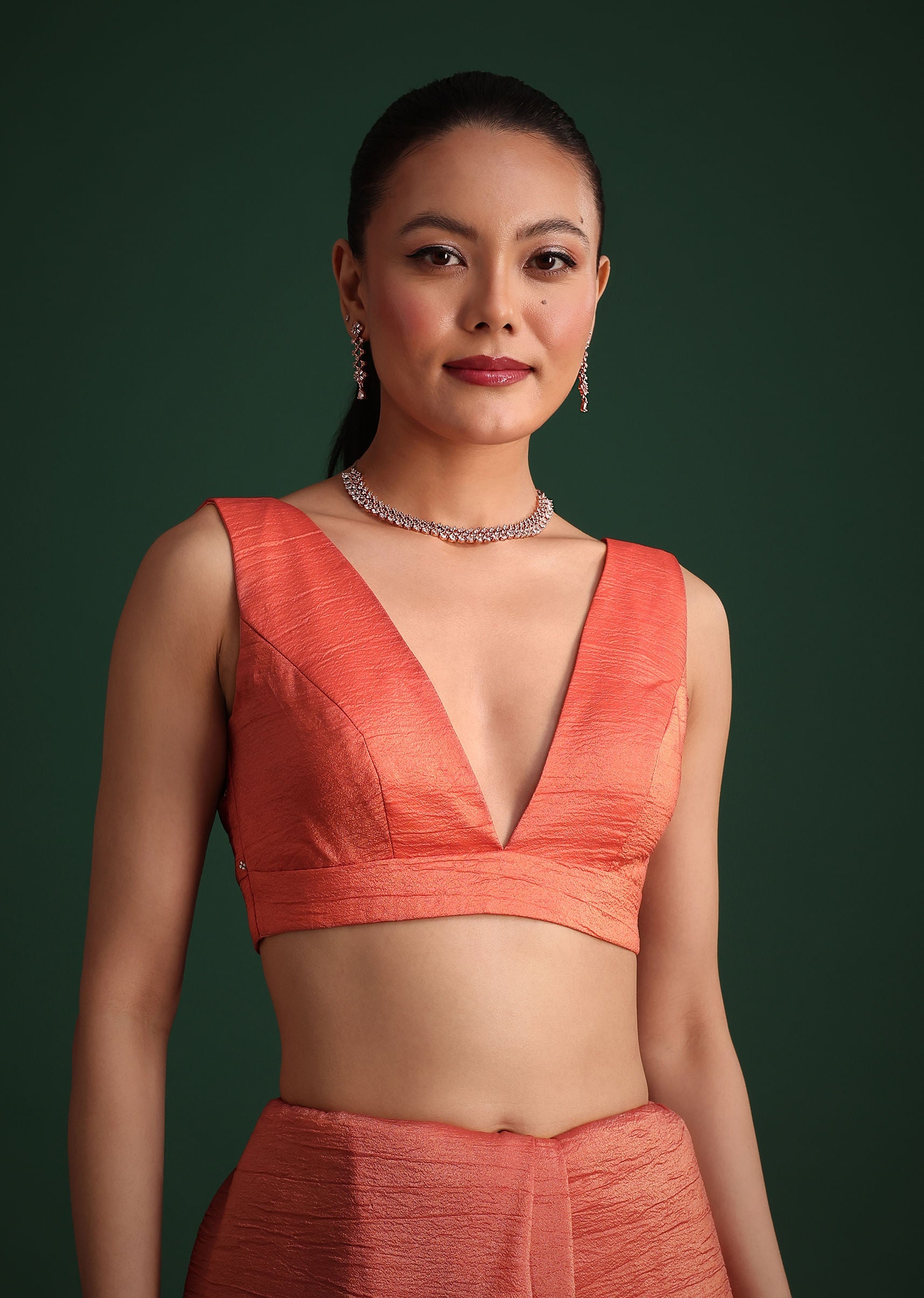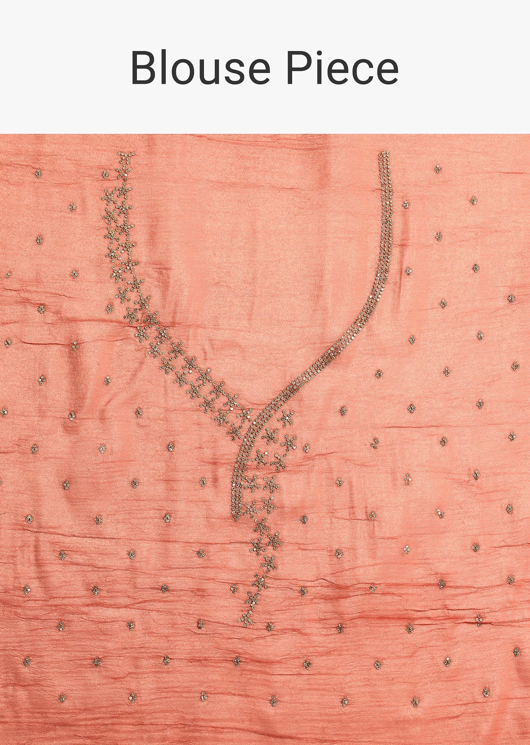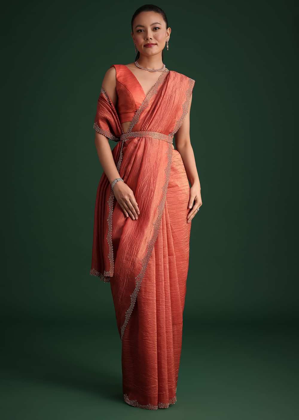 Embrace the beauty of our rich culture and traditions with this gorgeous rust pink crushed tissue saree. The exquisite diamond embellishments on the border, make it an opulent choice for year-round grand celebration and festive occasions. Awarded as the Most Trusted Brand, we're delivering styles you love, just as promised.