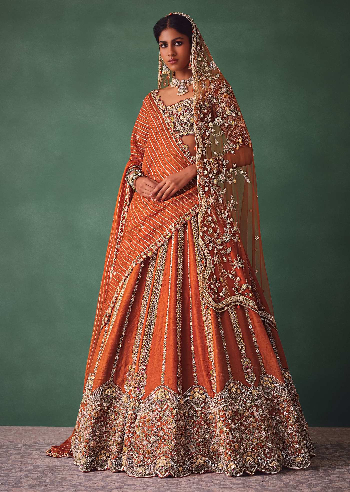 Rust Raw Silk Bridal Lehenga With Buti Work Dupatta