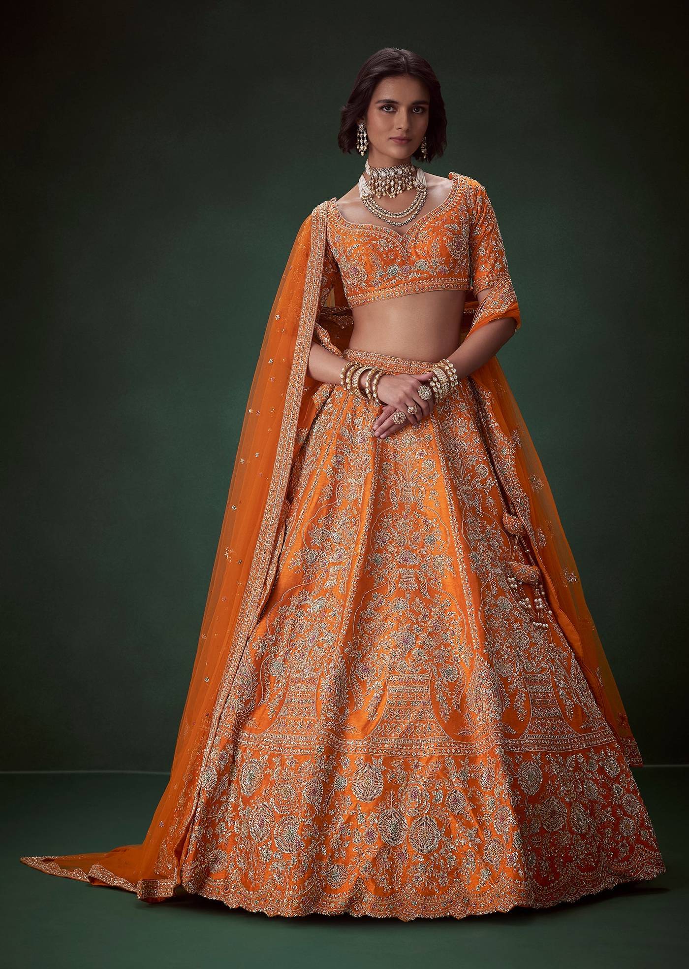 Radiate bridal grandeur with this heavily embroidered rust orange lehenga featuring intricate silver and gold threadwork enriched with zari, resham, sequins, stones, and detailed embellishments. The matching half sleeve V... More Product Details