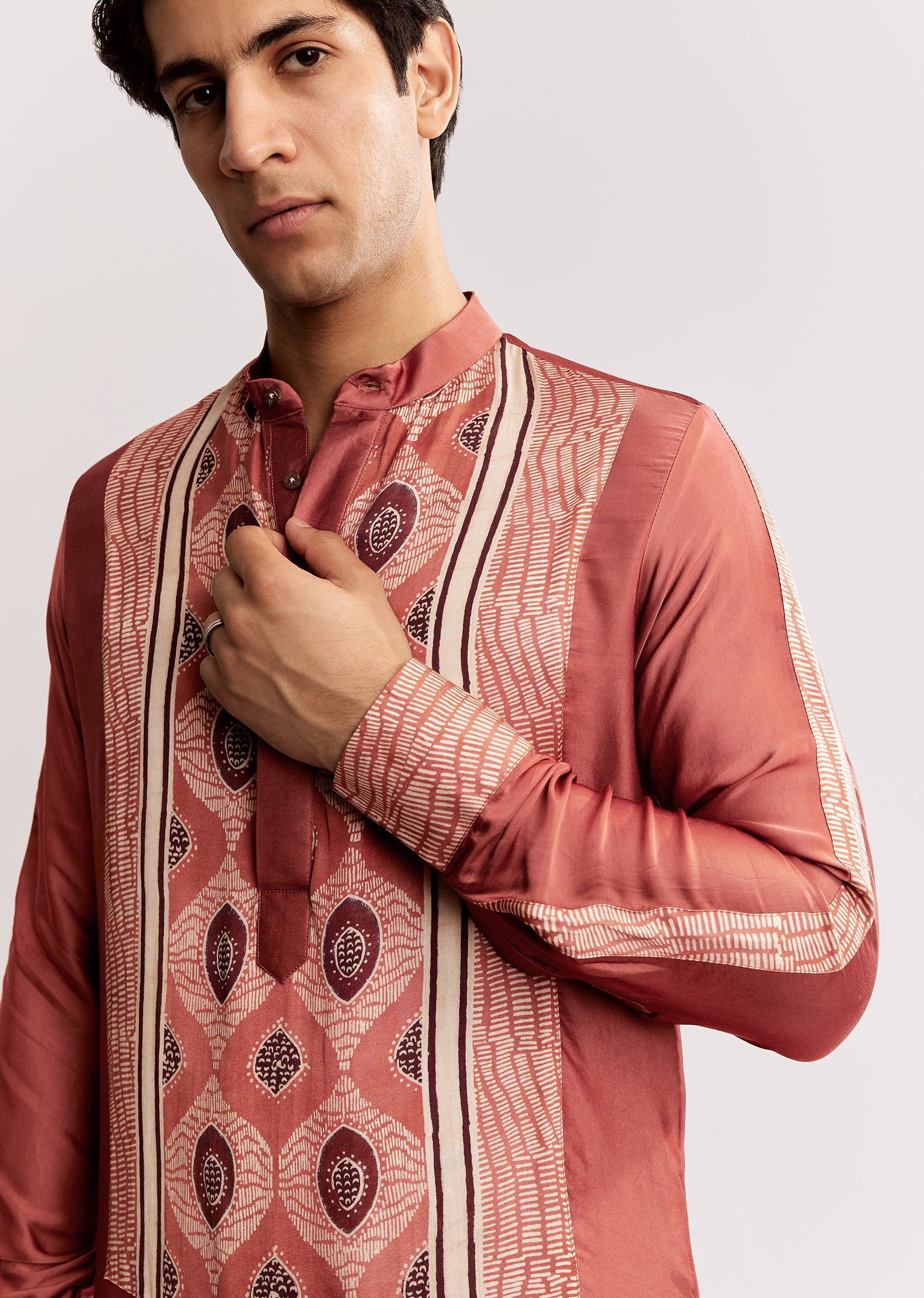 Rust Silk Kurta Set With Handcrafted Ajrakh Print