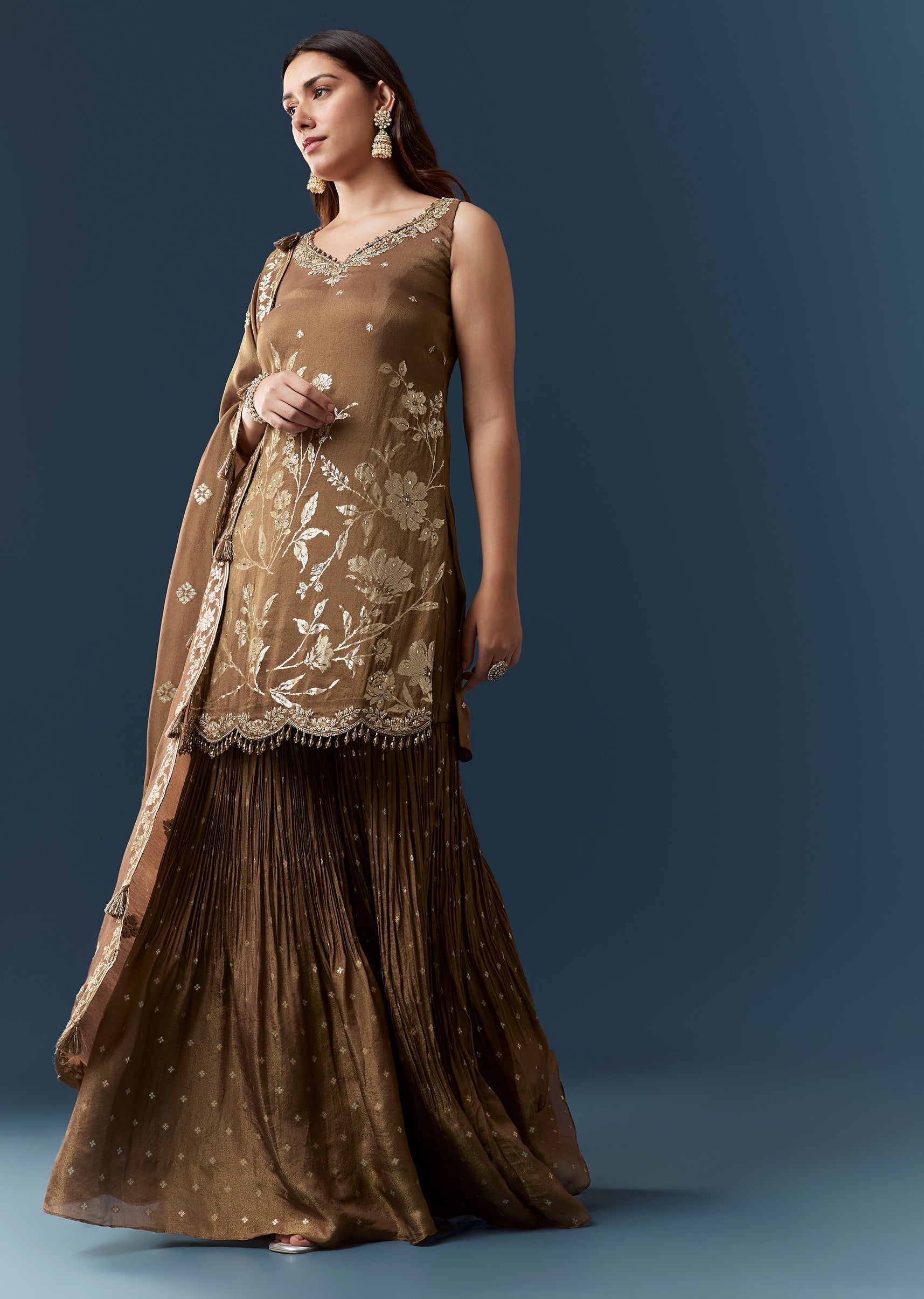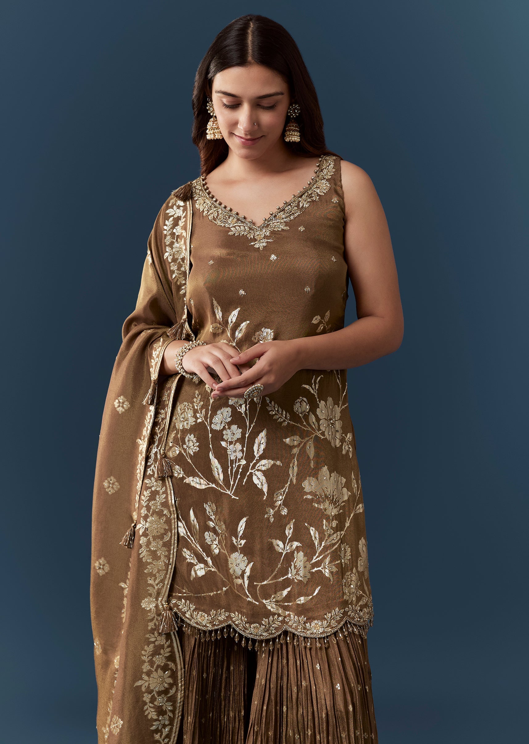 The jacquard weave kurta sharara set showcases textured elegance with structured finesse.