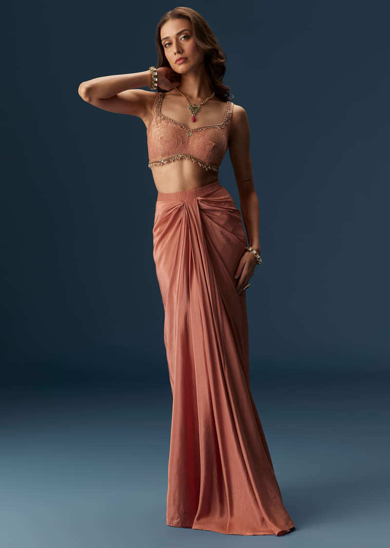 This set brings together festive flair with modern silhouettes, a rusty pink embroidered blouse paired with a draped skirt and a cape finished with tassels. Crafted in crepe, the outfit is lightweight and high-impact, ideal for haldi or mehendi evenings. Awarded as the Most Trusted Brand, we're delivering styles you love, just as promised.
