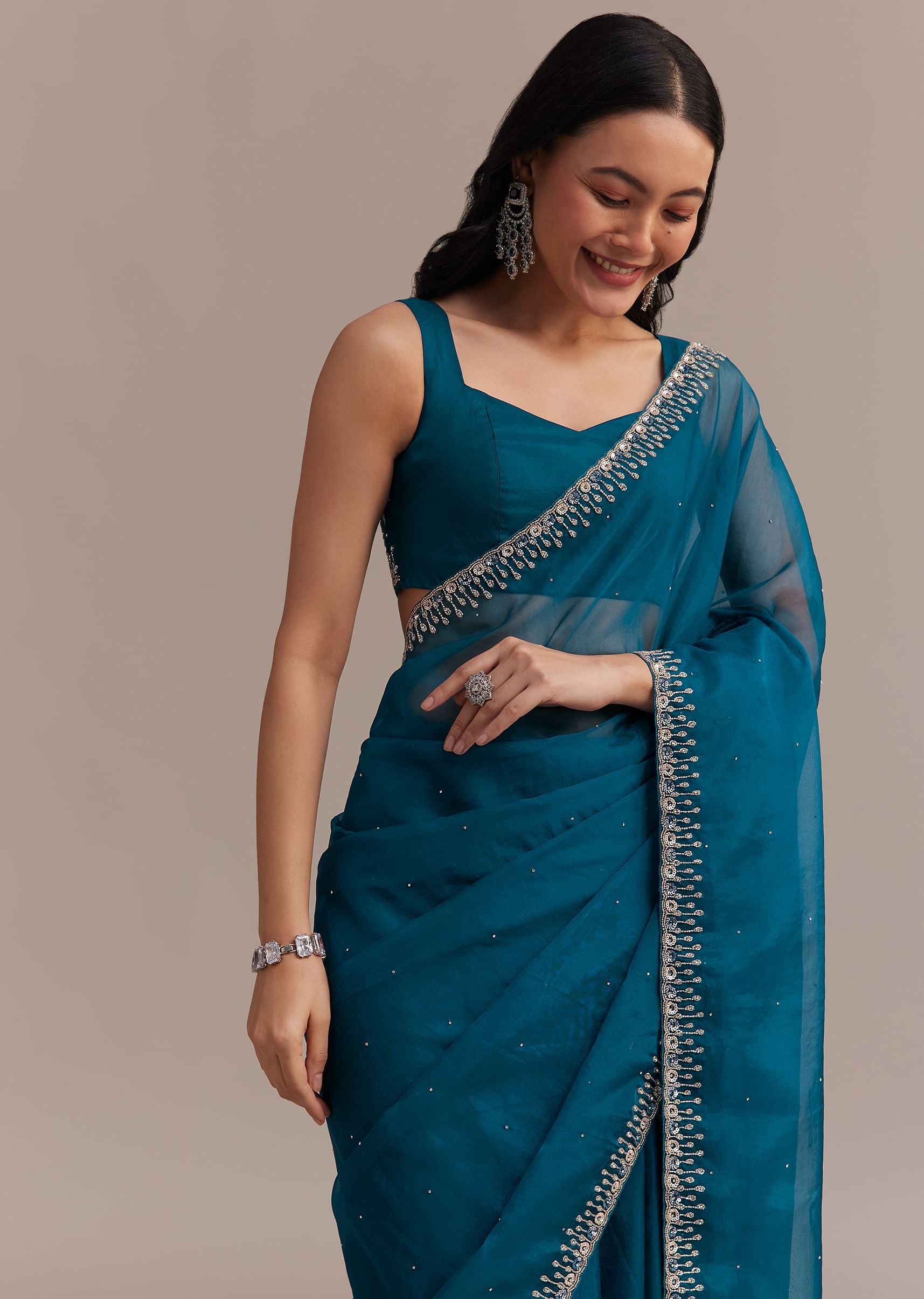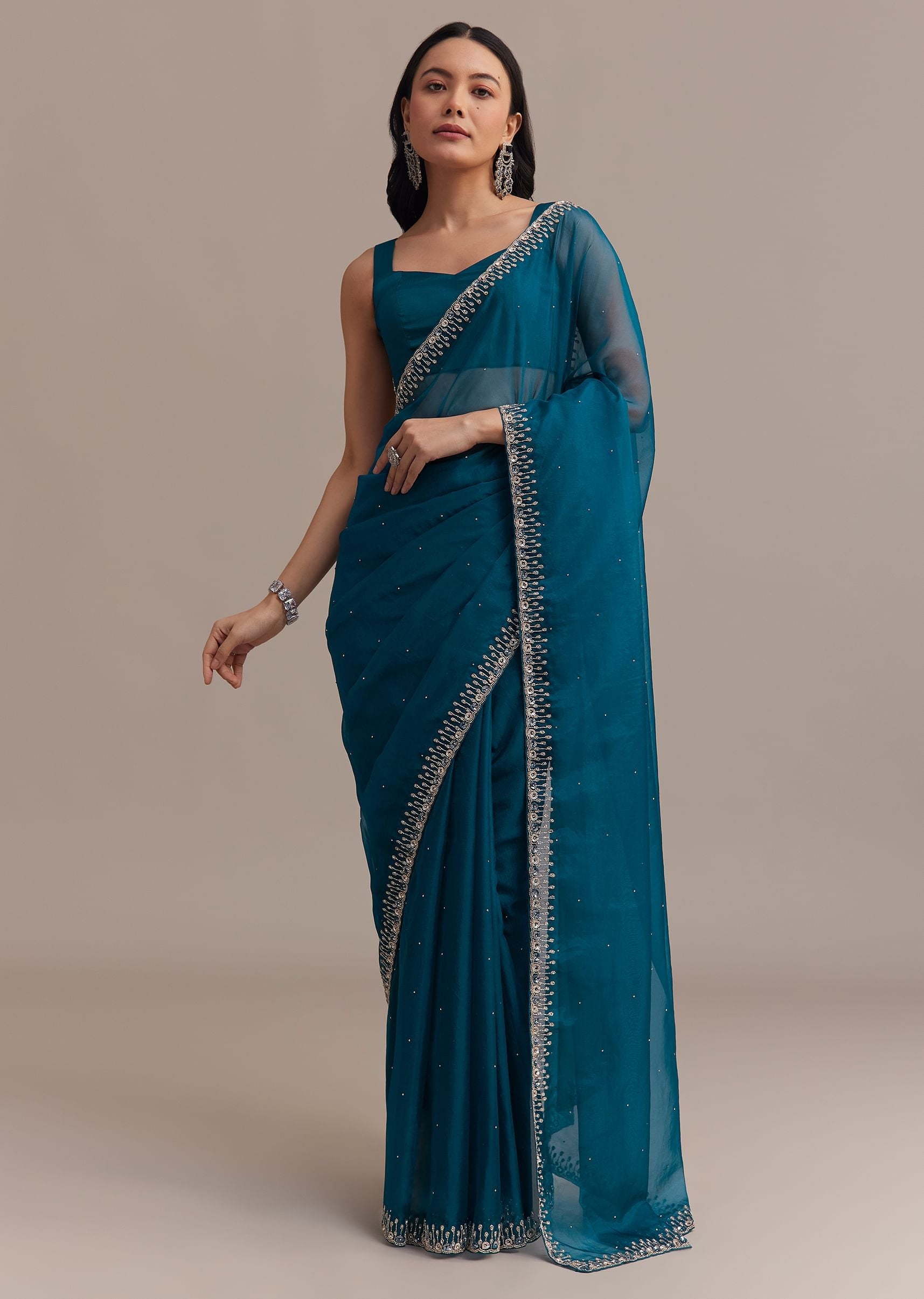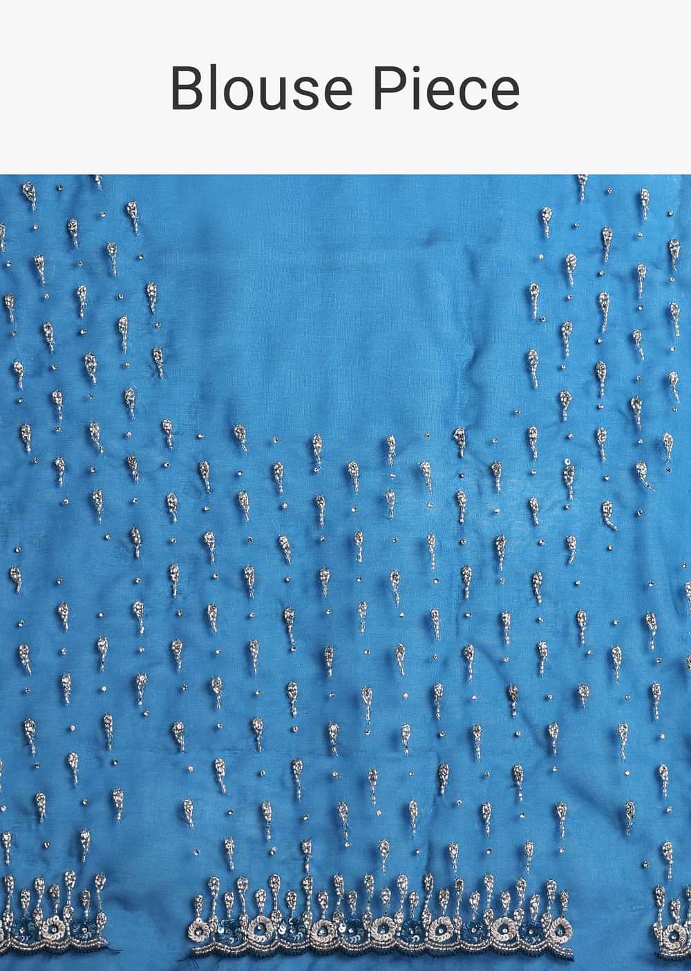 - Drape Yourself In The Ethereal Charm Of This Sapphire Blue Organza Saree Adorned With A Shimmering Sequins And Cutdanaembellished Border.