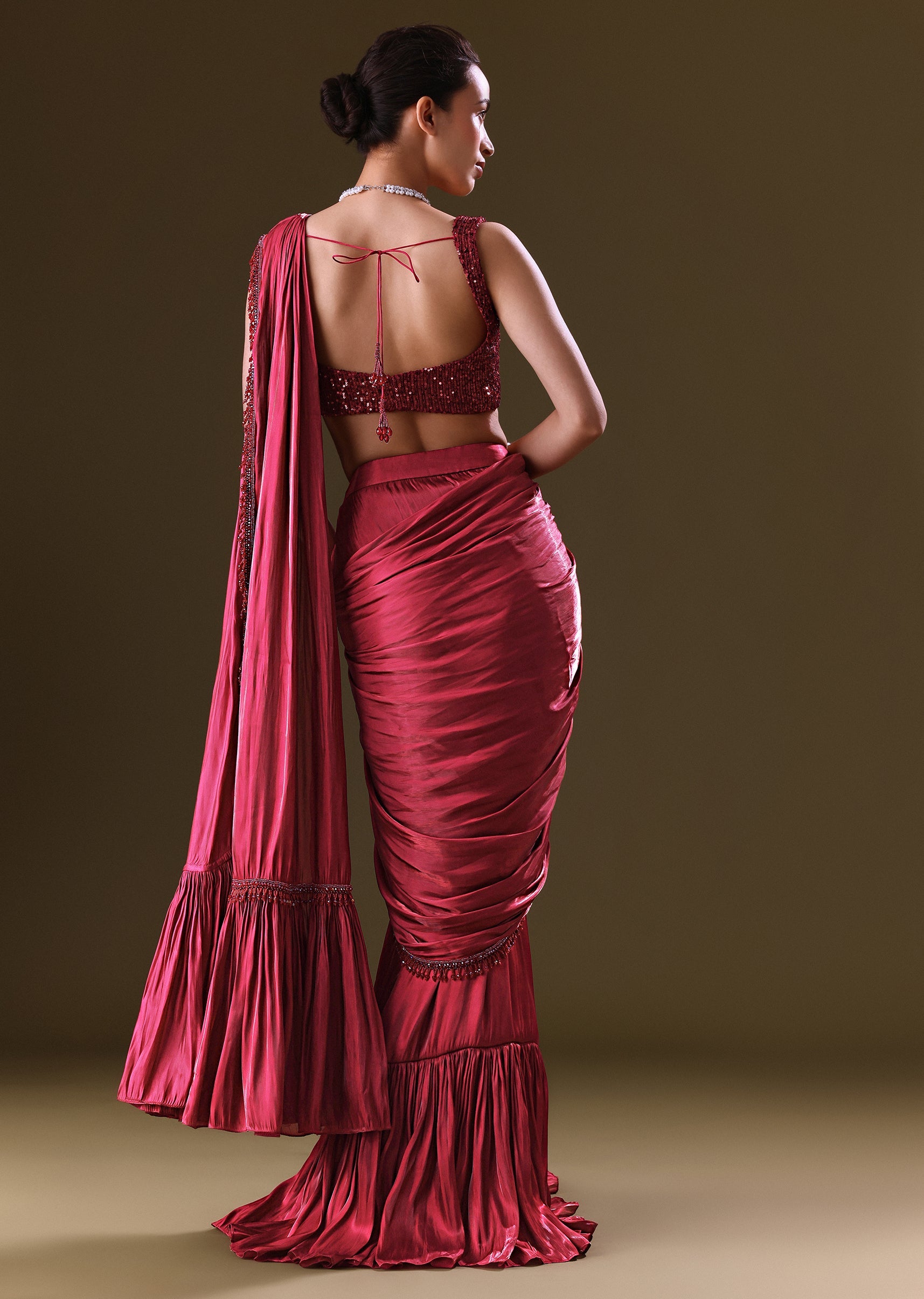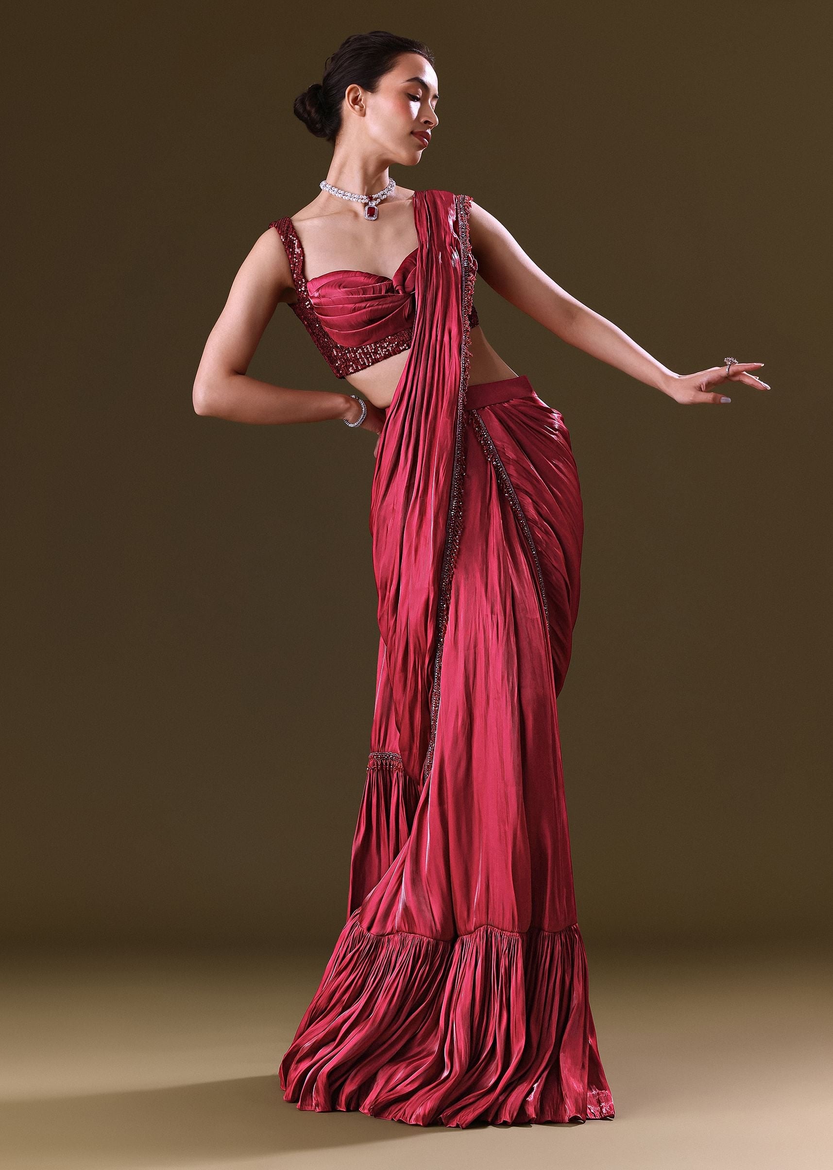 With this richly charming pre-stitched saree in scarlet red, you can enter a realm of ethereal beauty. Elegant organza fabric and sparkling sequins adorn the saree, while pleats and a twist technique at the bust give the V-neck blouse a contemporary edge. The pre-stitched frill saree with hanging lace accents gives it a whimsical look. This suit is ideal for formal occasions and weddings, as it guarantees that you will be noticed for its remarkable fusion of classic elegance. Awarded as the Most Trusted Brand, we're delivering styles you love, just as promised.