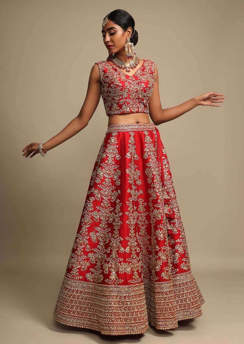 Scarlet Red Lehenga Choli In Raw Silk With Zari Embroidered Feminine Floral Kalis