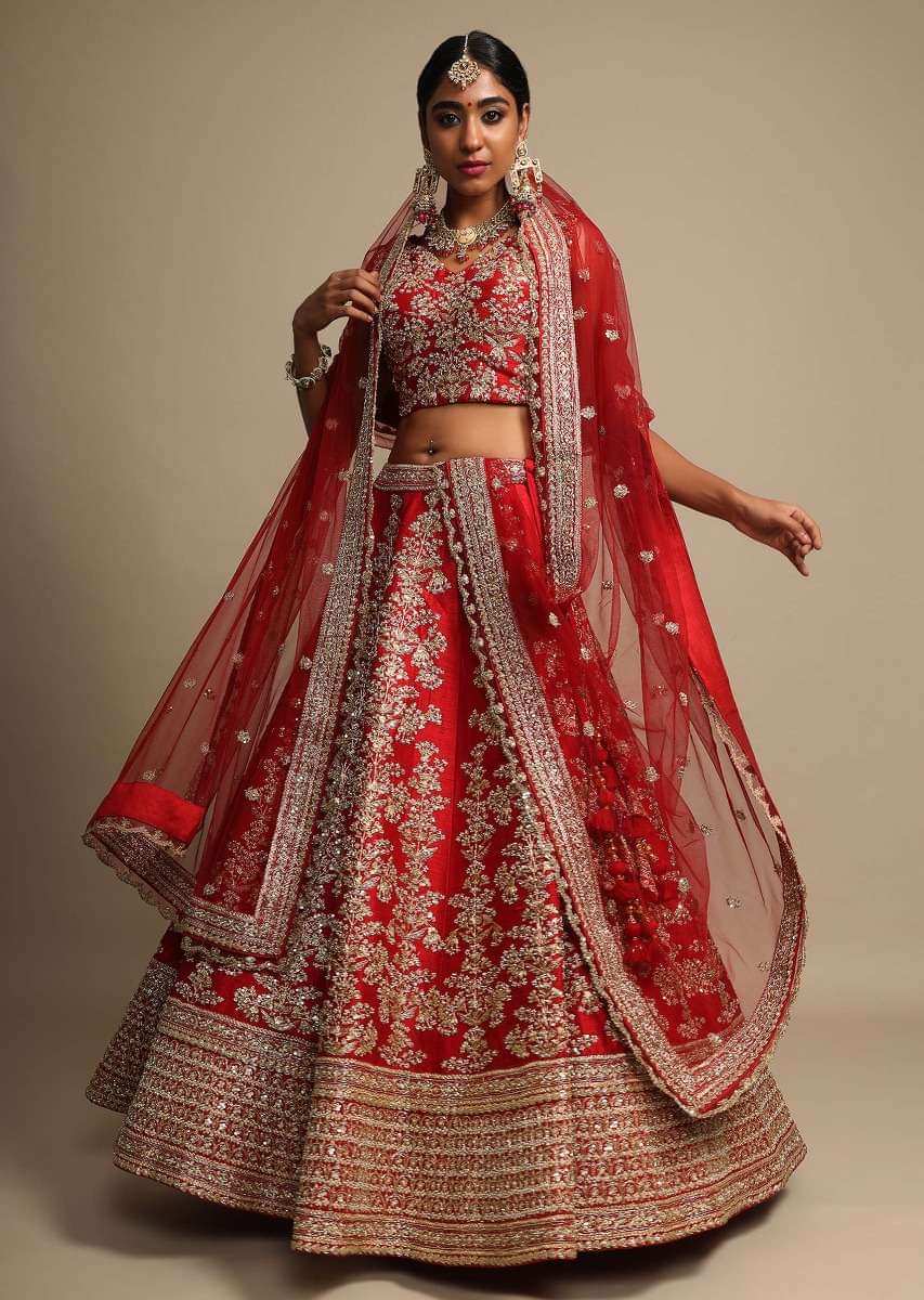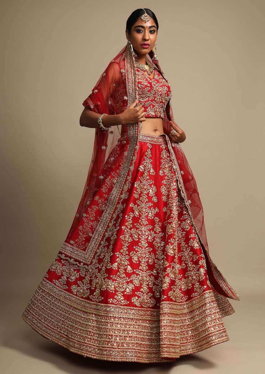 Scarlet red raw silk lehenga that will steal you heart with intricate zari embroideries in feminine floral kalis. Highlighted with cut dana, moti and sequins in scalloped design on the hemline that adds a bridal bling to the outfit. This bridal lehenga is paired with an unstitched choli in raw silk with zari embroidered floral jaal and a net dupatta with butti work. The piece comes with cancan. Awarded As The Most Trusted Brand We'Re Delivering Styles You Love Just As Promised.