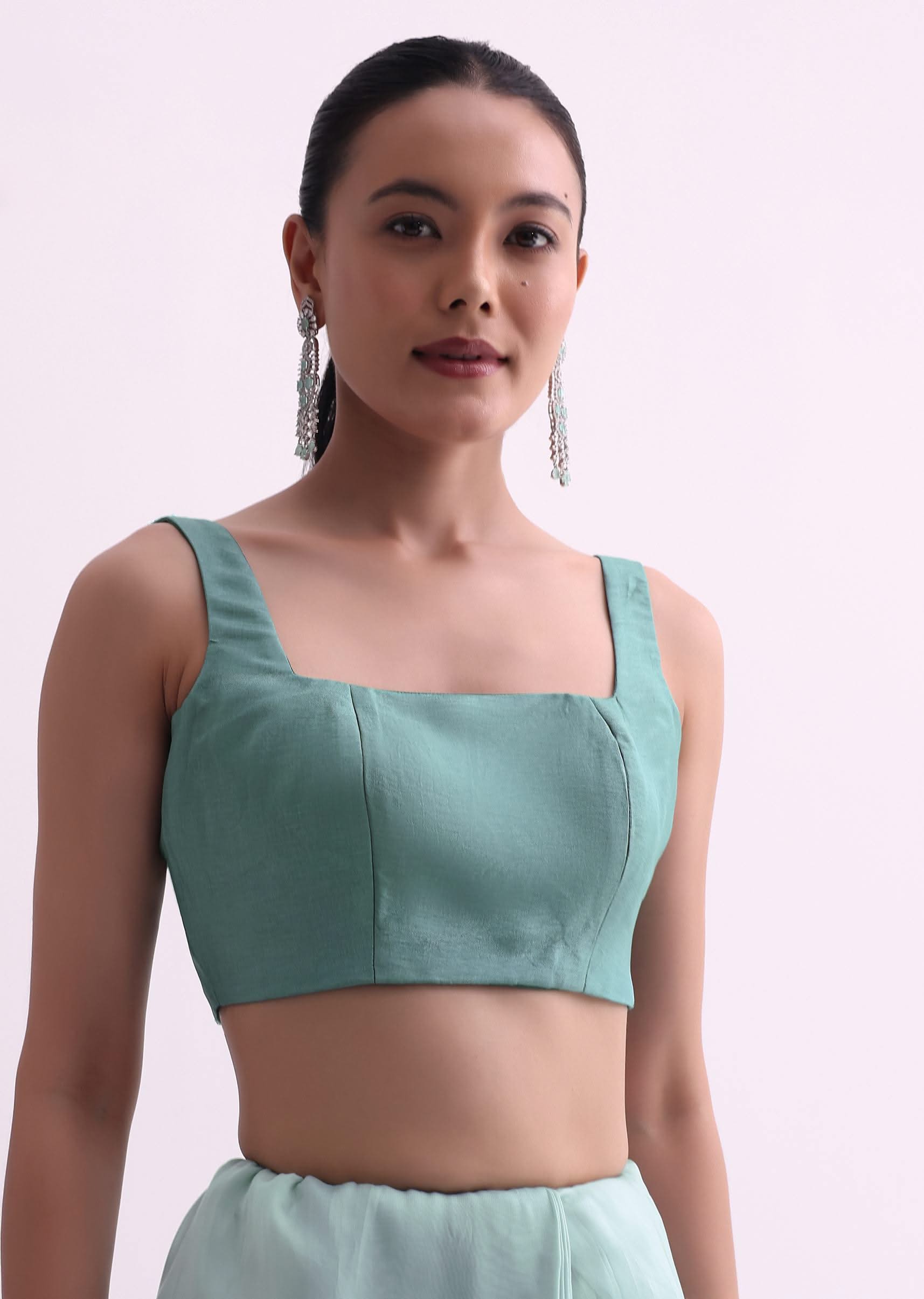 A musthave style for yearround special occasions is this sheer elegant saree. Crafted to perfection in a captivating seagreen hue it is tailored from luxe satin fabric. Boasting an ombre... More Product Details