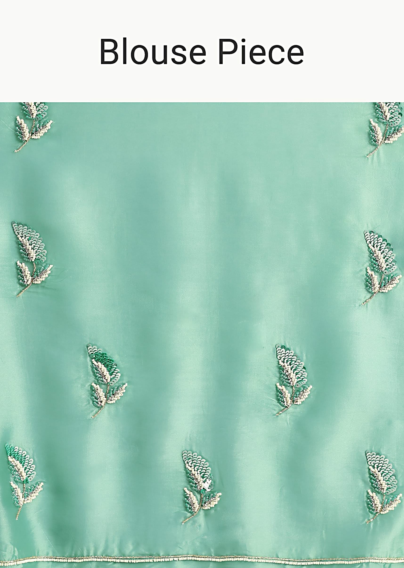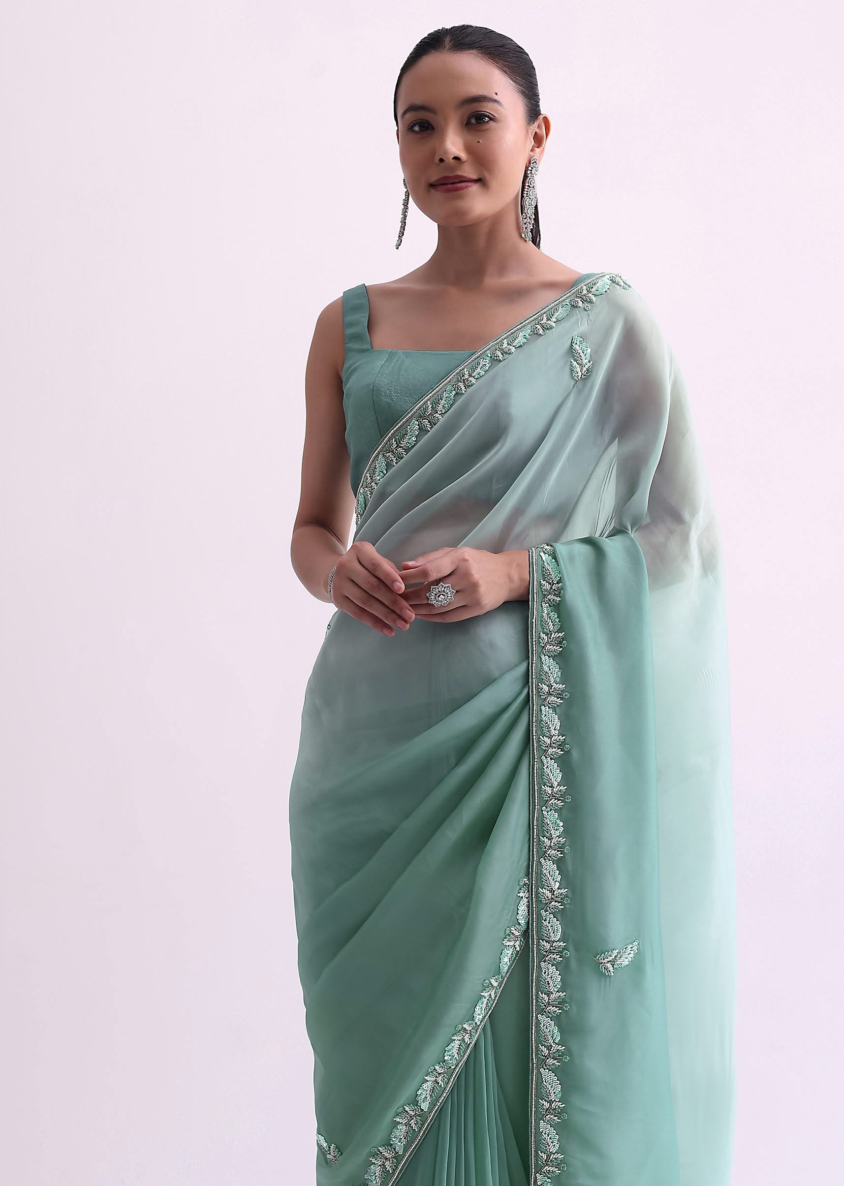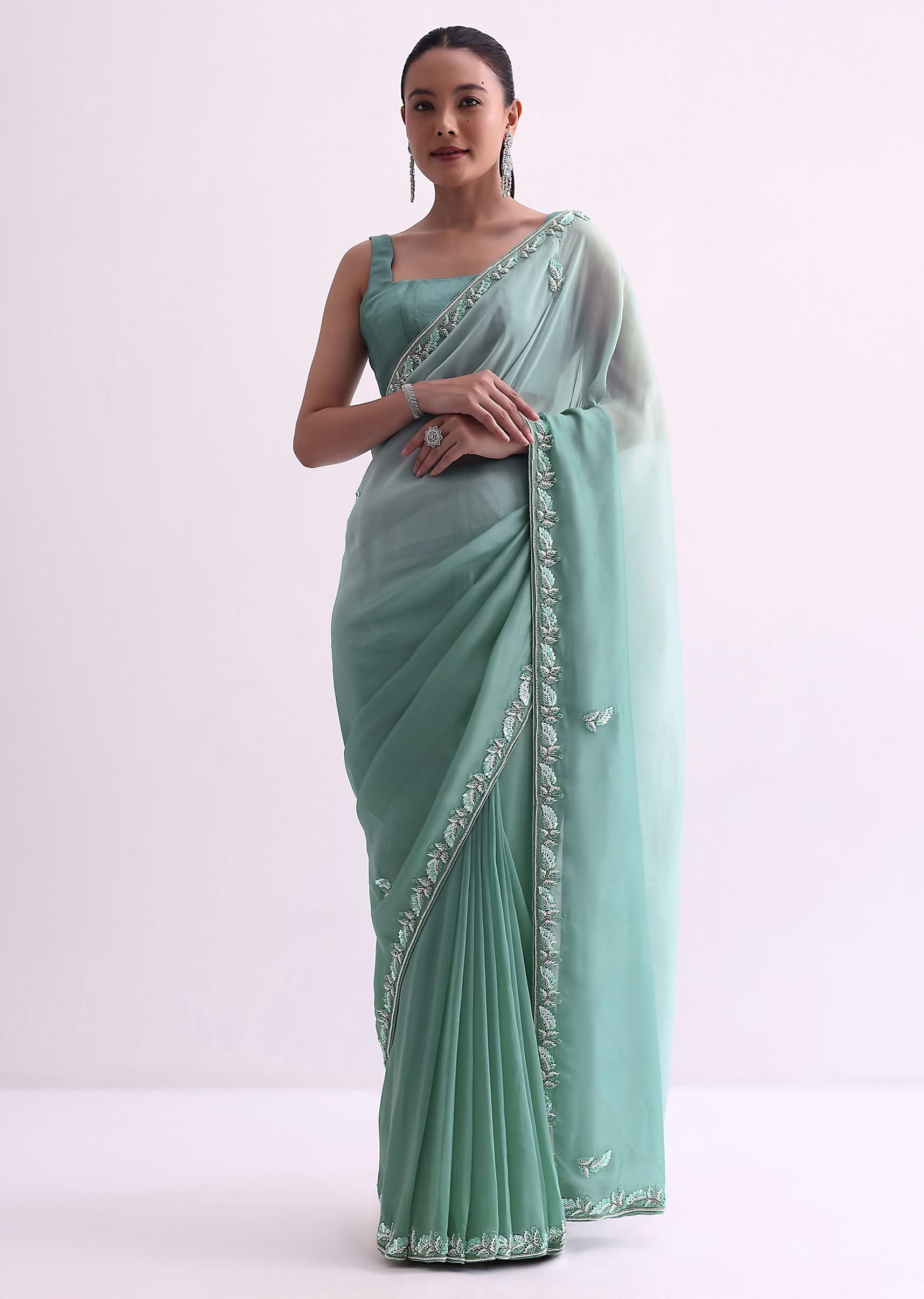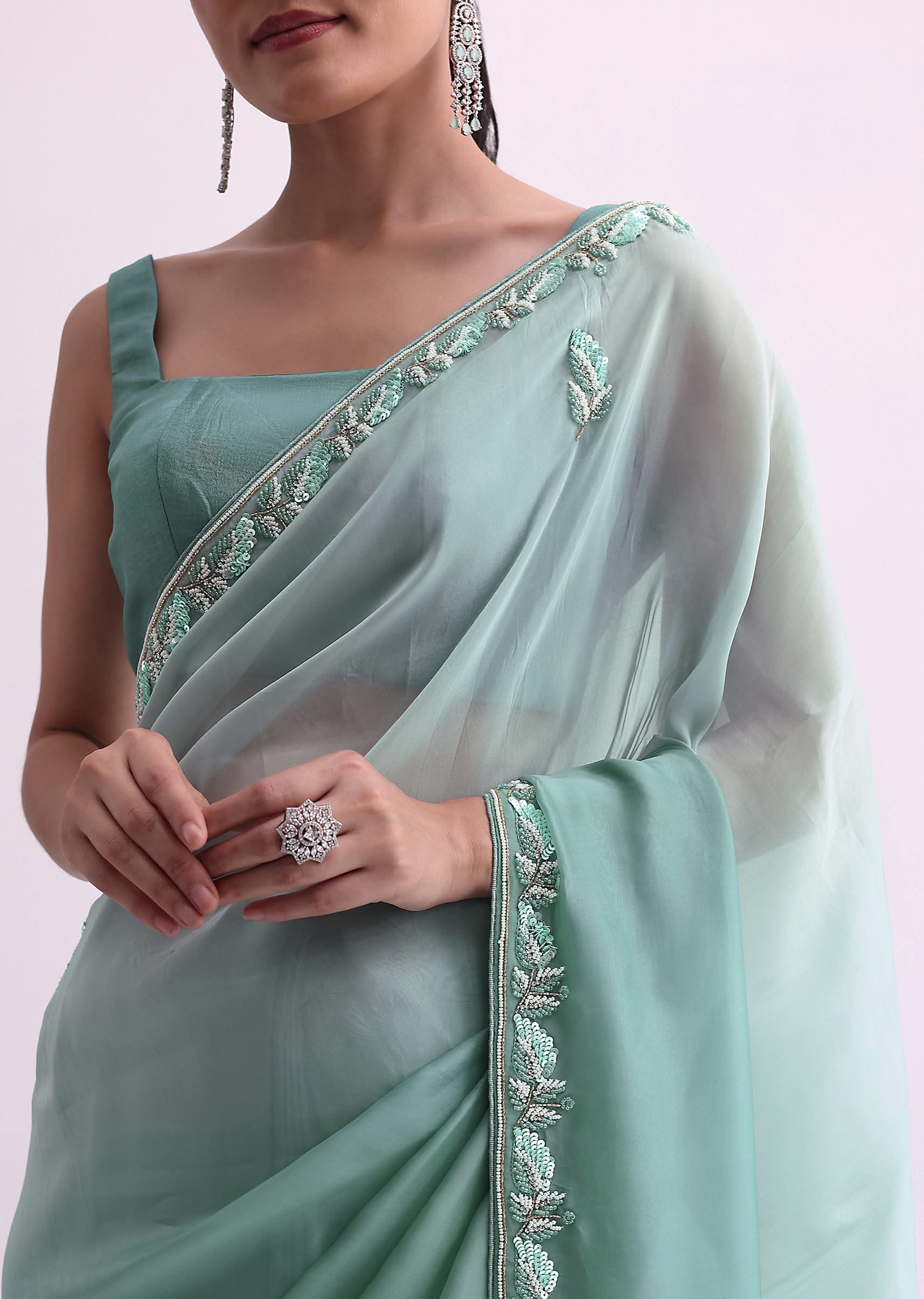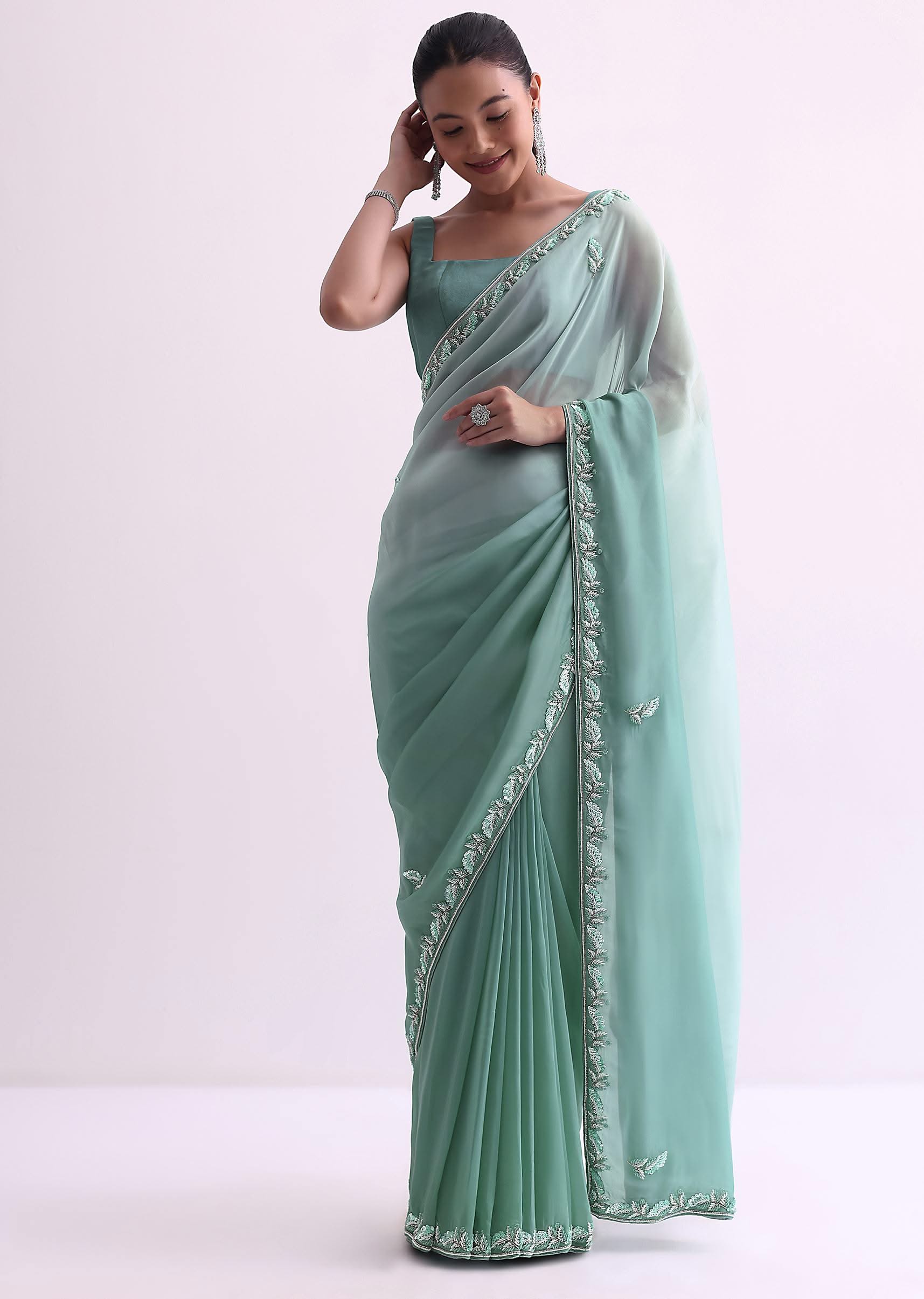 A musthave style for yearround special occasions is this sheer elegant saree. Crafted to perfection in a captivating seagreen hue it is tailored from luxe satin fabric. Boasting an ombre shaded desgin it is adorned with shinny sequin work on the border and is paired with an unstitched blouse fabric. Awarded as the Most Trusted Brand, we're delivering styles you love, just as promised.