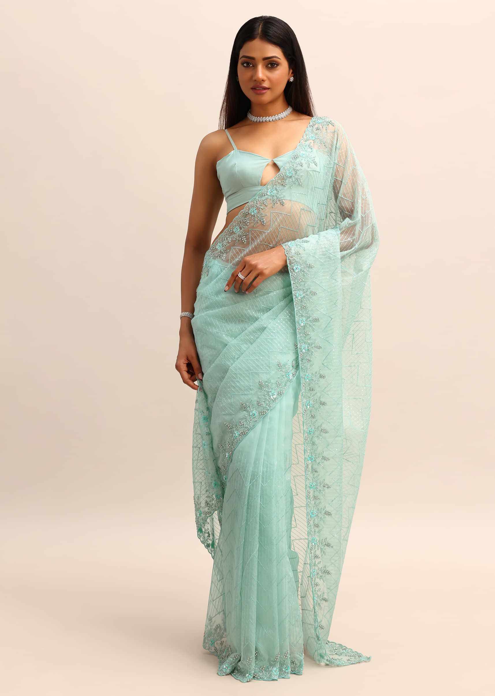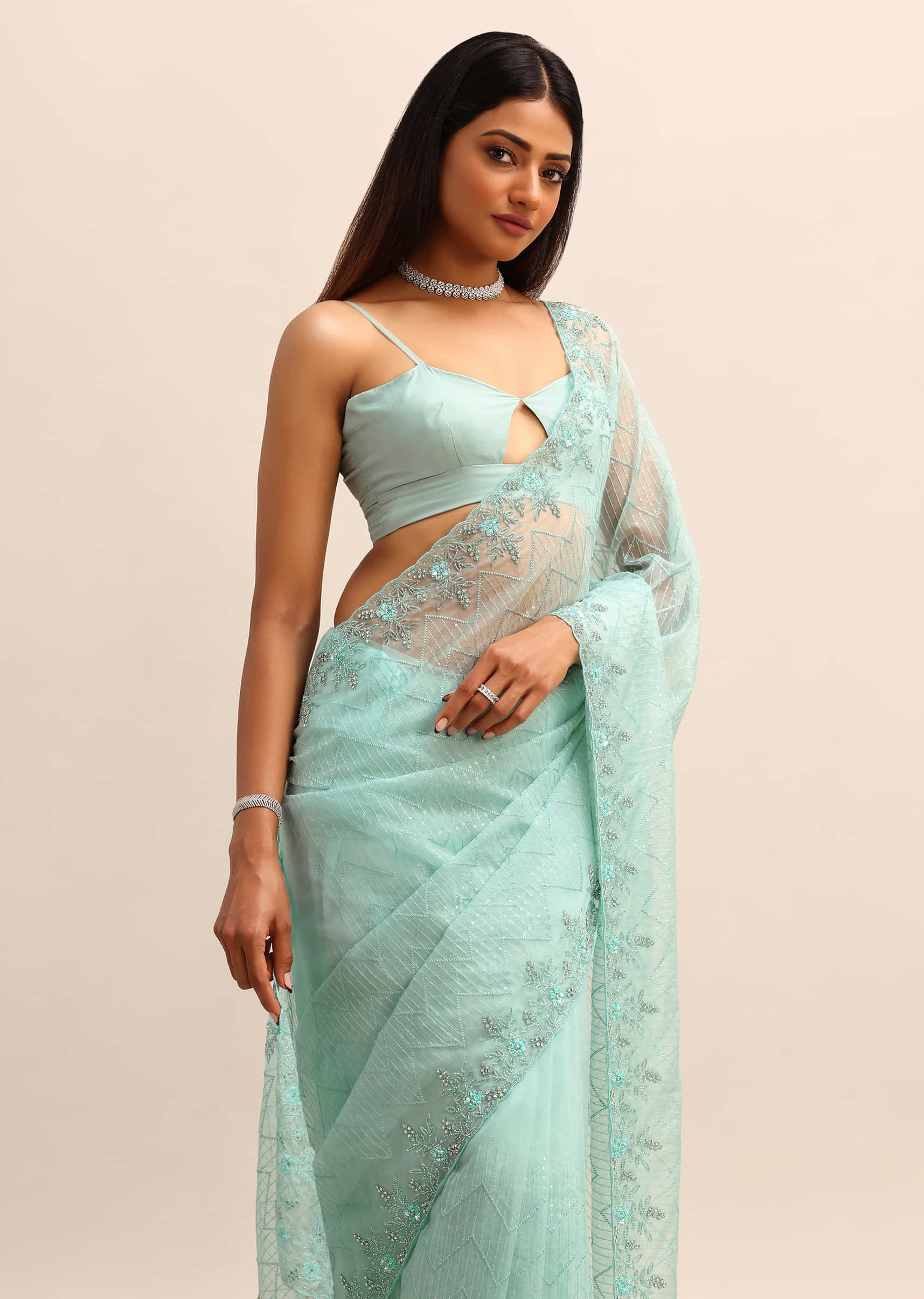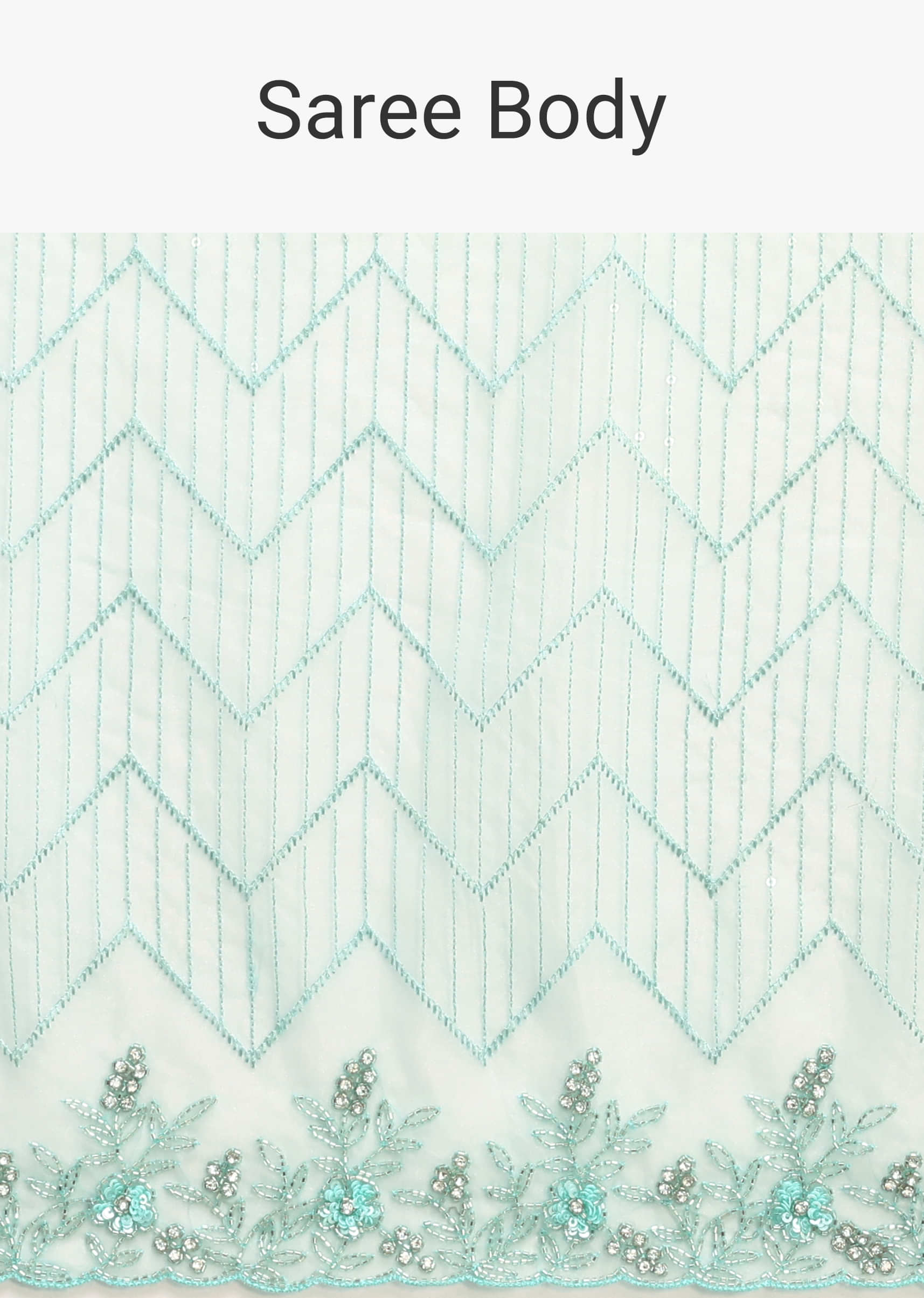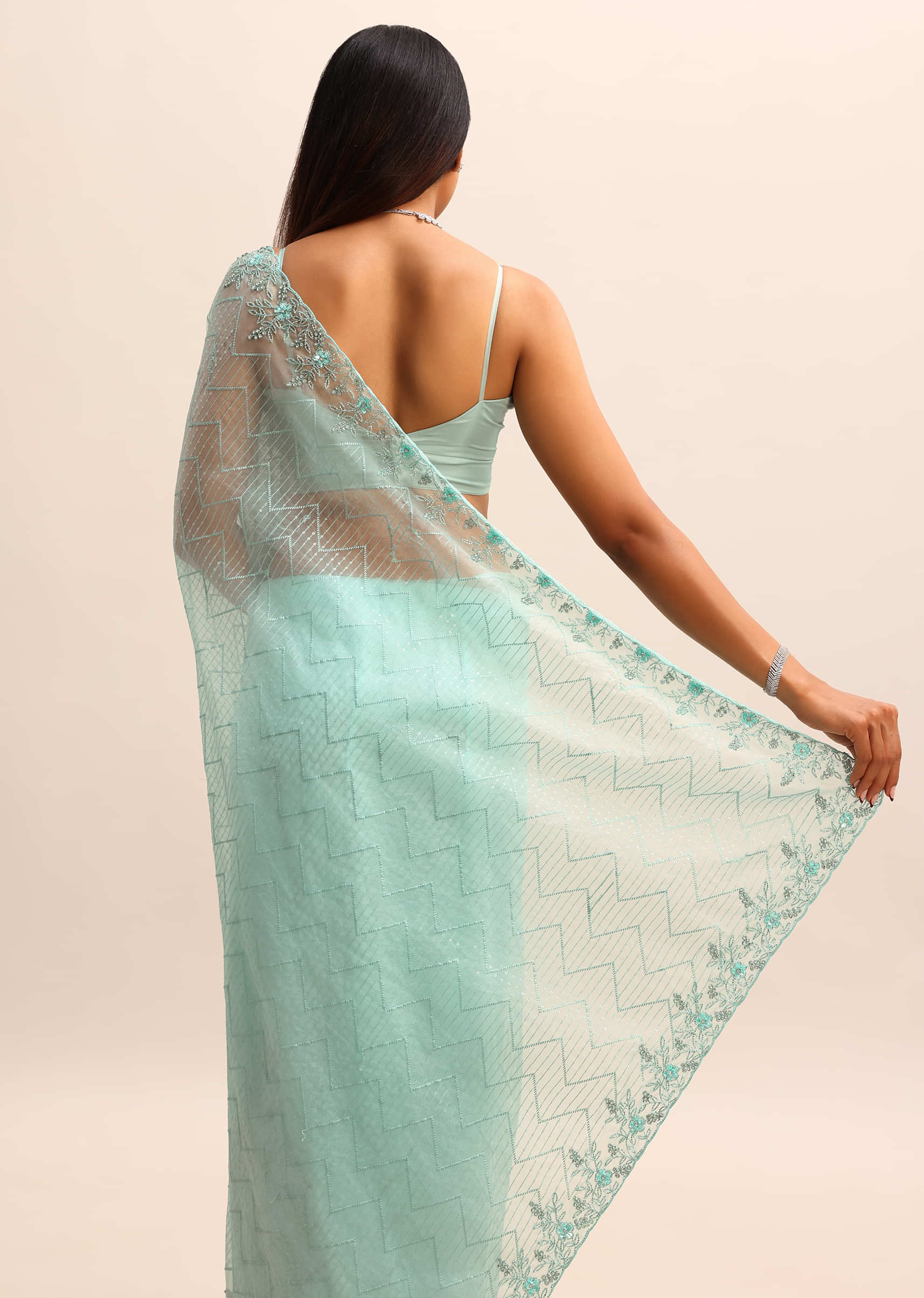 Sea Green Organza Cutdana Saree And Sequins Border Pallu With Unstitched Blouse