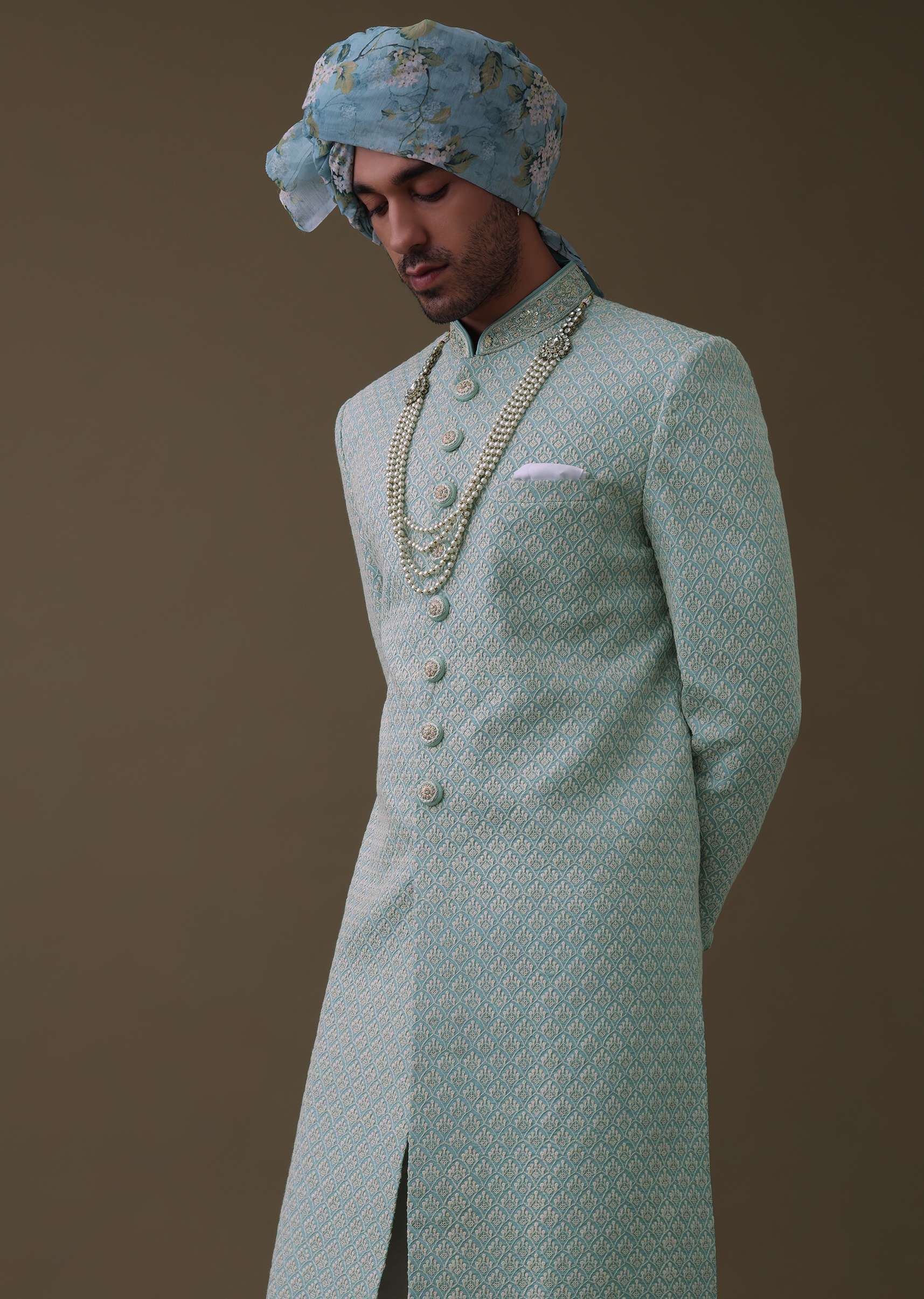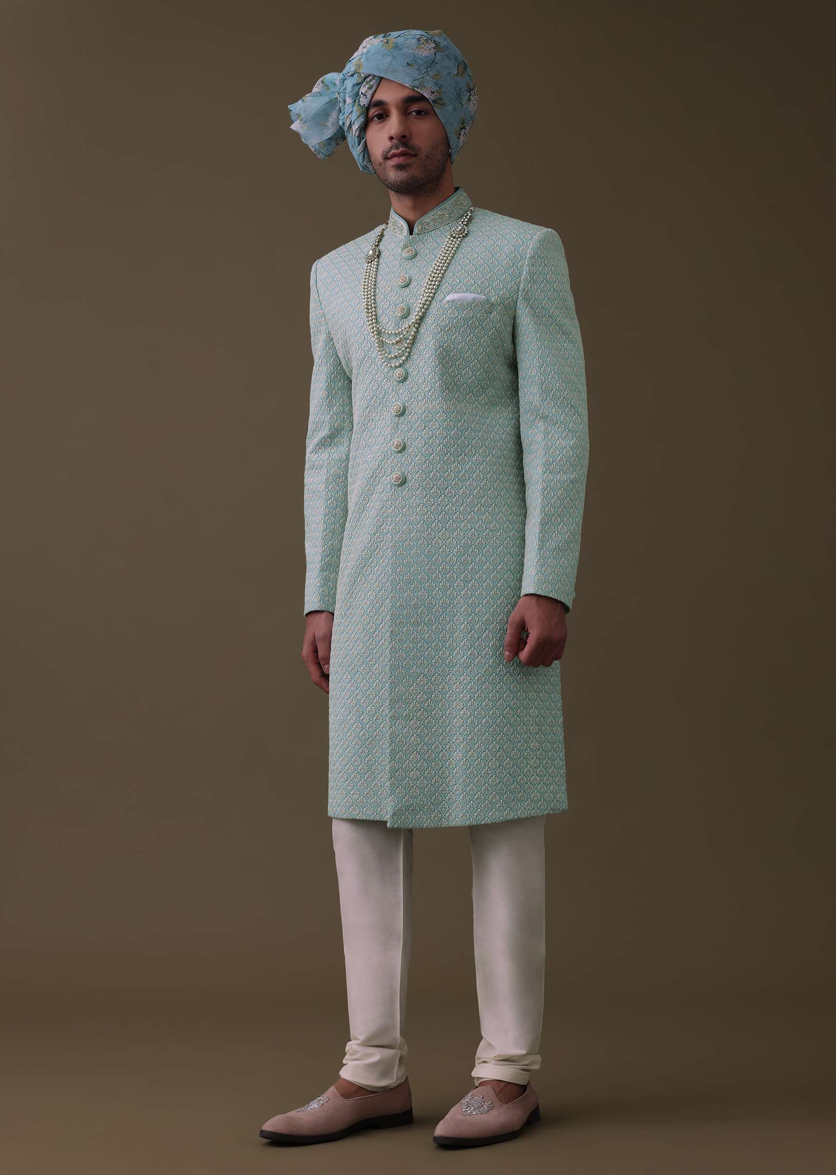 Sea Green Sherwani Set In Silk With Lucknowi Embroidery