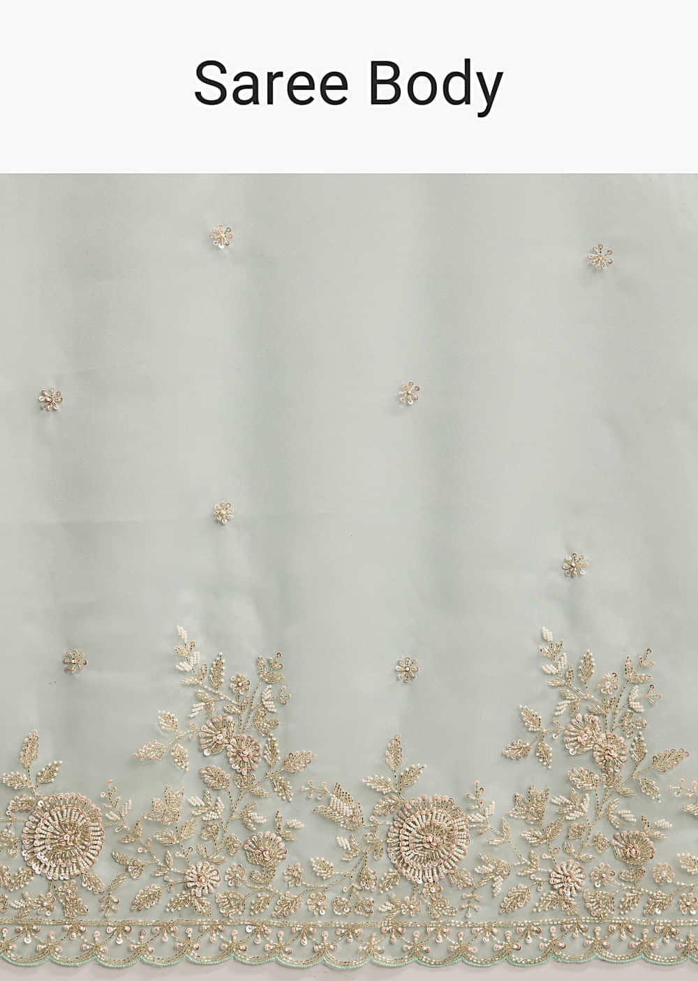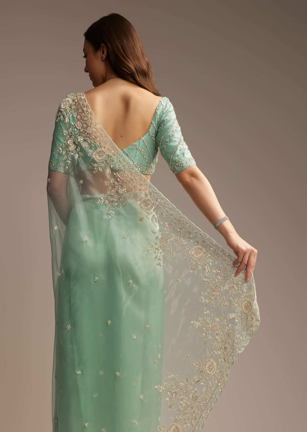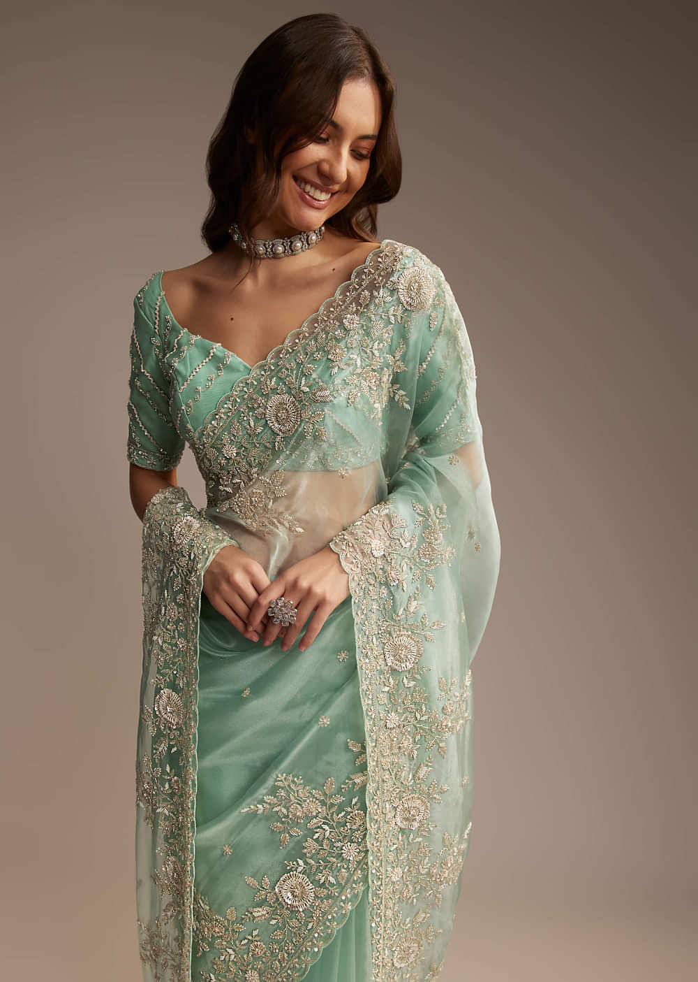 This sea green tissue saree brings a refreshing spin to festive dressing with its intricate floral embroidery highlighted by shimmering cutdana, sequins, and beadwork. The scalloped border adds textural dimension, making each drape feel distinctive. Paired with a matching heavily embroidered blouse, this ensemble strikes the right note for ceremonies with an upbeat vibe, making it ideal for engagement evenings, mehendi rituals, or sangeet nights. Awarded as the Most Trusted Brand, we're delivering styles you love, just as promised.