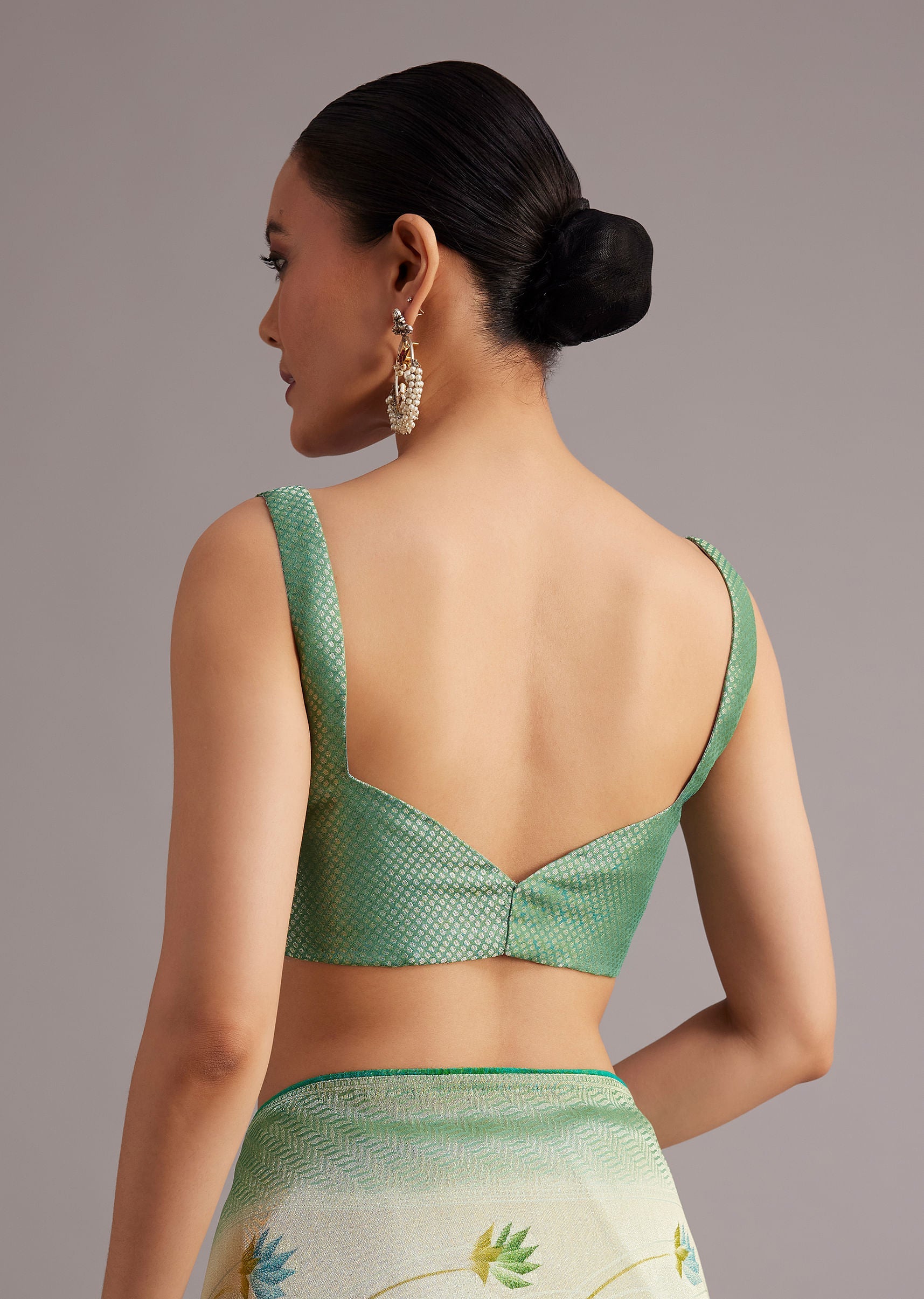 Sea Green Tissue Silk Floral Motif Saree With Contrast Pallu And Border