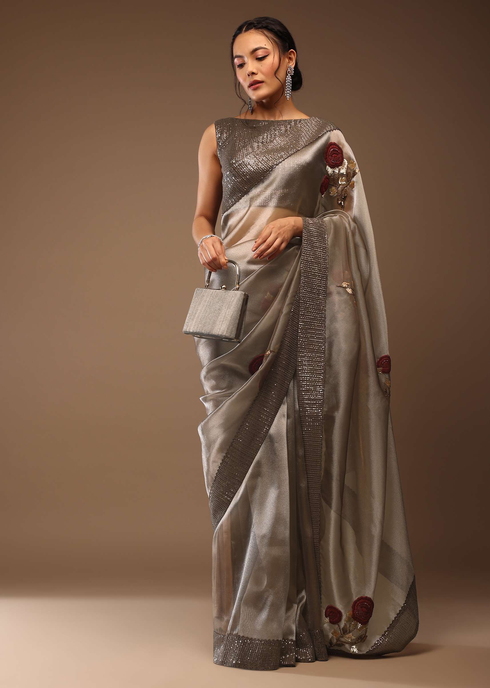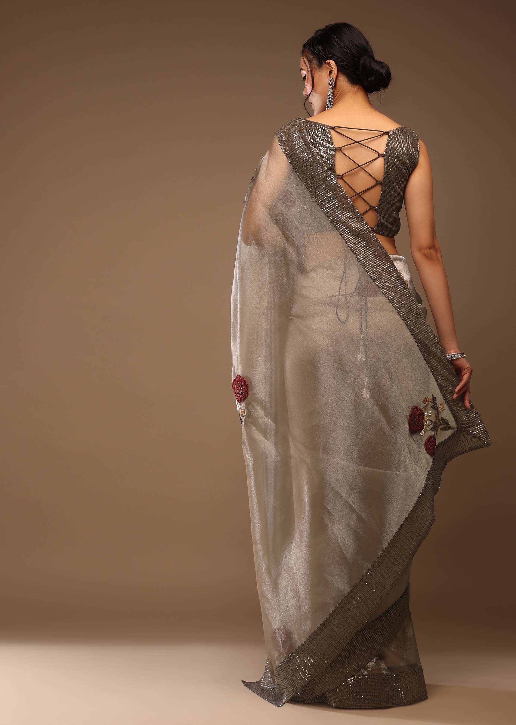 Silver And Cedar Brown Saree In Tissue Organza With Multi Colored Sequins Embroidered Motifs