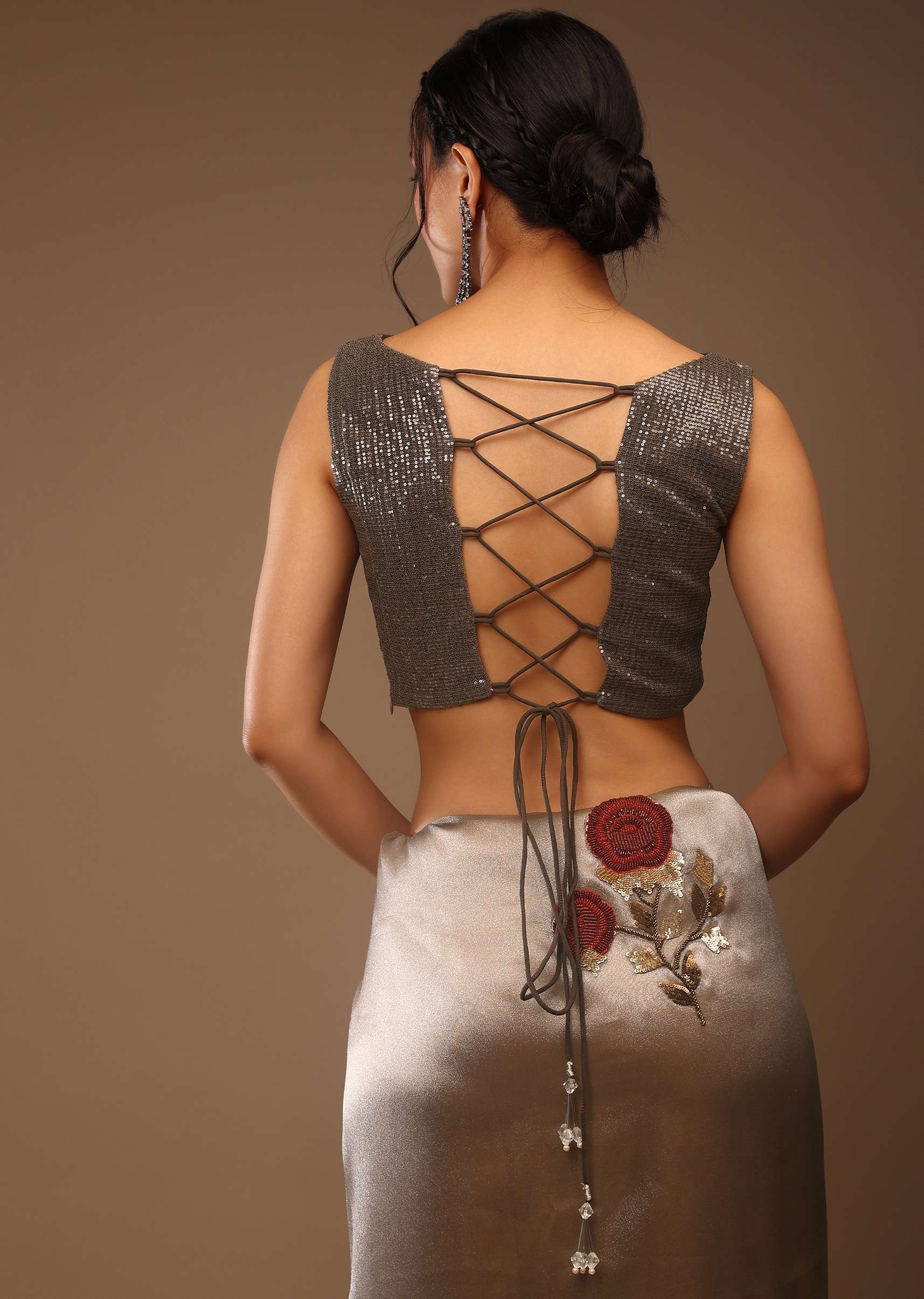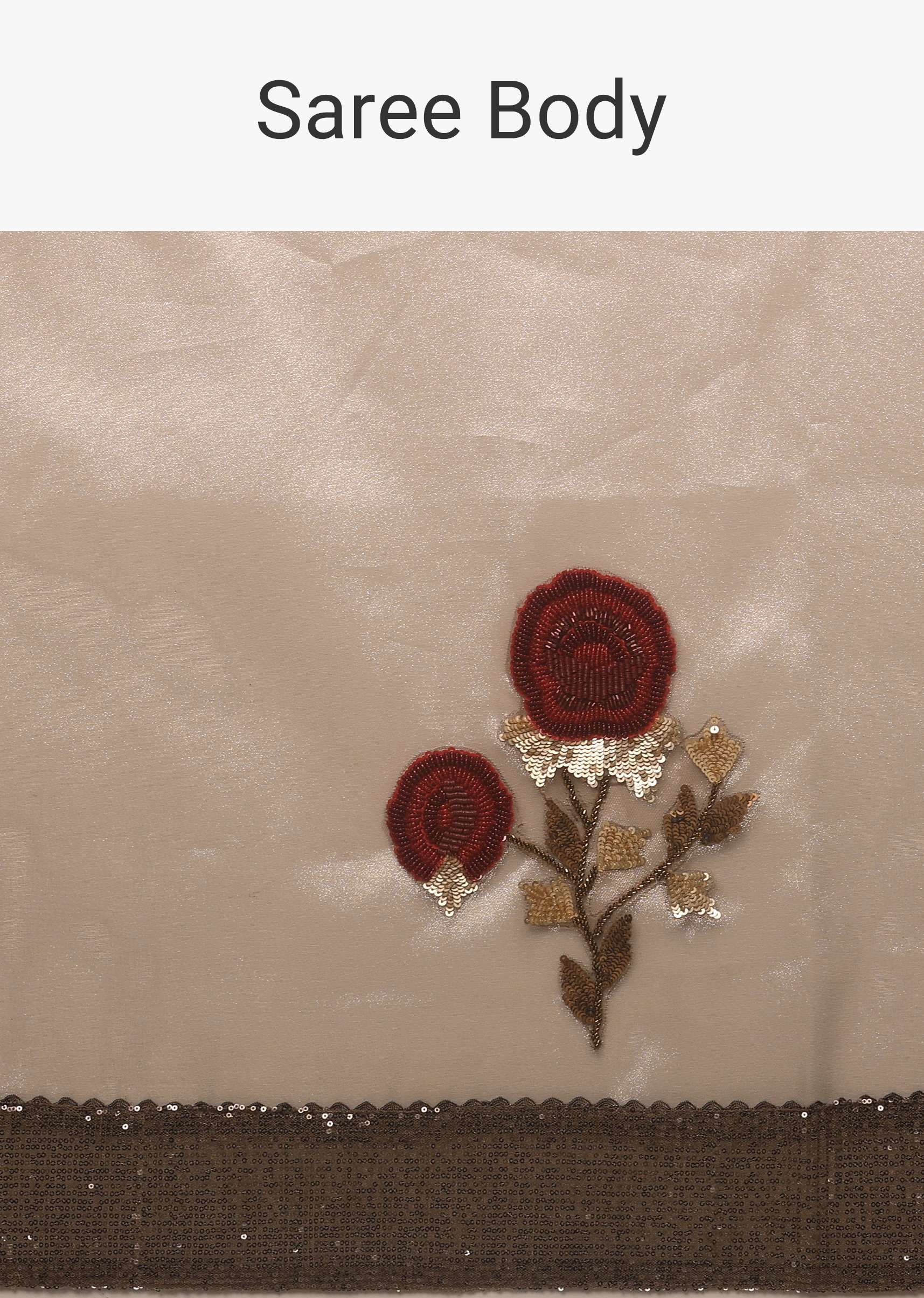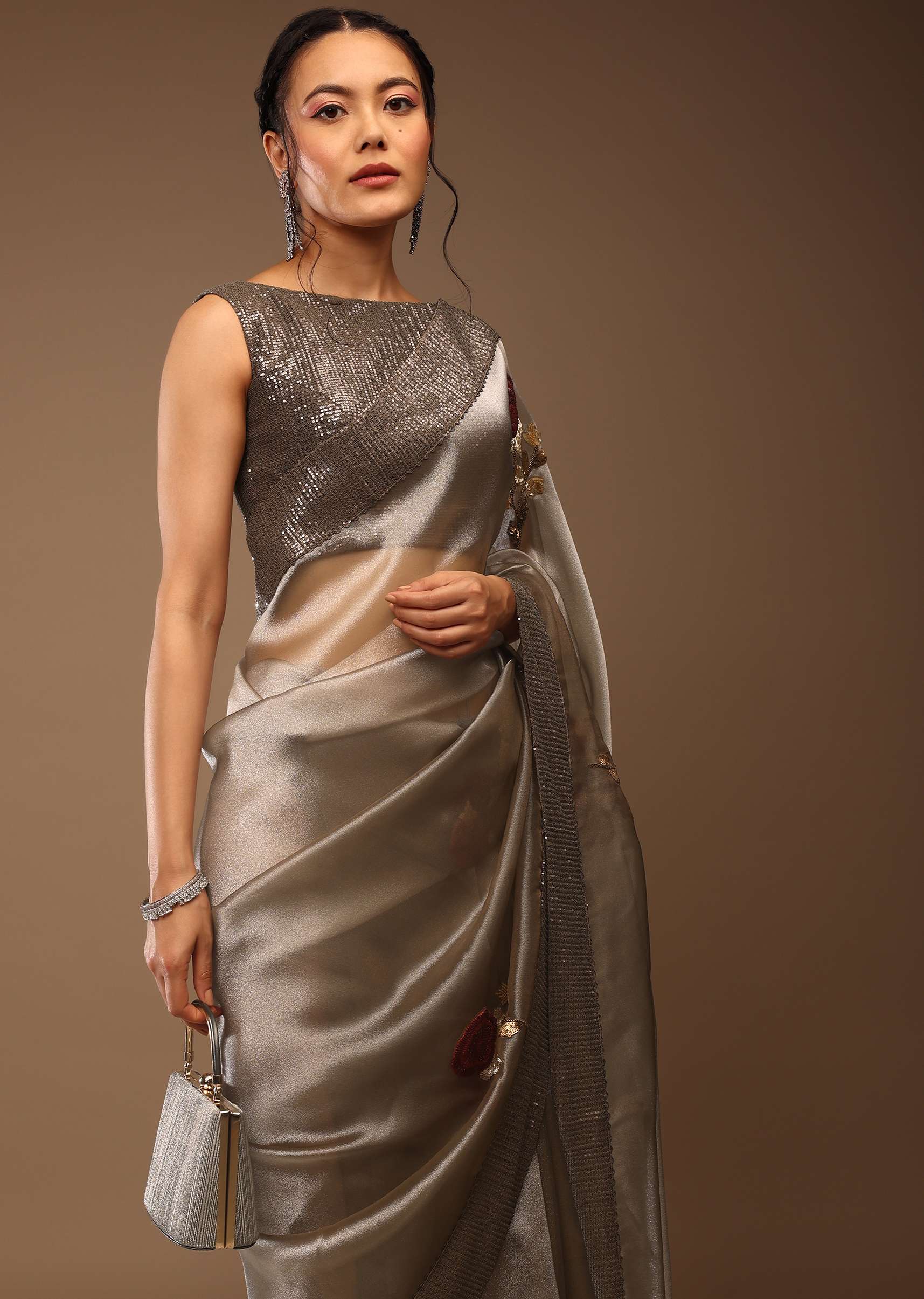Silver and cedar brown saree with an unstitched blouse.Crafted in tissue Organza fabric with multi-colored sequins and moti adornment motifs all over.It comes with an unstitched blouse.If you're looking traditional yet luxurious apparel for a puja then you can opt for this piece.Style it with a hair bun, dangling silver accessories with Sling back heels and walk with the dash of confidence.Model height - 5'10 bust - 32 inches wearing size Small. Awarded As The Most Trusted Brand We'Re Delivering Styles You Love Just As Promised.