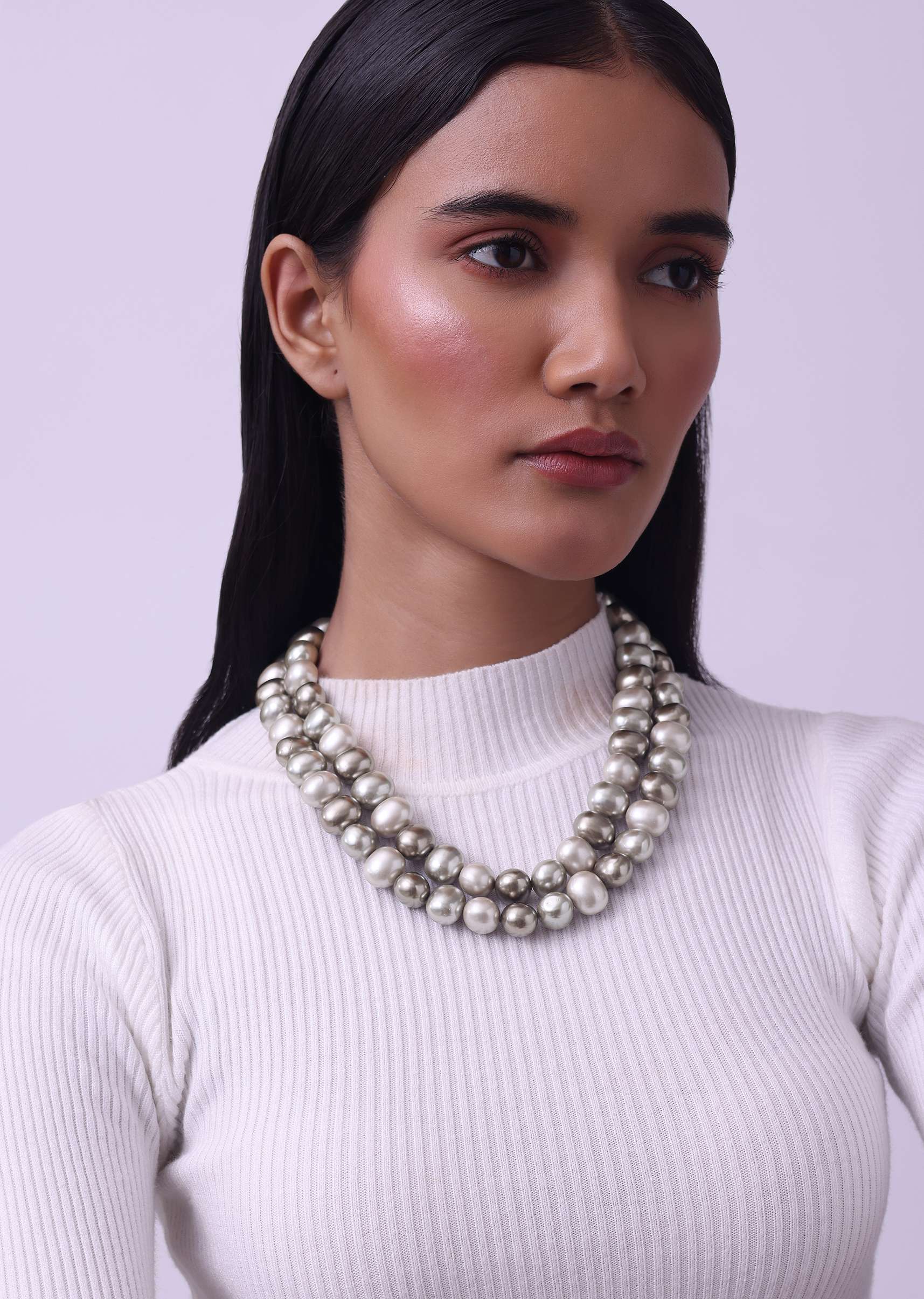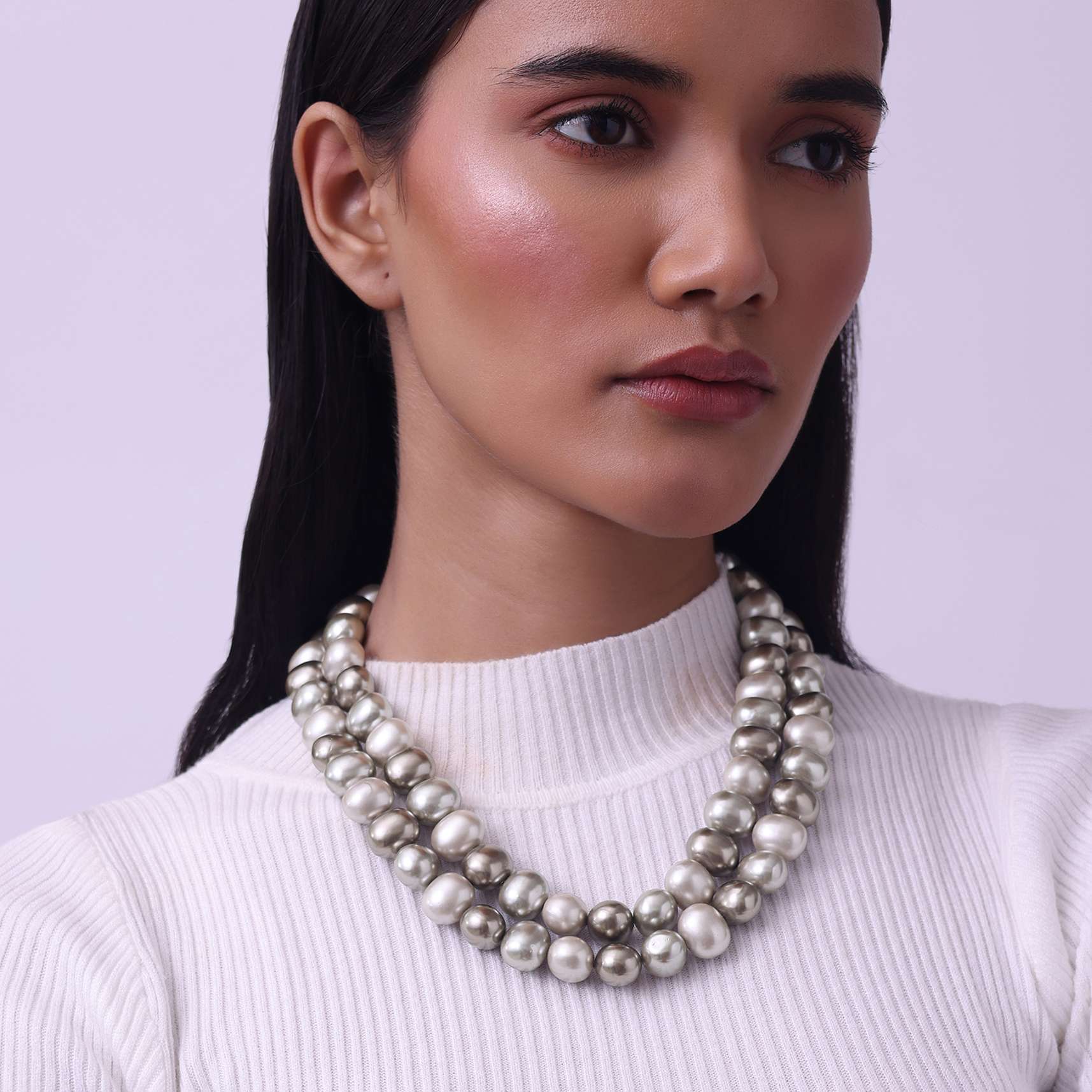 Elevate your jewelry collection with this exquisite two layered mother of pearls mala. Crafted with meticulous attention to detail this stunning piece features two layers of lustrous mother of pearls in stunning silver and grey tones.EVENT - Perfect for all festive and formal occasions.Avoid contact with water chemicals harsh liquids perfumes etc. Do not wear this piece of jewelry while showering gym swimming etc. Please keep the product away from moisture and humidity when not in use. Slight variations in design may vary. Being rewarded as the most trusted brand our customers believe we deliver the same styles as promised on the website. Awarded as the Most Trusted Brand, we're delivering styles you love, just as promised.