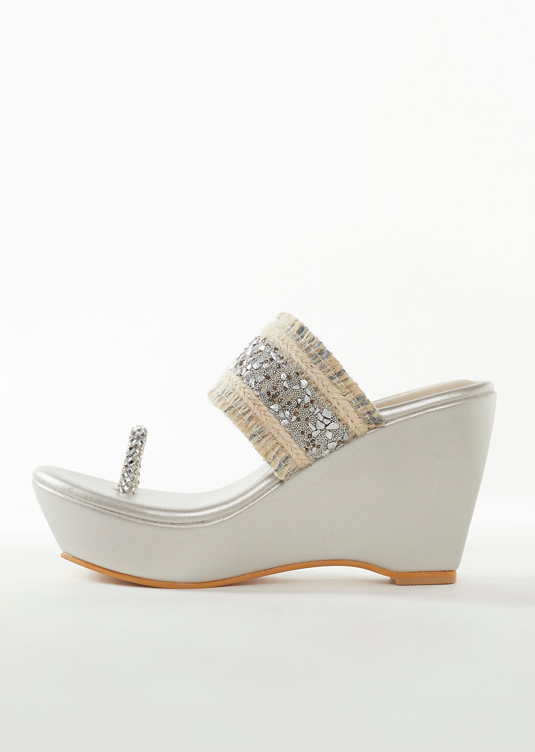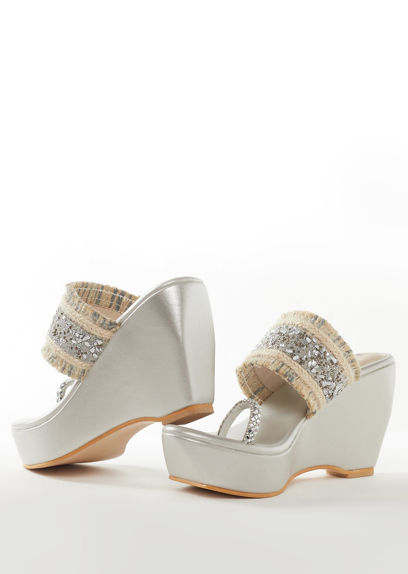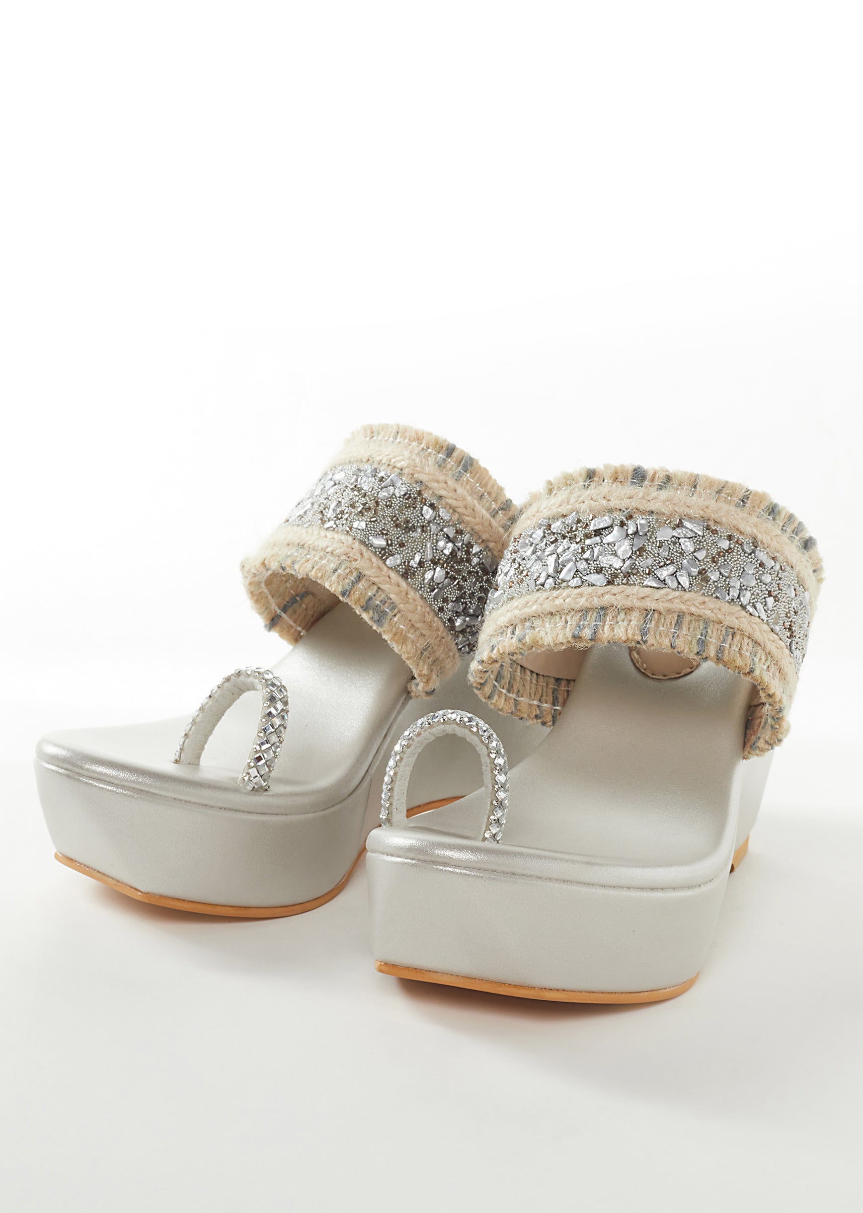 Silver Faux Leather Womens Footwear Embellished Detail Work