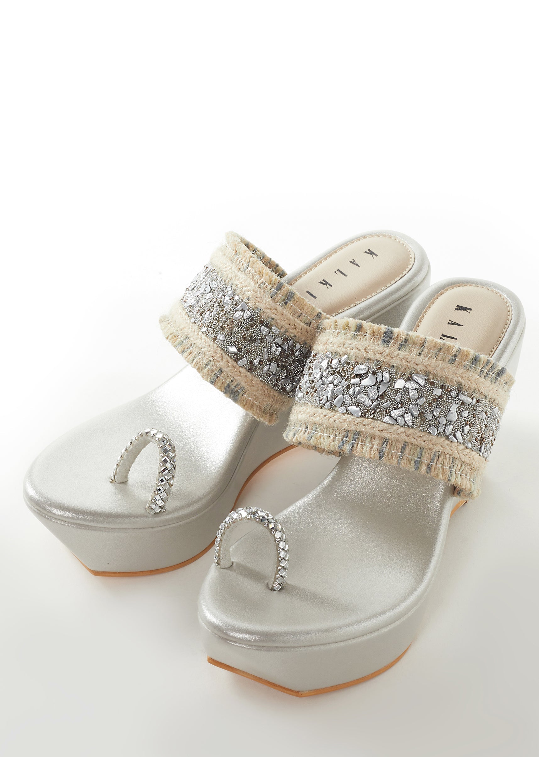 Designed for festive elegance, these silver footwear pieces bring a refined shimmer perfect for receptions and wedding celebrations. Crafted in smooth faux leather, the design features embellished detailing that adds... More Product Details