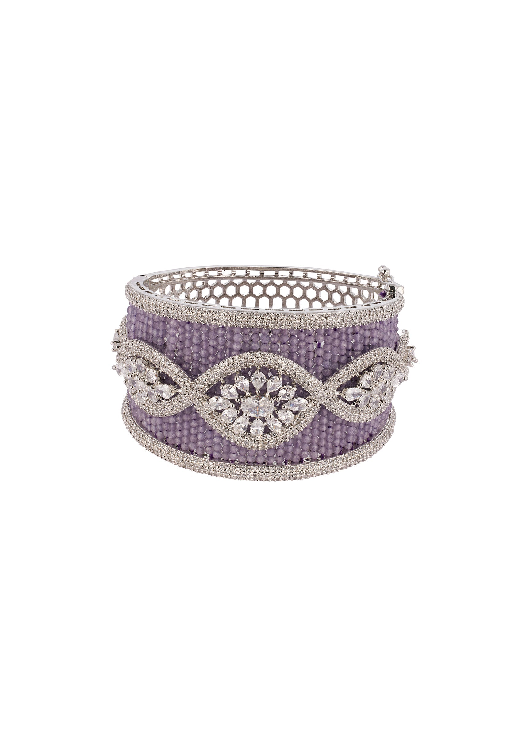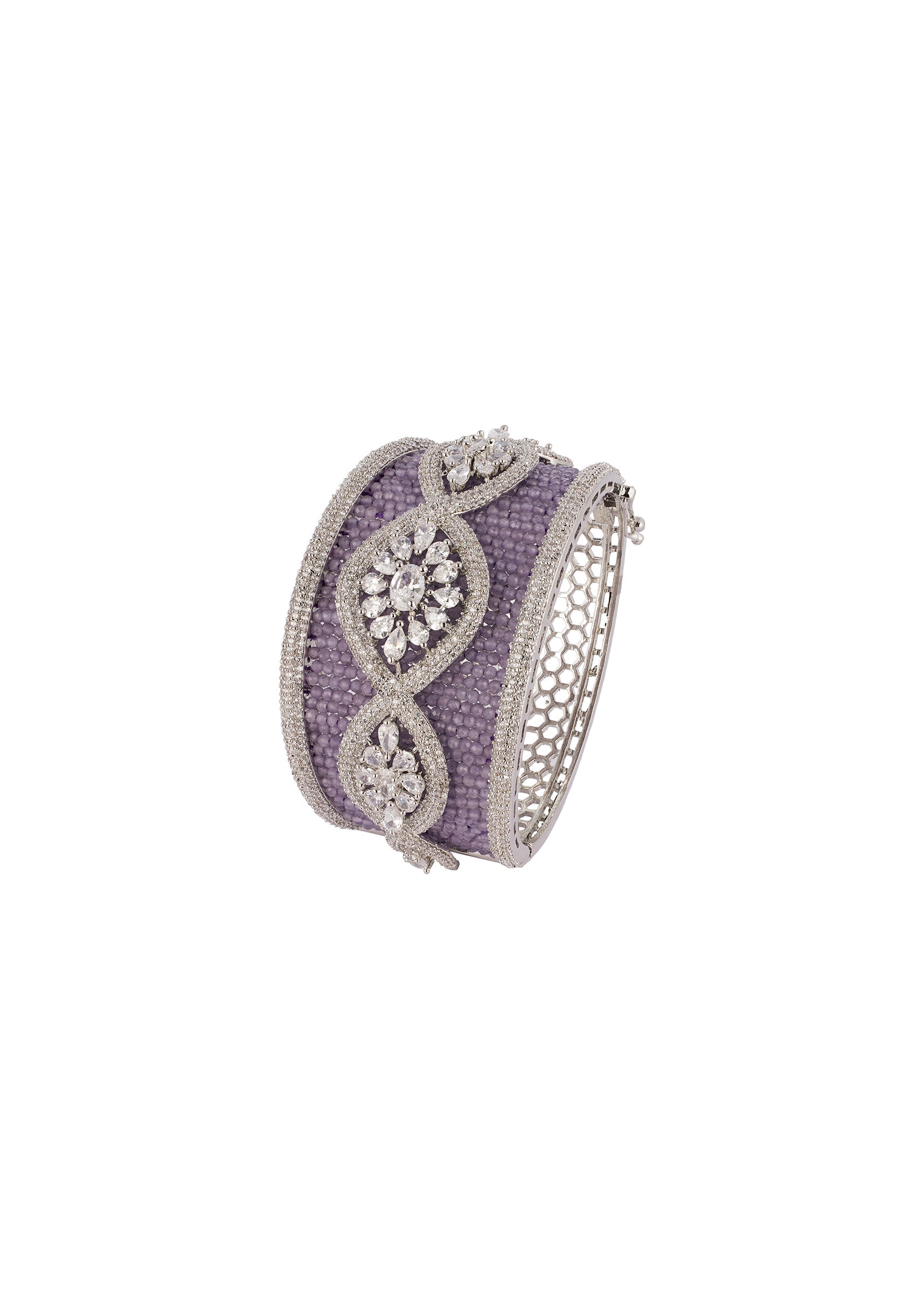 Pair this bracelet with a pastel or jewel toned saree, lehenga, or anarkali to highlight the purple accents and statement style design.