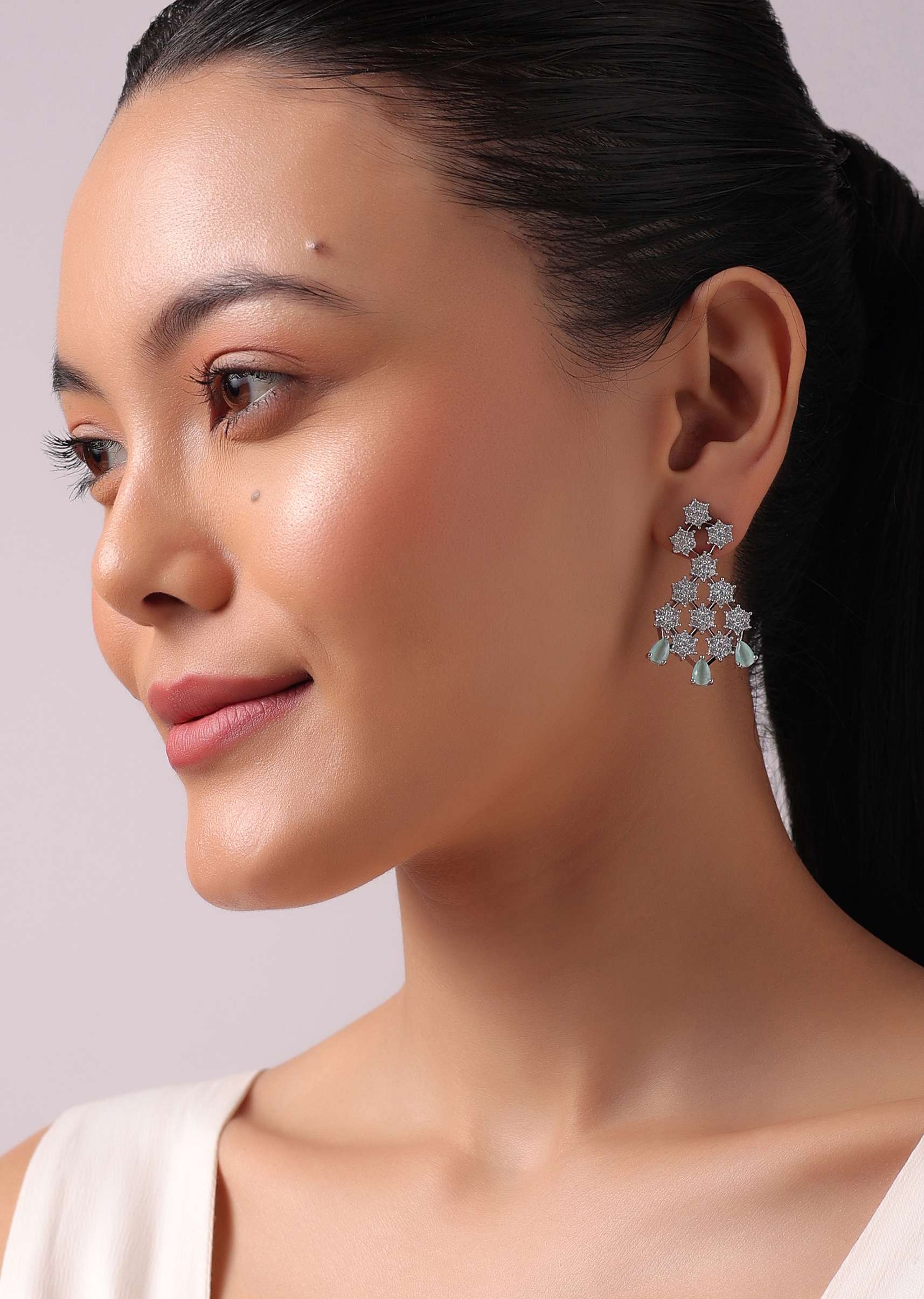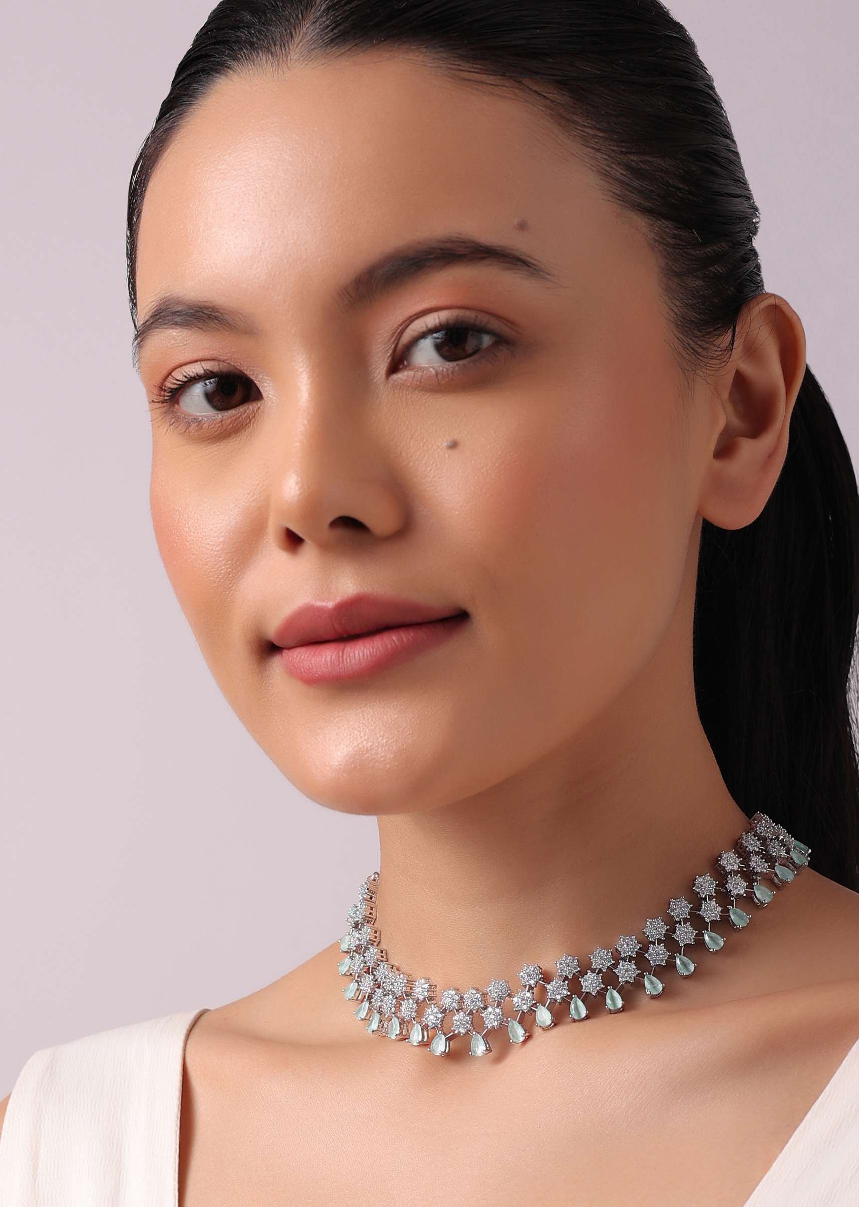 Ideal to display a modish look with a contemporary twist. This choker set a stunning example of excellent craftsmanship. Decked with white synthetic stone it comes embedded with aqua-green pear shaped multi-drops. Teamed with danglers this addition is versatile and timeless.Keep away from moisture perfume alcohol and harsh chemicals.Spot clean only.Keep away from sharp objects. Awarded as the Most Trusted Brand, we're delivering styles you love, just as promised.