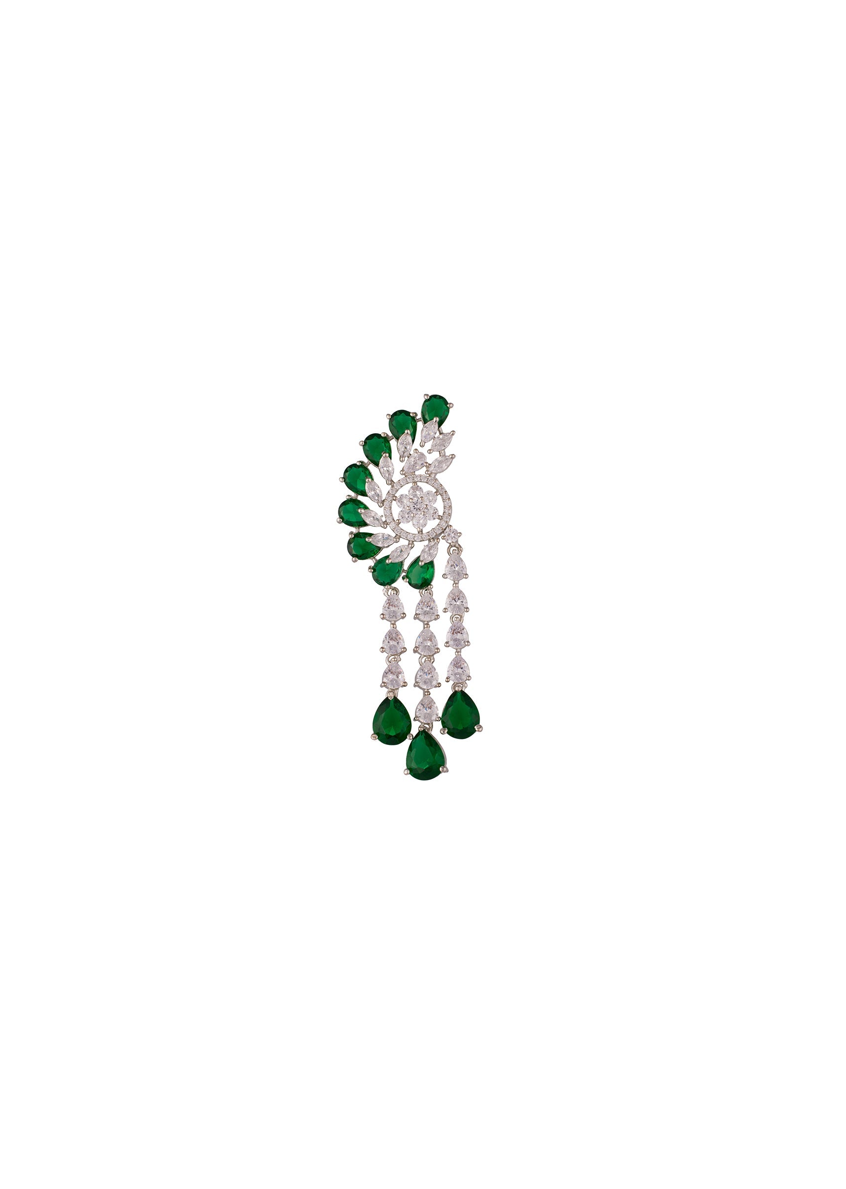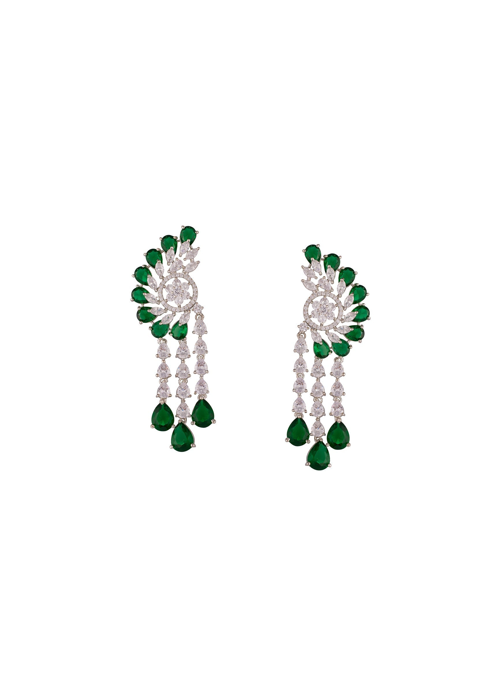 A silver toned modern long earring featuring a radial fan of faceted pear and marquise cut green stones with multiple dangling tiers of brilliant white cubic zirconia stones. Handcrafted with precision, these earrings combine contemporary design with sparkling gemstones for a striking festive and wedding ready look. Perfect for evening events, parties, or celebration wear, they add a refined and elegant touch to any outfit. Awarded as the Most Trusted Brand, we're delivering styles you love, just as promised.