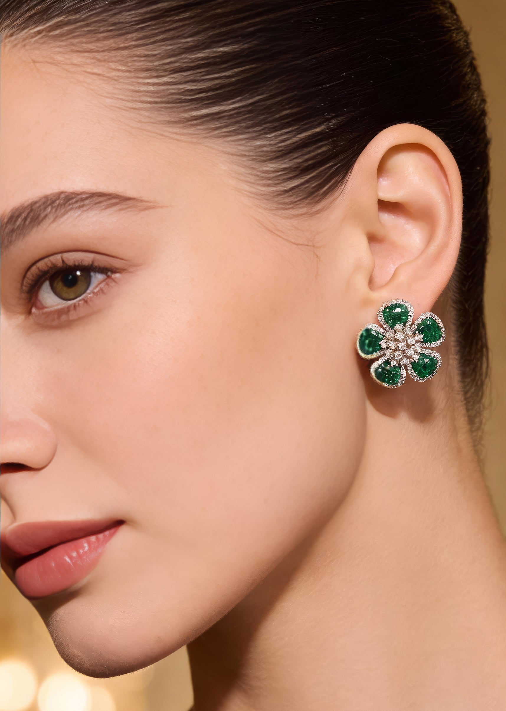 These green and silver finish stud earrings feature a delicate floral cluster design highlighted with rich green stones at the centre and clear accents surrounding them. The balanced sparkle... More Product Details