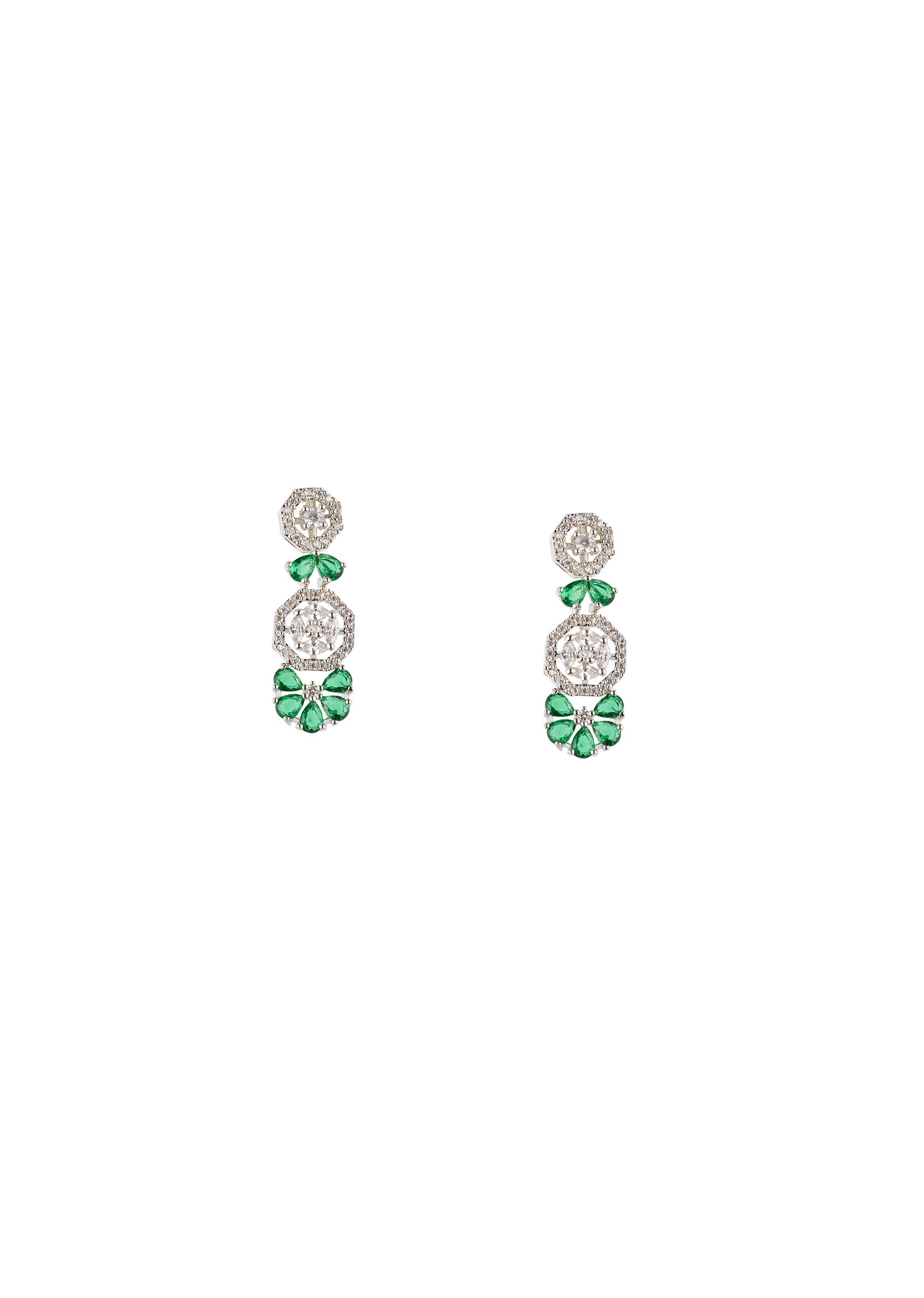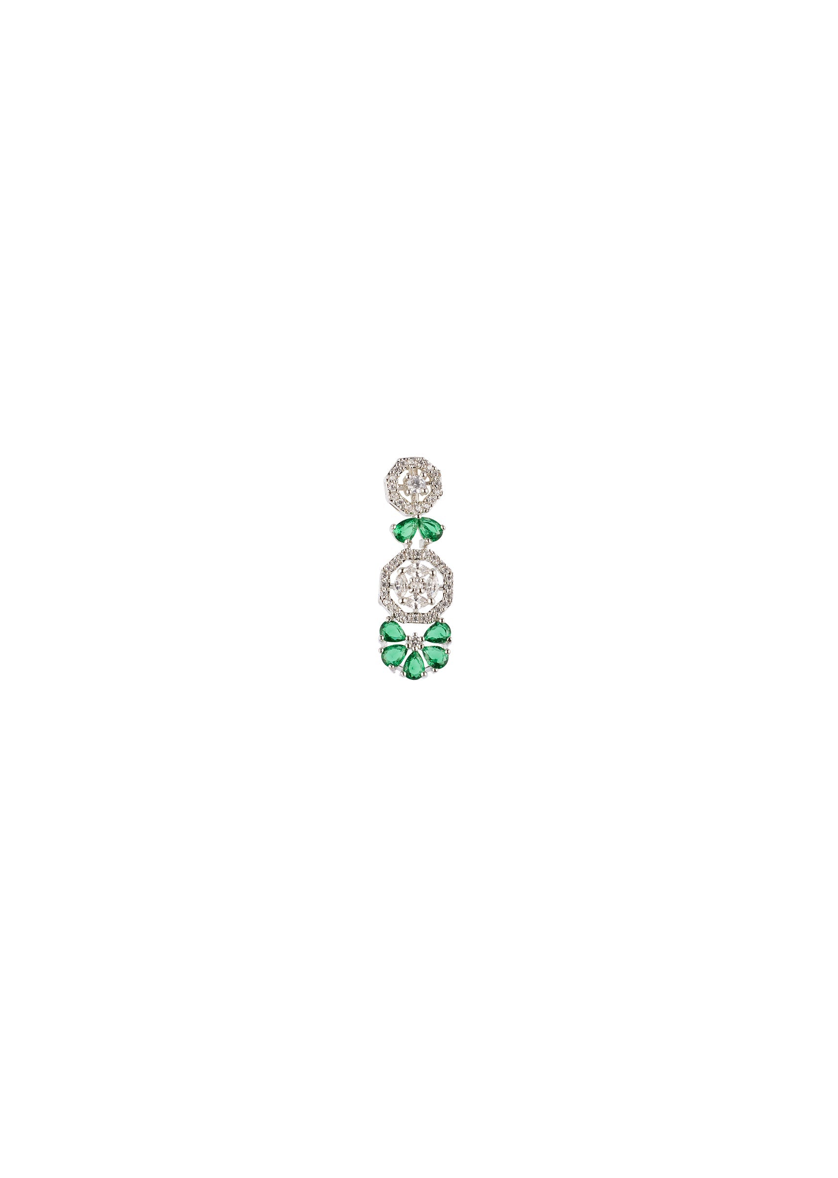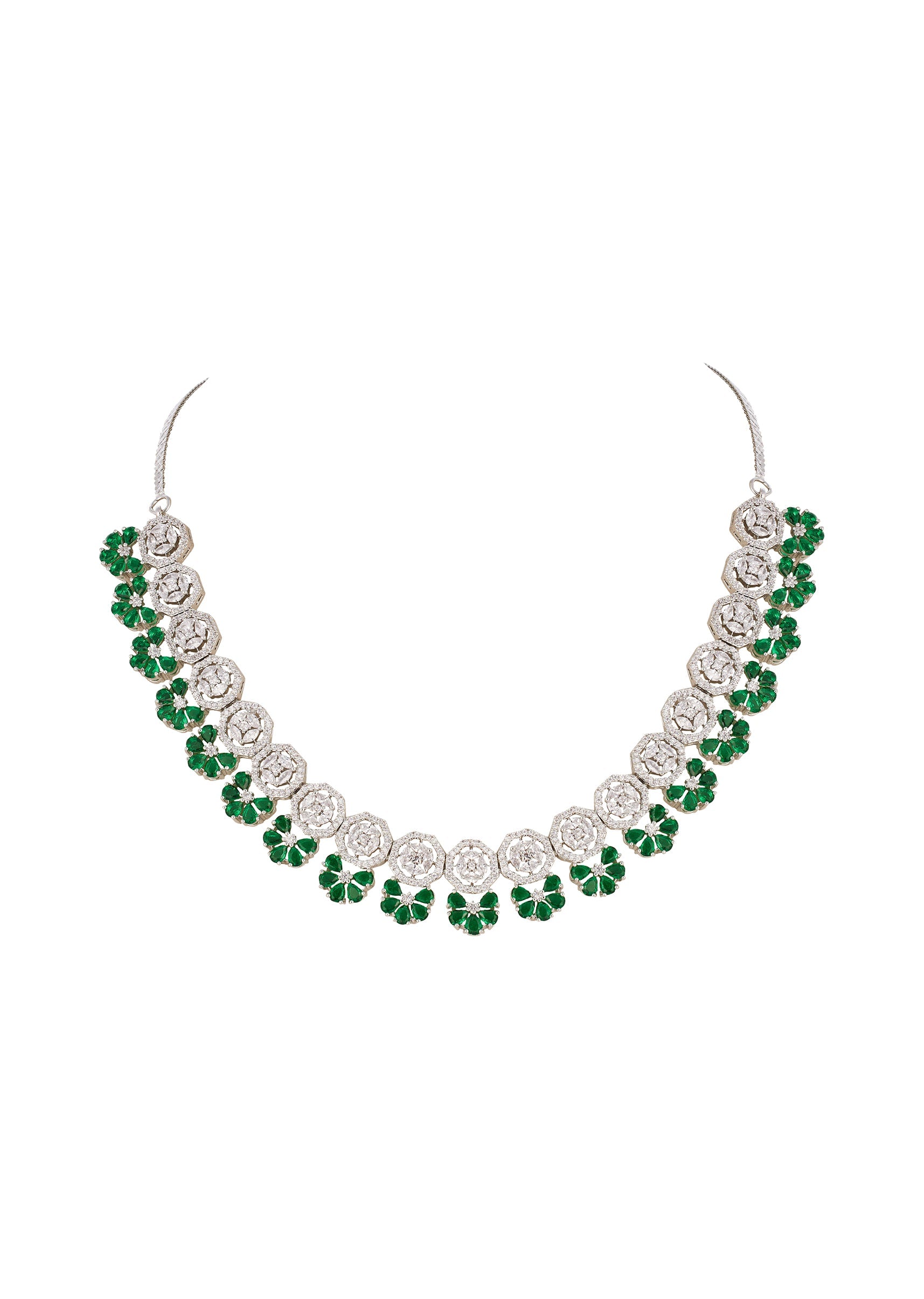 Silver Finish Necklace Set In Mix Metal With Elegant Floral Style And Green Simulated Emerald And Cubic Zirconia Accents