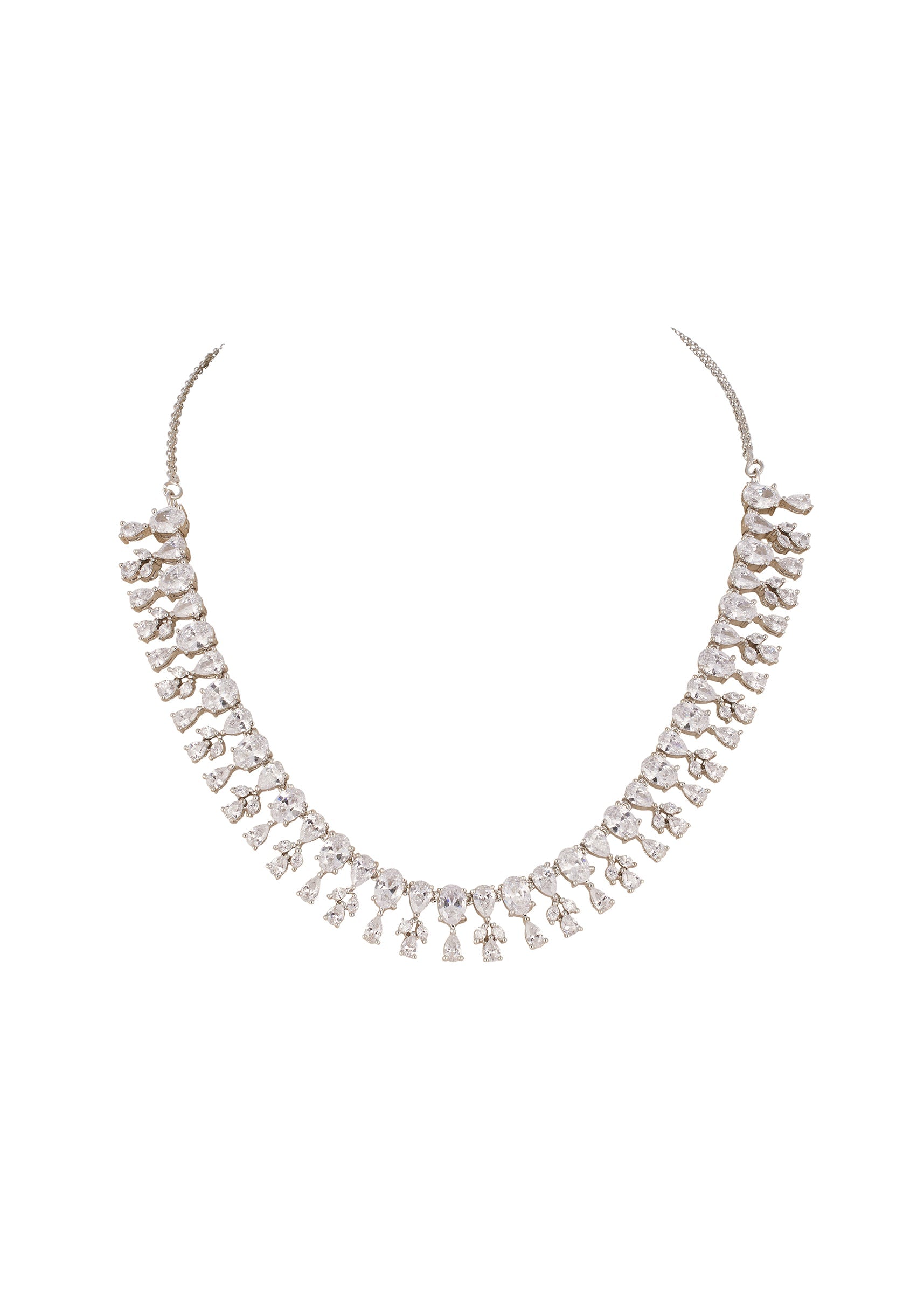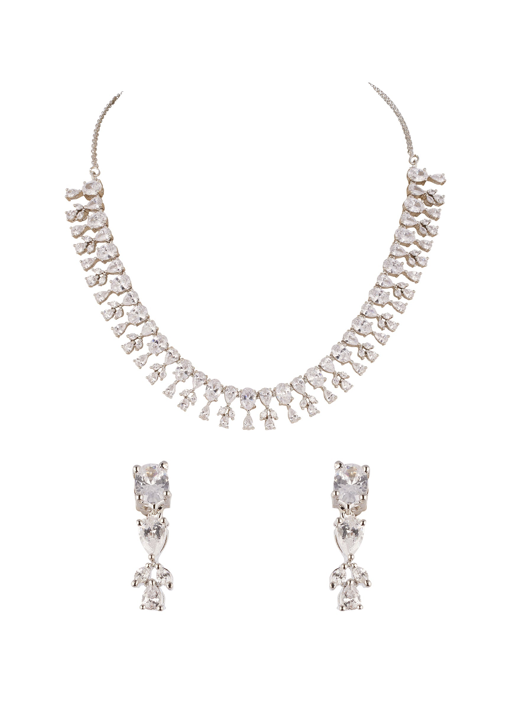 This modern silver finish necklace set features a sleek fringe inspired design detailed with cubic zirconia. The cascading elements create graceful movement while maintaining a clean and contemporary aesthetic, making it a versatile choice for festive occasions and evening wear.