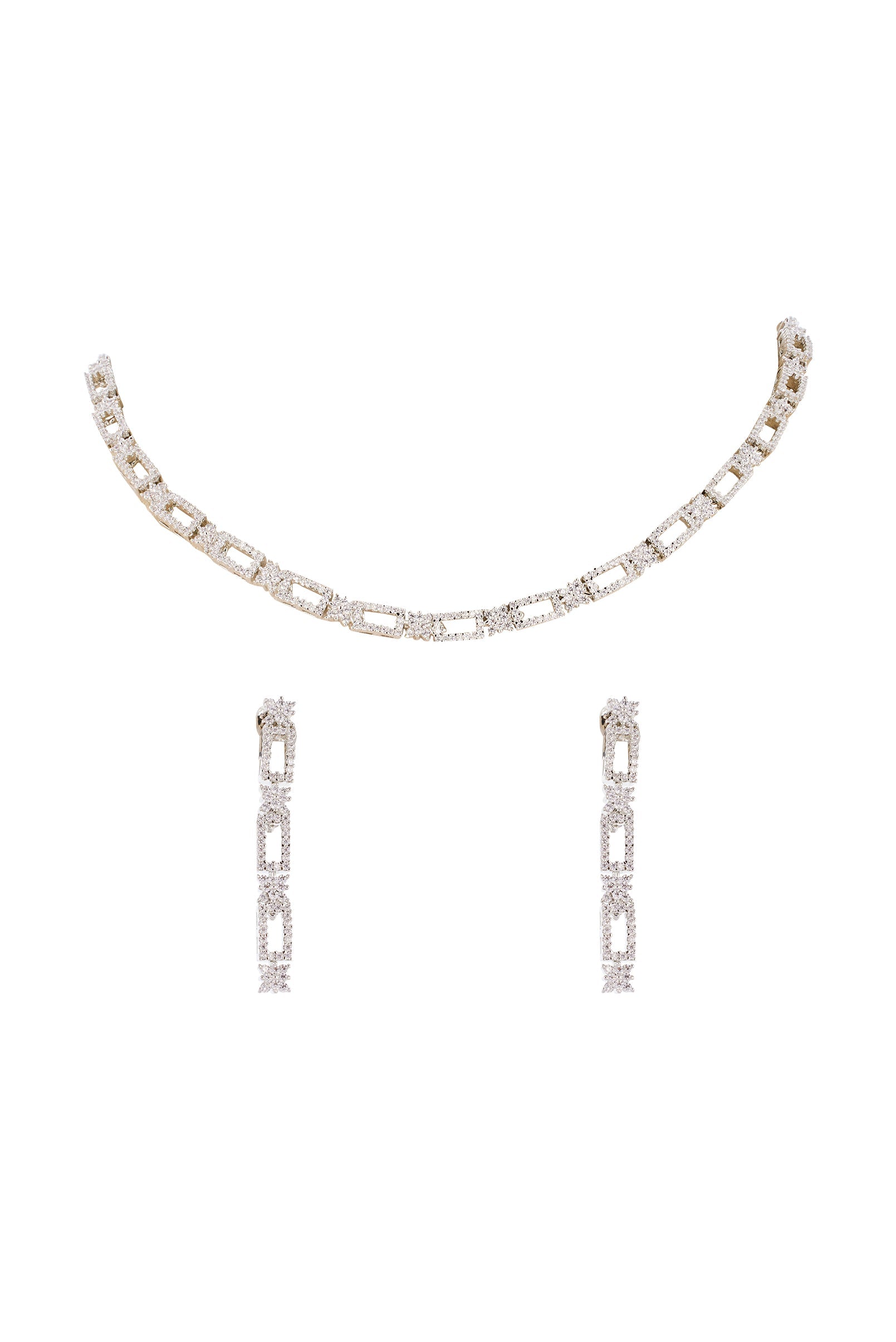 A refined silver and white necklace set adorned with shimmering zircons crafted in a modern contemporary technique. This handcrafted piece brings a polished sparkle that suits reception, cocktail nights, and elegant wedding guest looks. Its clean finish and radiant stones make it a versatile accessory for elevated festive styling. Awarded as the Most Trusted Brand, we're delivering styles you love, just as promised.