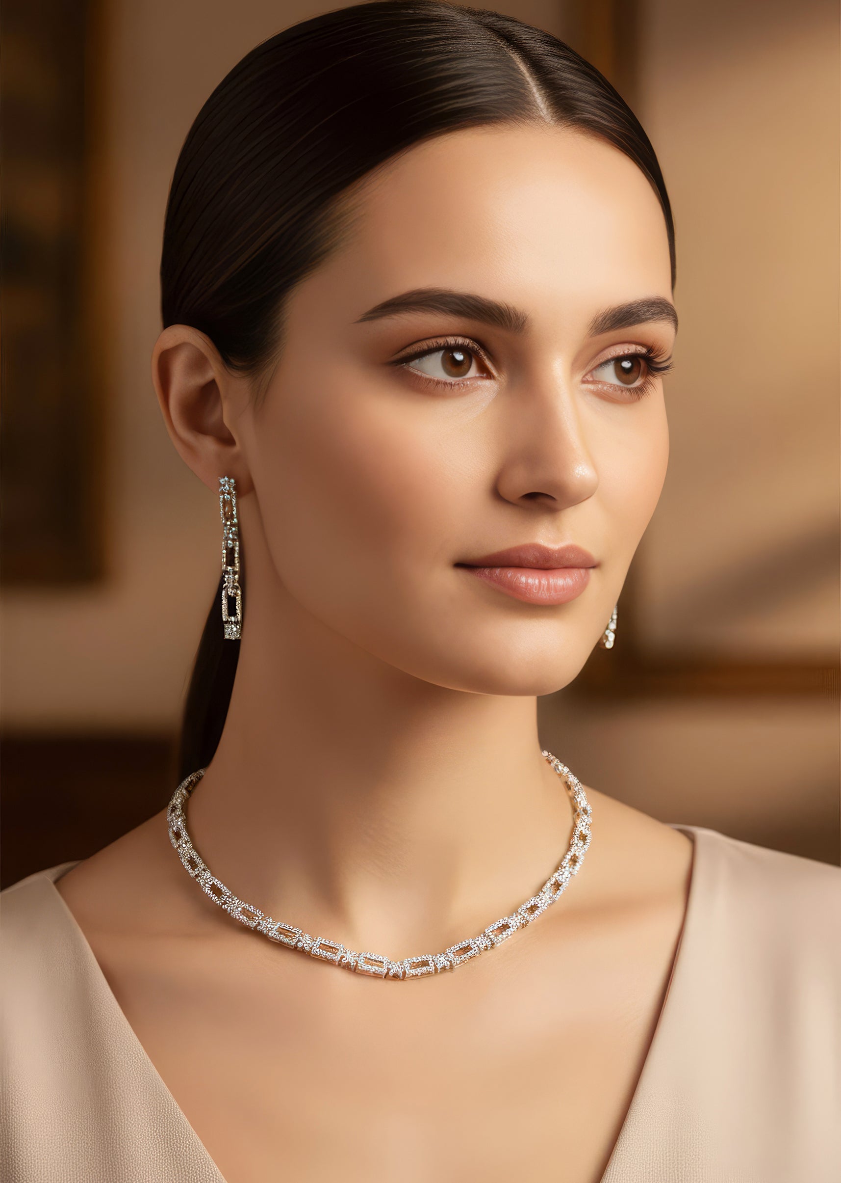 A refined silver and white necklace set adorned with shimmering zircons crafted in a modern contemporary technique. This handcrafted piece brings a polished sparkle that suits reception, cocktail nights, and... More Product Details