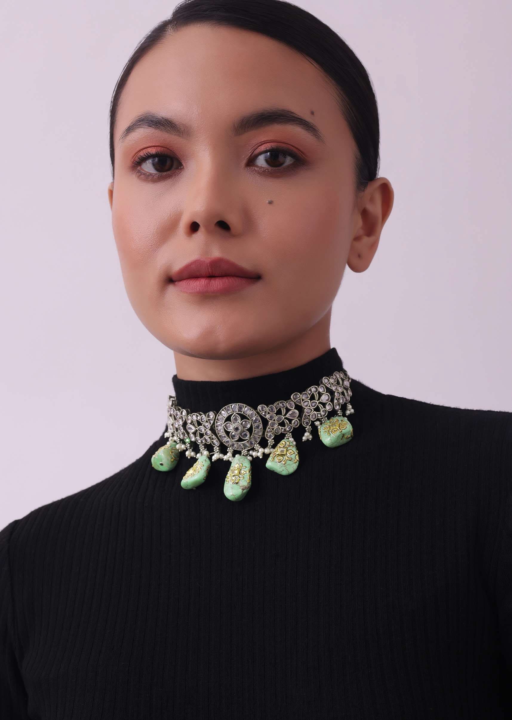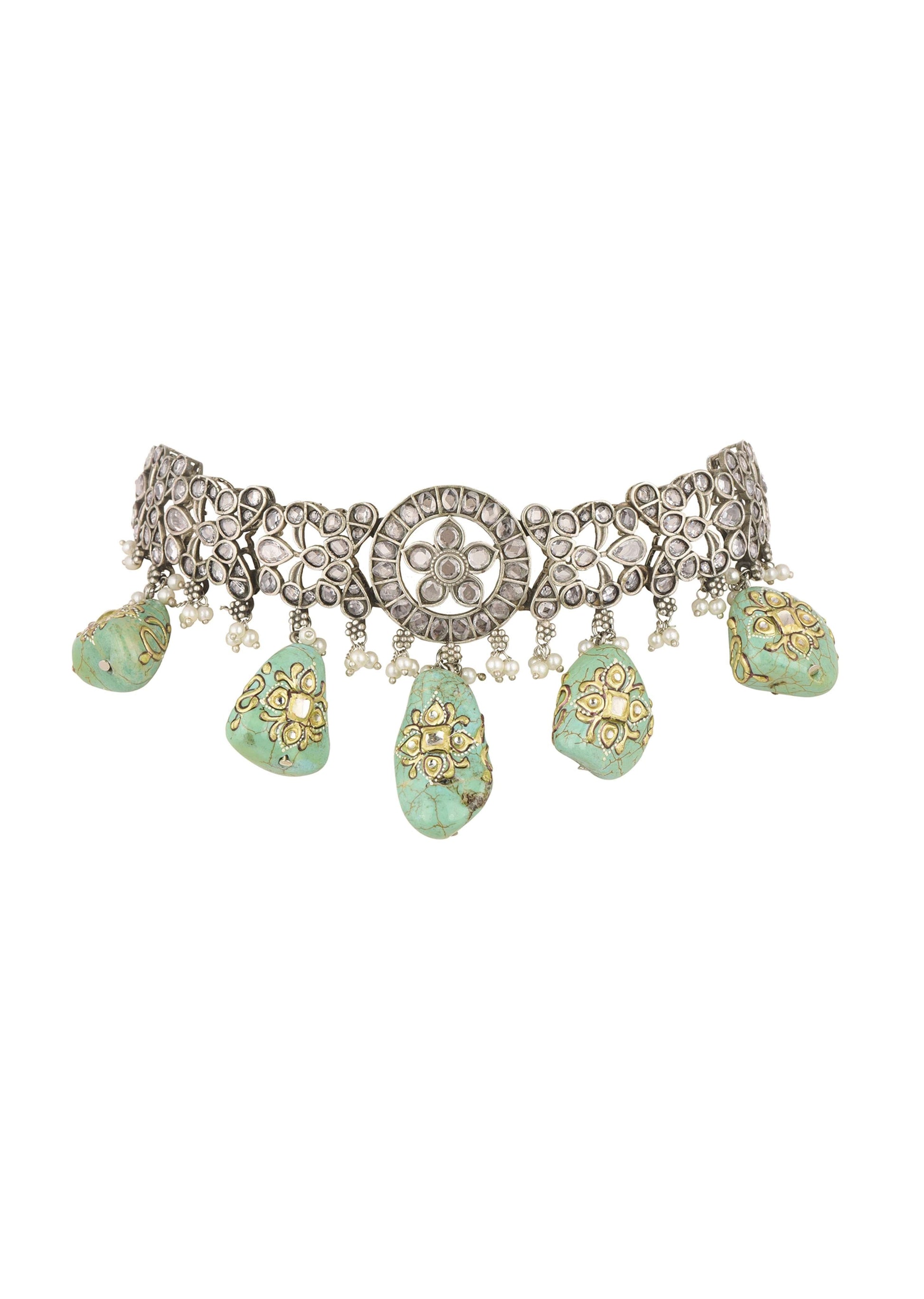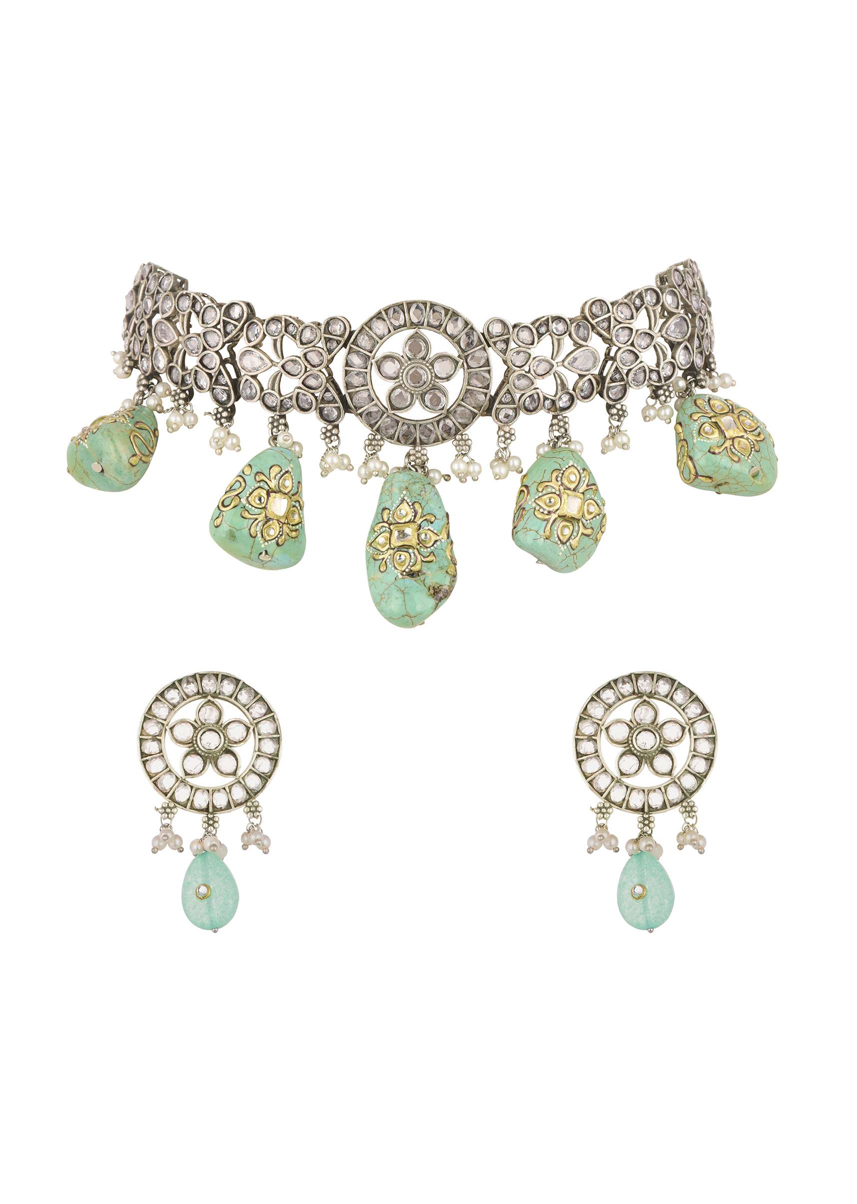 Elevate your style with our oxidised necklace set adorned with exquisite aqua blue engraved stones. Crafted with attention to detail the choker and earrings exude elegance and sophistication.EVENT - Perfect... More Product Details
