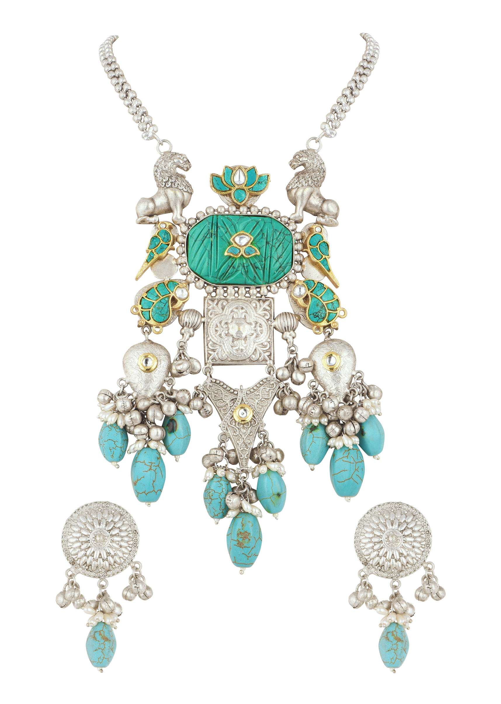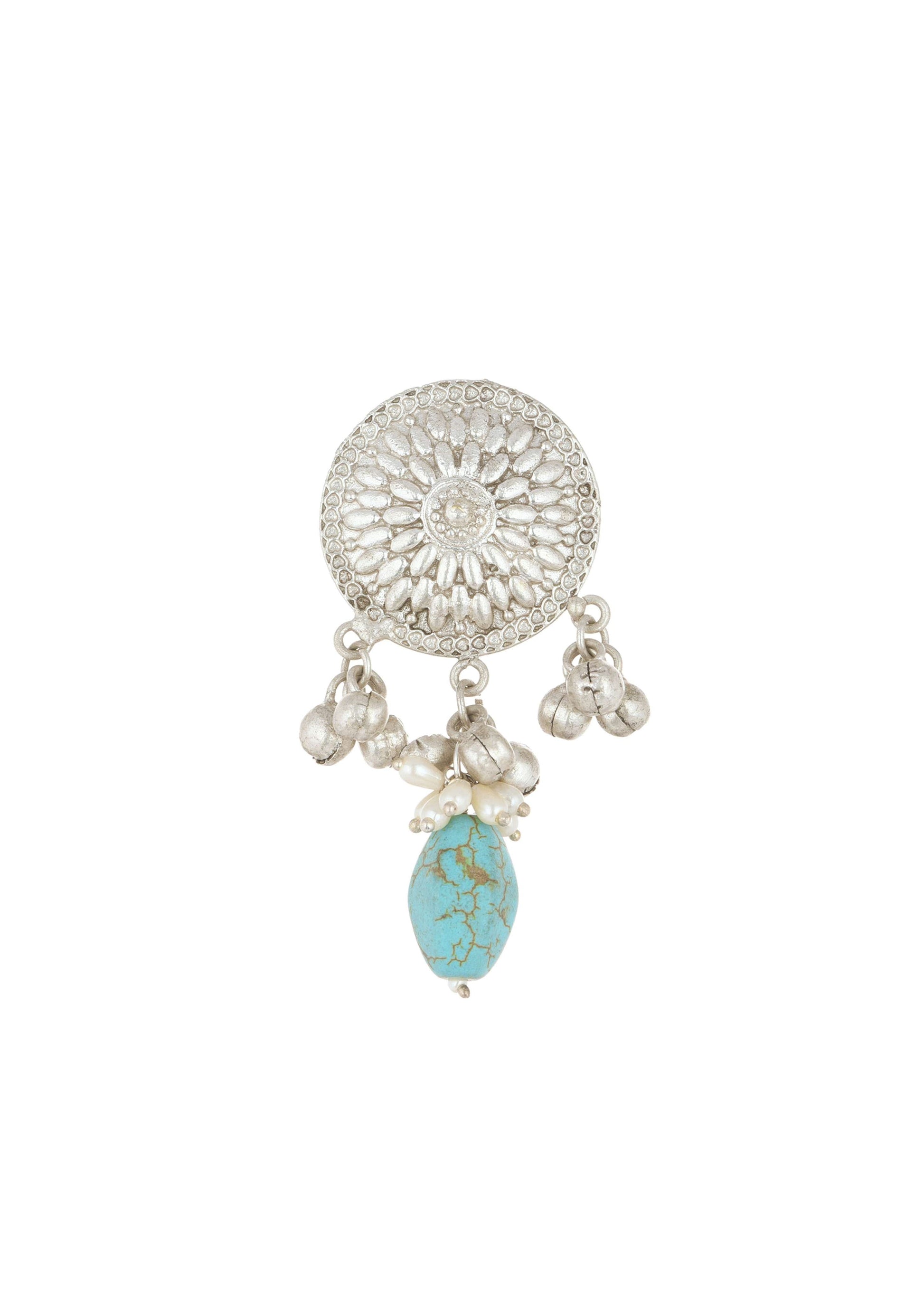 Experience the enchantment of our silver finish oxidised choker and earring set. Infused with mesmerizing blue toned kundan work and beads this versatile ensemble seamlessly blends traditional and contemporary styles.... More Product Details