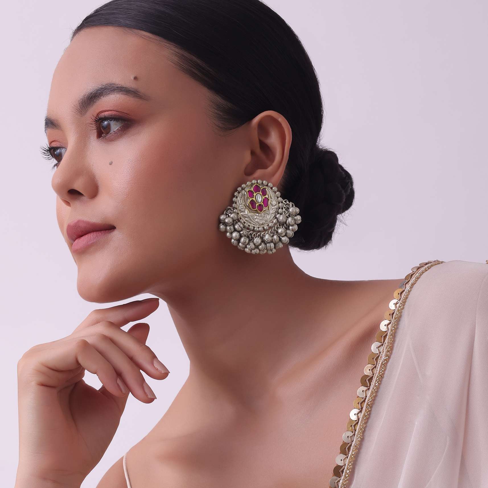 Indulge in opulence with our exquisite silver finish oxidised studs in fusion style. The red-toned meenakari work beautifully enhances their allure. These studs are meticulously crafted to perfection.EVENT - Ideal for day and evening weddings sangeet and engagement parties.Store in a dust bag. Keep away from moisture perfume alcohol and harsh chemicals. Spot clean only. Keep away from sharp objects. Actual color may slightly vary due to photographic lighting sources and device screen settings. Awarded as the Most Trusted Brand, we're delivering styles you love, just as promised.