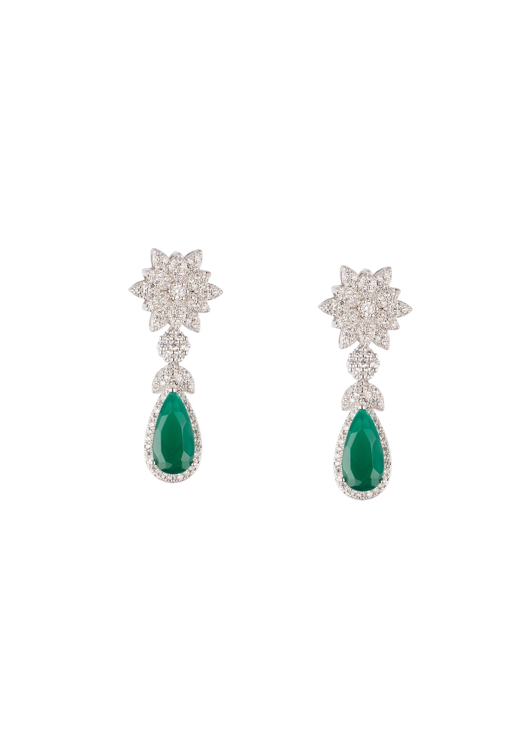 Pair them with an evening saree, lehenga, or gown in complementary jewel tones to highlight the green emerald drop.
